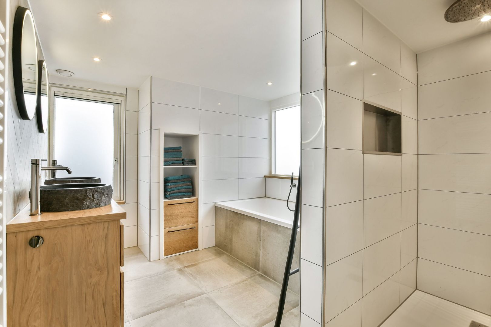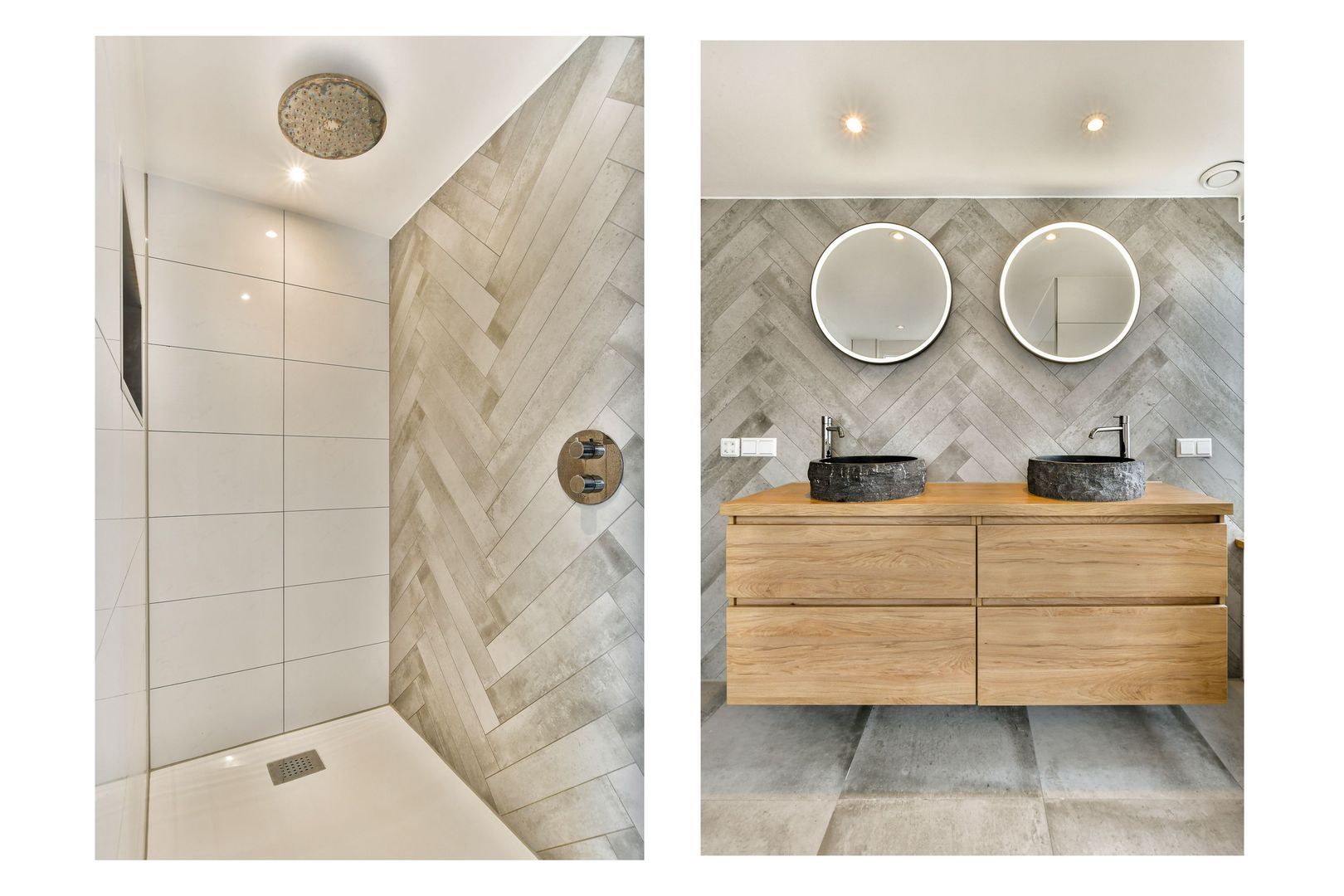 De badkamer is stijlvol vormgegeven en uitgerust met een ligbad, douche, dubbele wastafel en praktische inbouwkast.