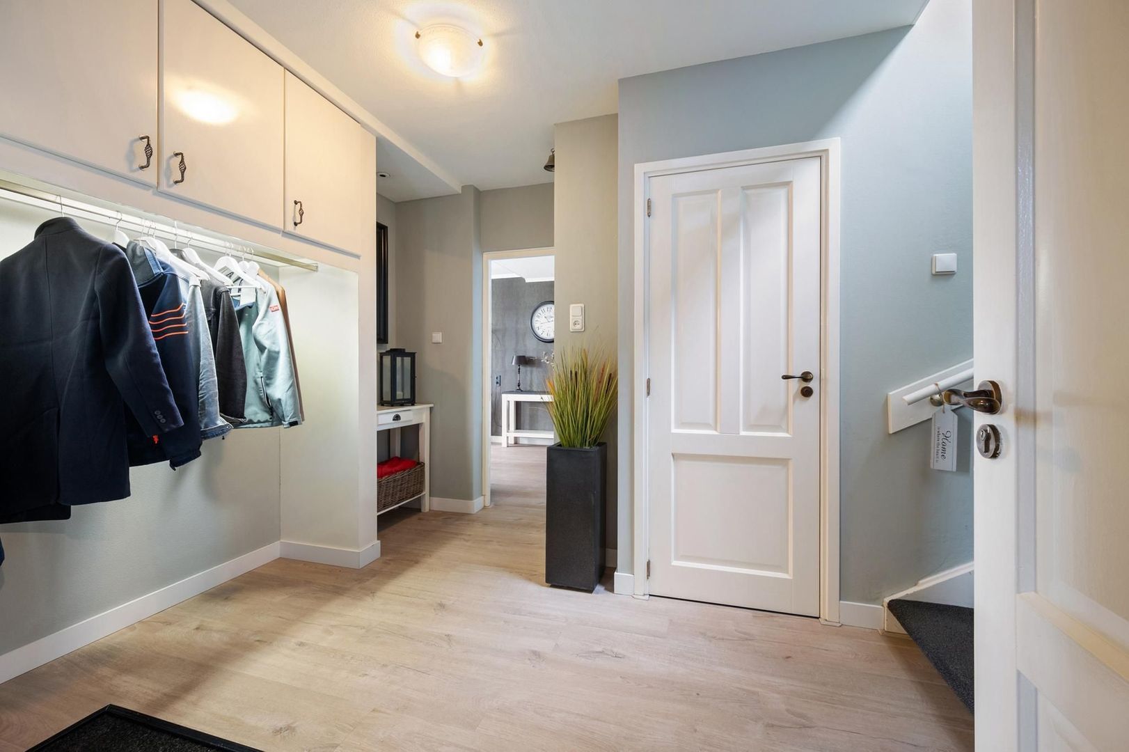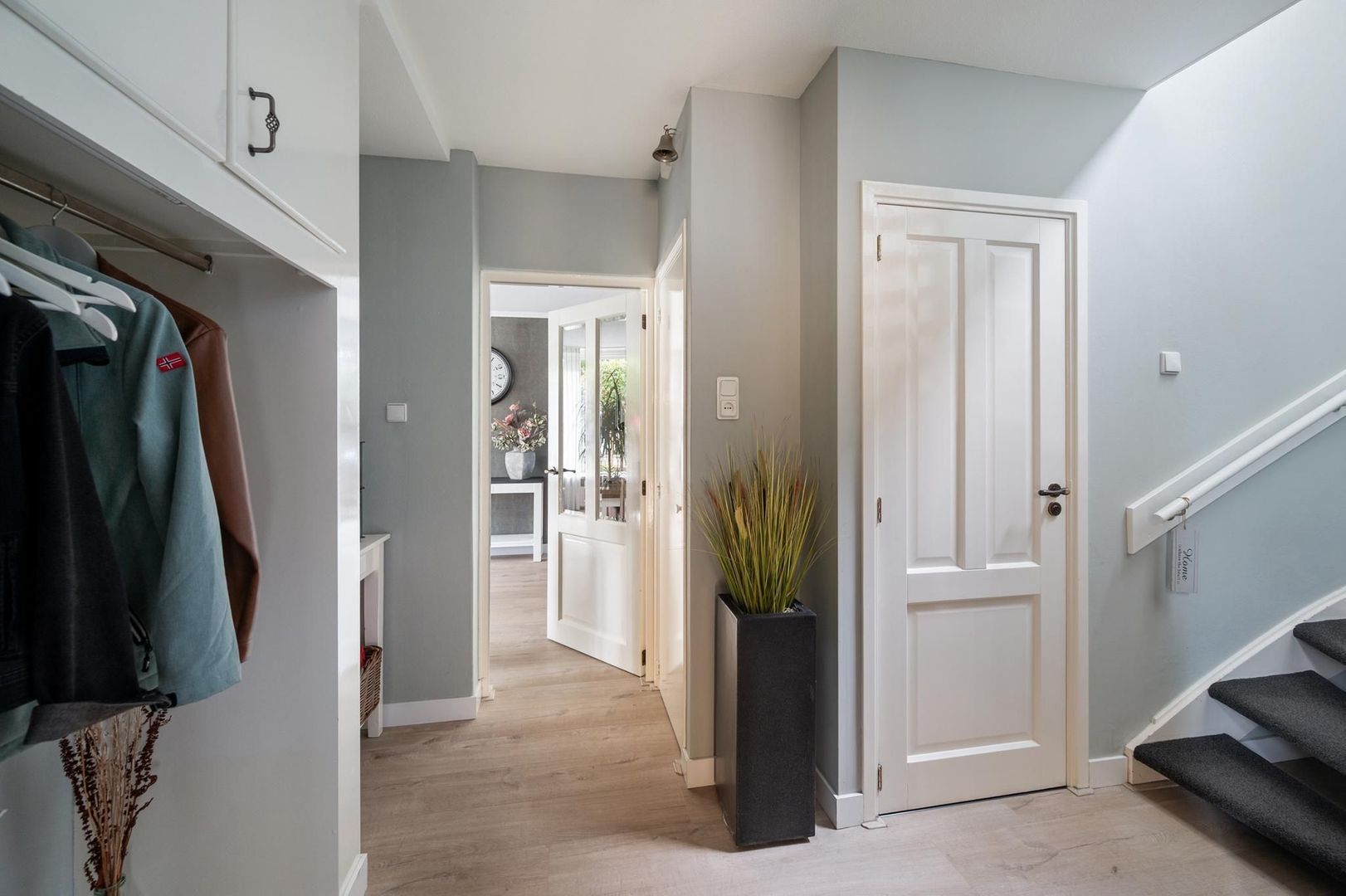 Entree woning, ruime ontvangsthal met toilet, meterkast (vernieuwd in 2022 met de komst van de zonnepanelen), garderobekast en trapopgang.