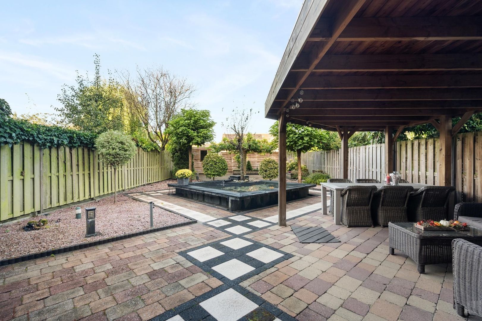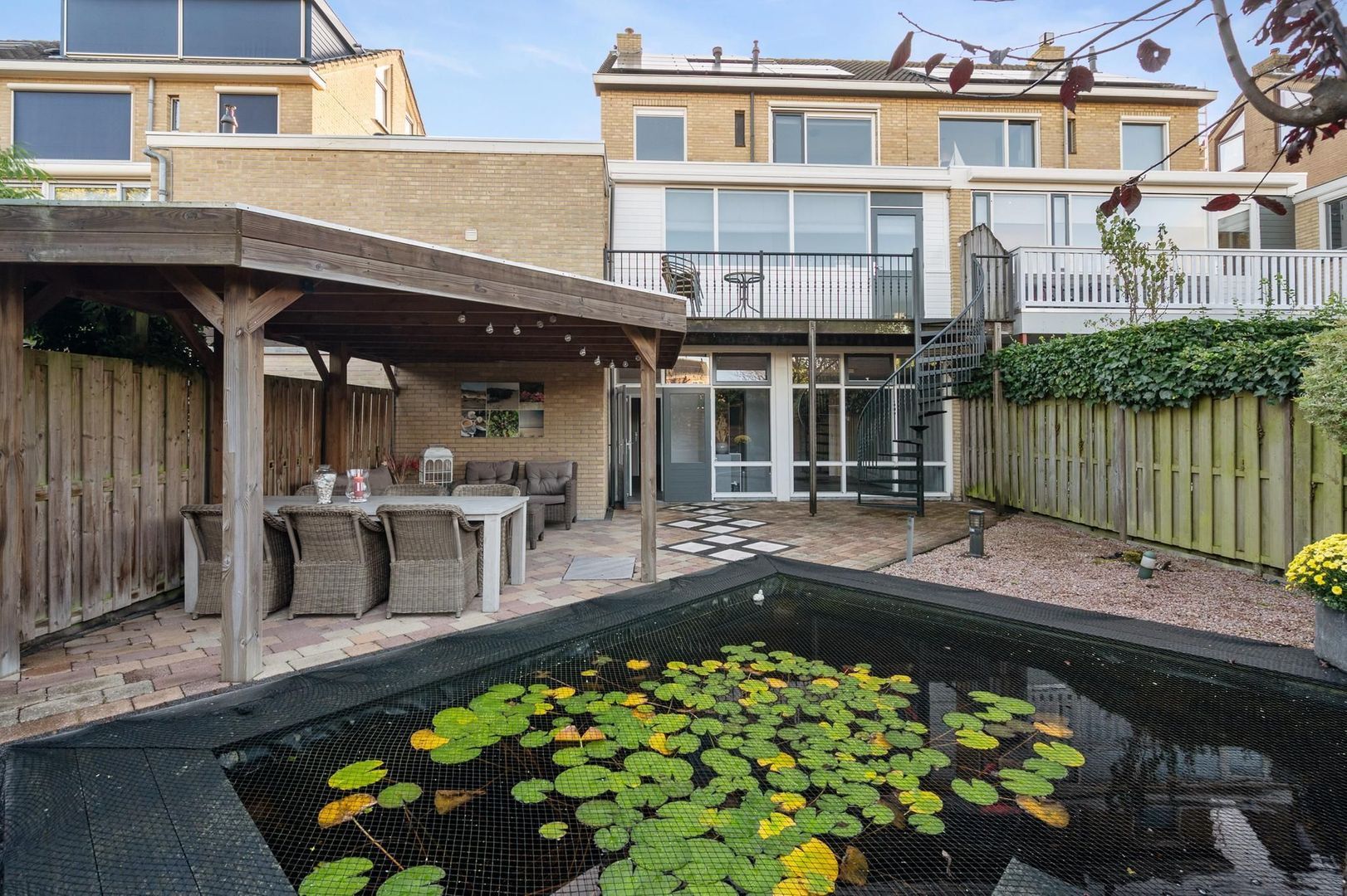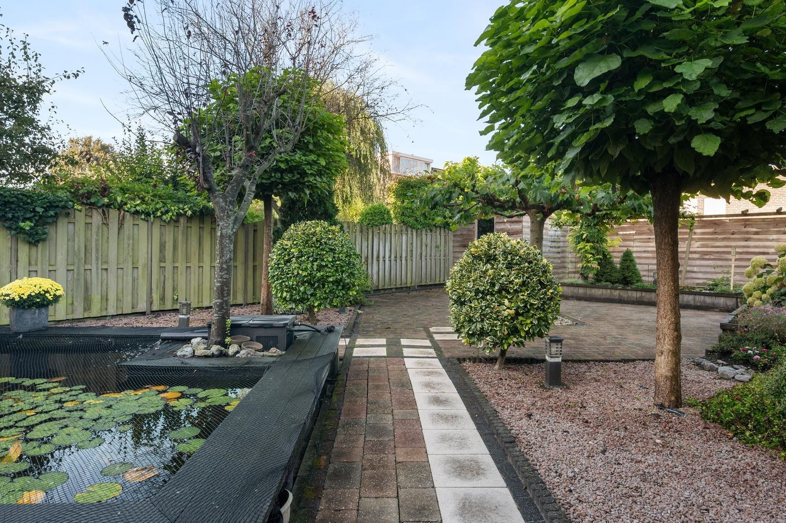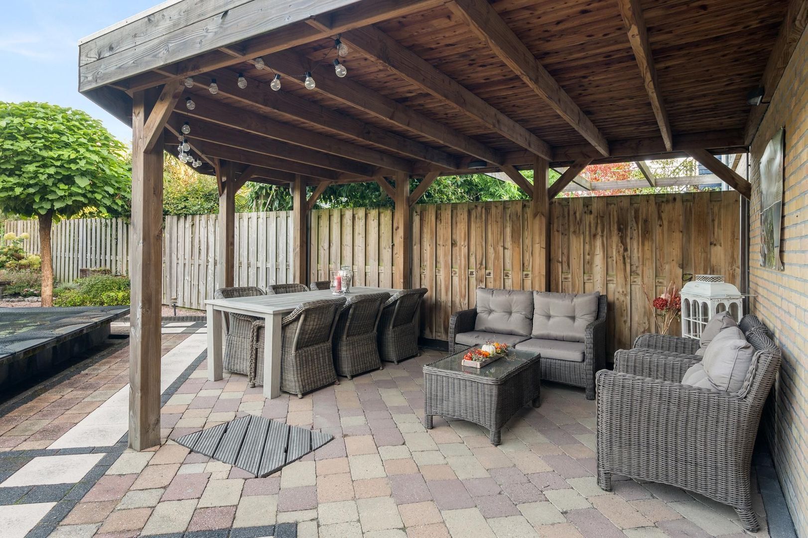 De zonnige achtertuin is grotendeels betegeld en voorzien van diverse beplanting en beschikt over een mooie vijver. Aan het huis is een gezellige houten overkapping gerealiseerd, en achterin de tuin staat een houten schuur. Er is een achteruitgang naar het achterpad. Het balkon op de eerste verdieping (aan de keukenzijde) is via een stalen trap te bereiken.