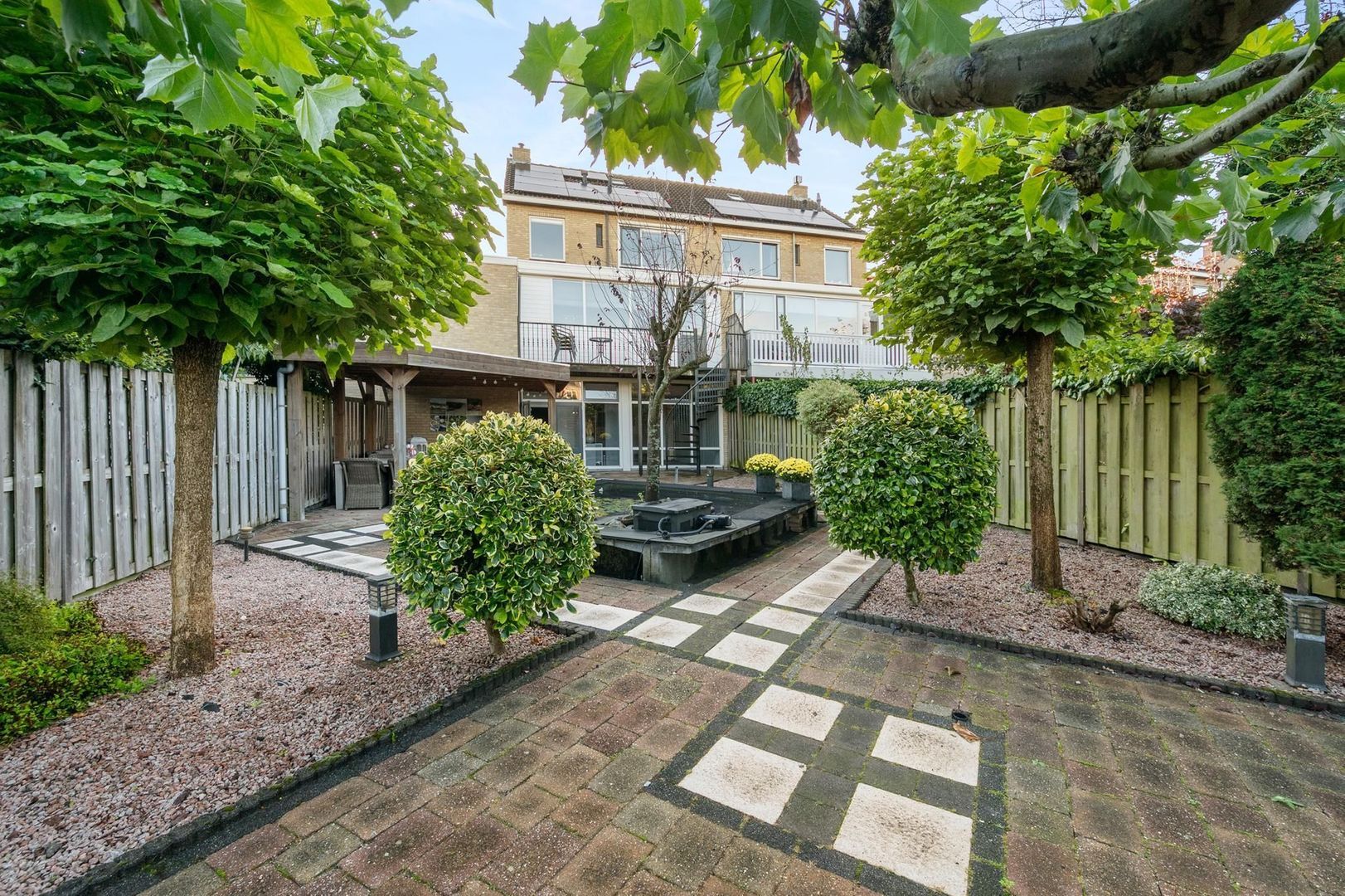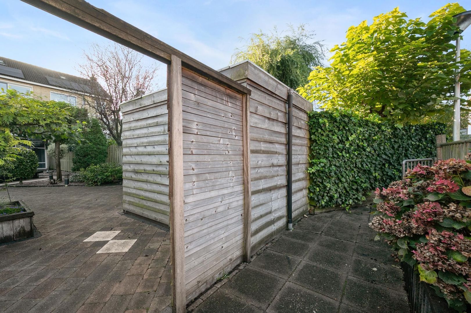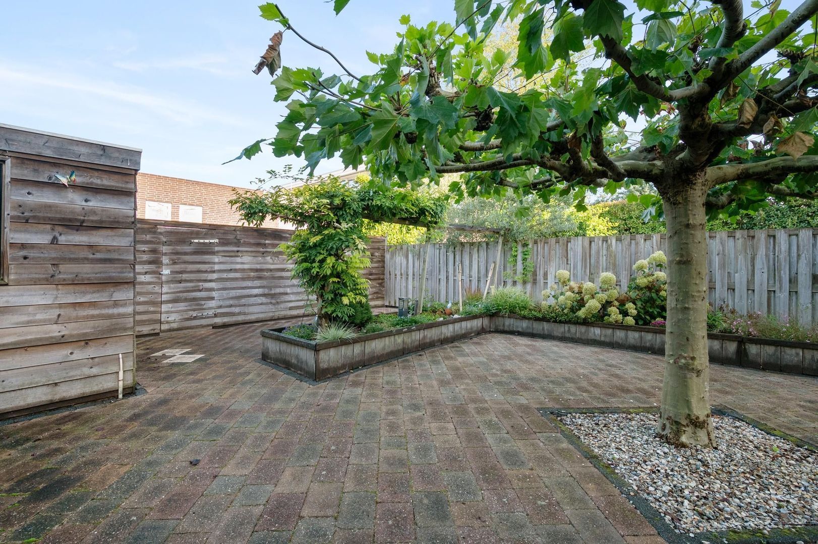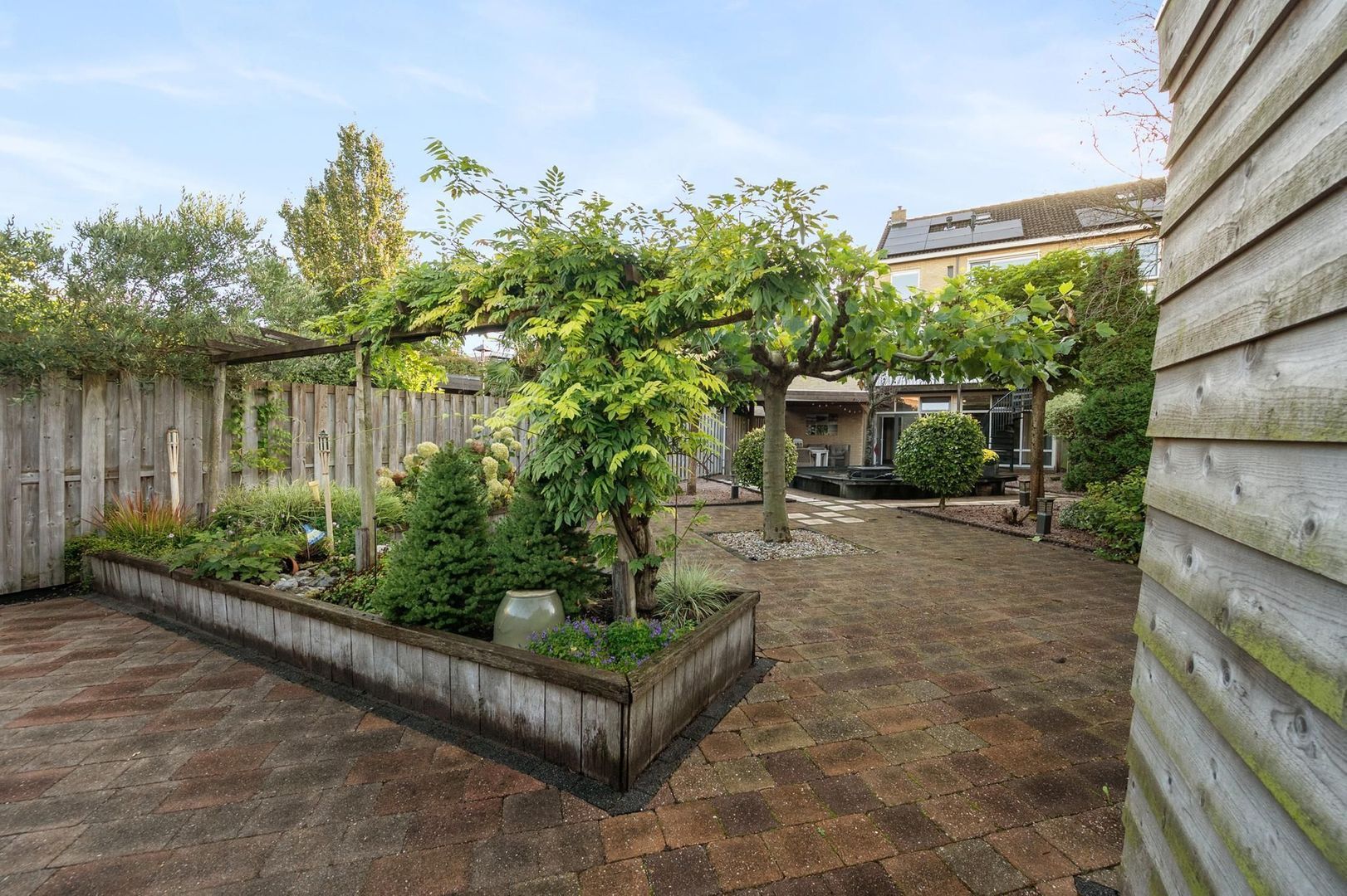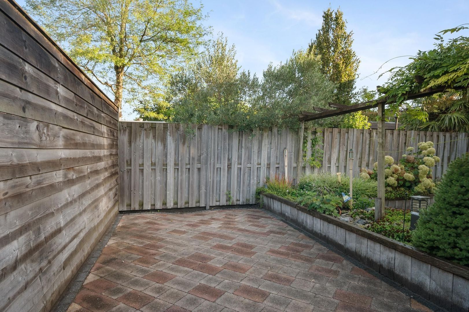 De zonnige achtertuin is grotendeels betegeld en voorzien van diverse beplanting en beschikt over een mooie vijver. Aan het huis is een gezellige houten overkapping gerealiseerd, en achterin de tuin staat een houten schuur. Er is een achteruitgang naar het achterpad. Het balkon op de eerste verdieping (aan de keukenzijde) is via een stalen trap te bereiken.