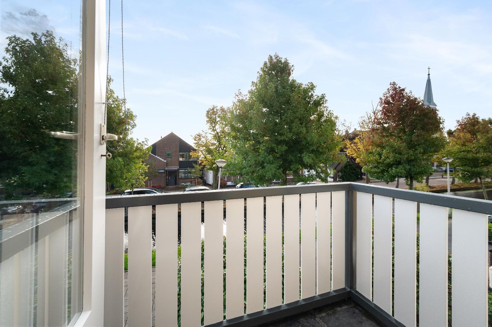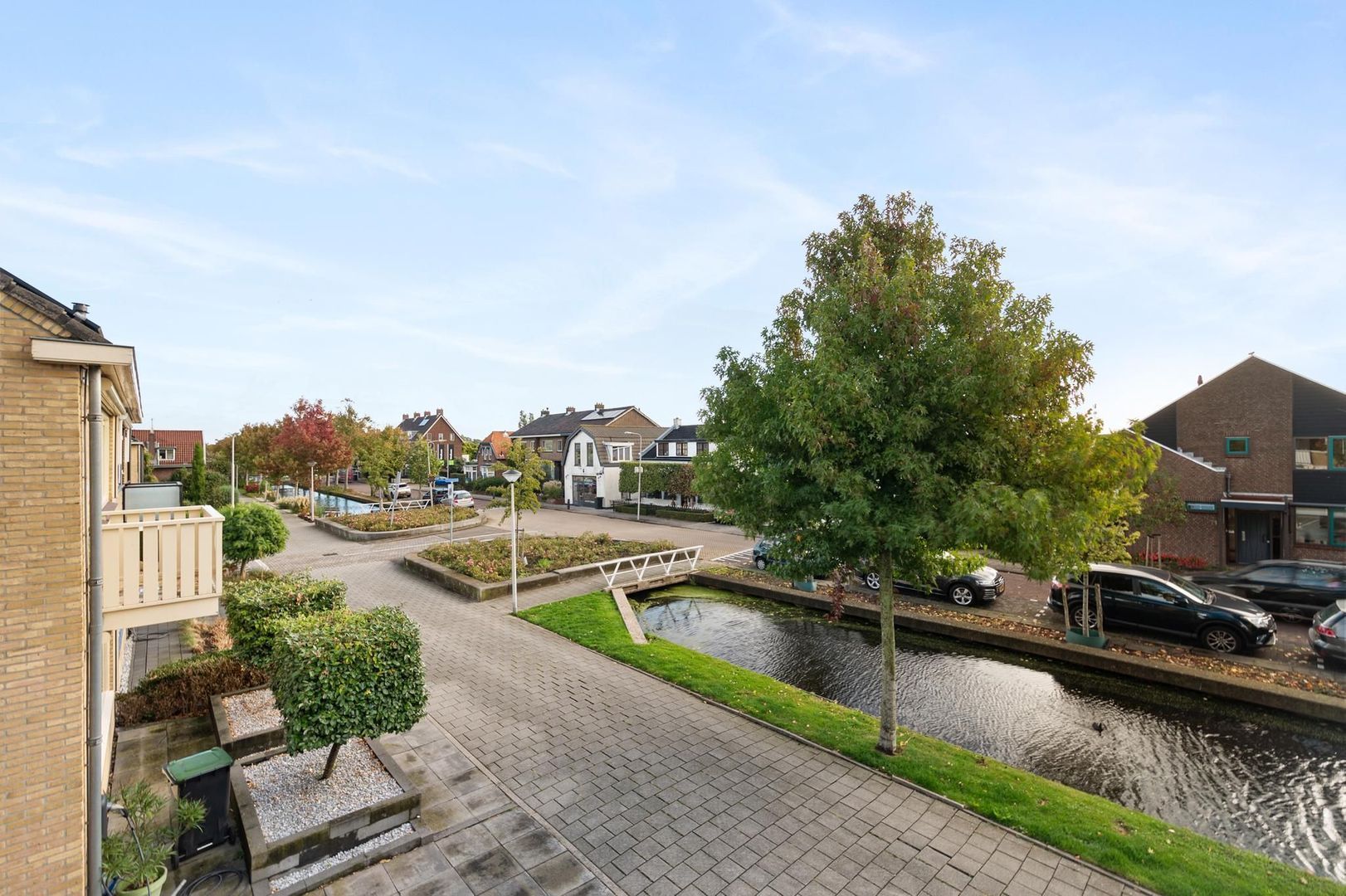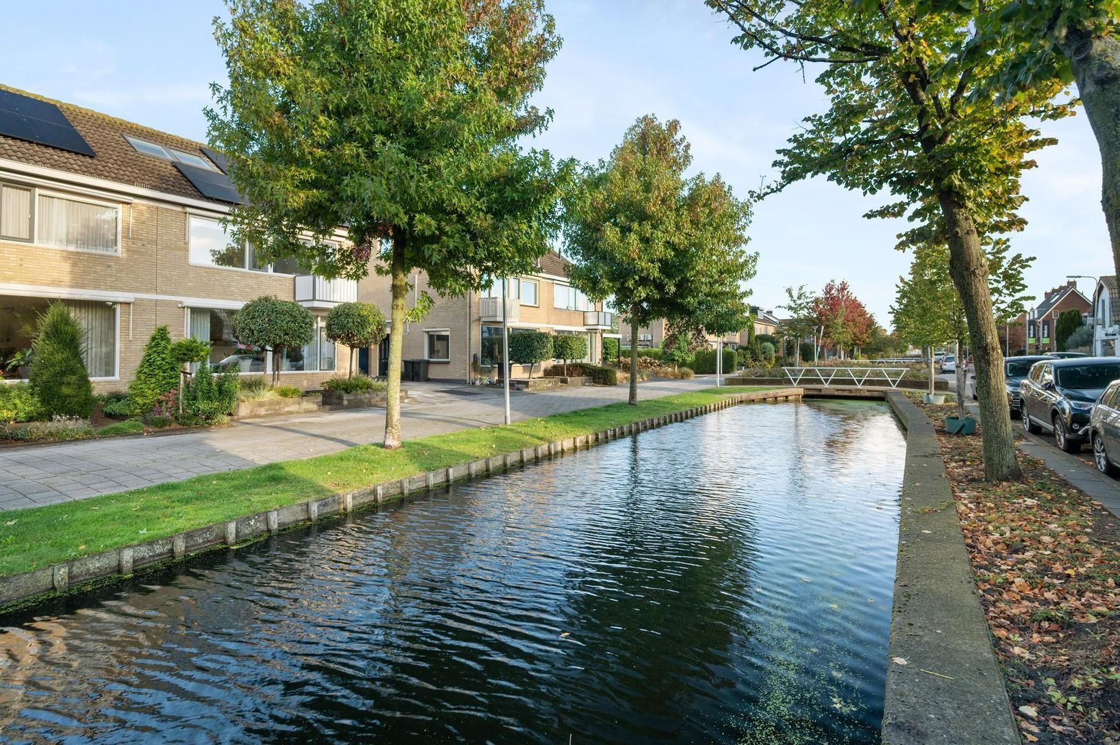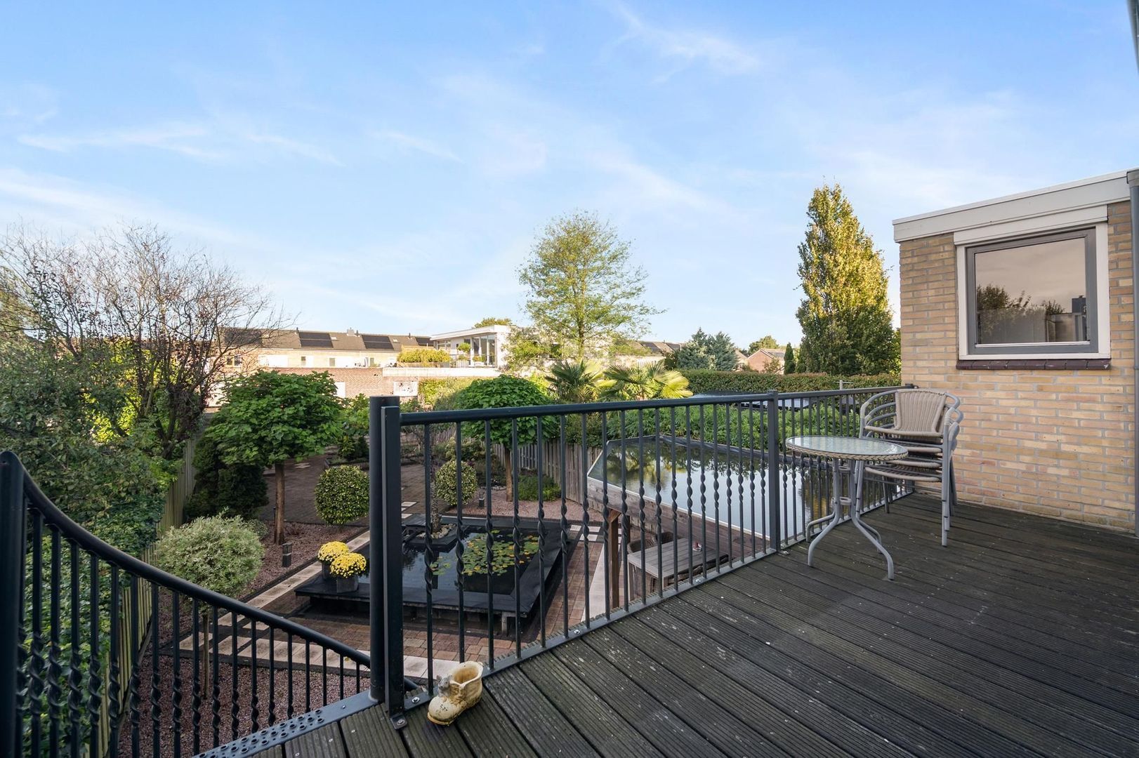 De zonnige achtertuin is grotendeels betegeld en voorzien van diverse beplanting en beschikt over een mooie vijver. Aan het huis is een gezellige houten overkapping gerealiseerd, en achterin de tuin staat een houten schuur. Er is een achteruitgang naar het achterpad. Het balkon op de eerste verdieping (aan de keukenzijde) is via een stalen trap te bereiken.