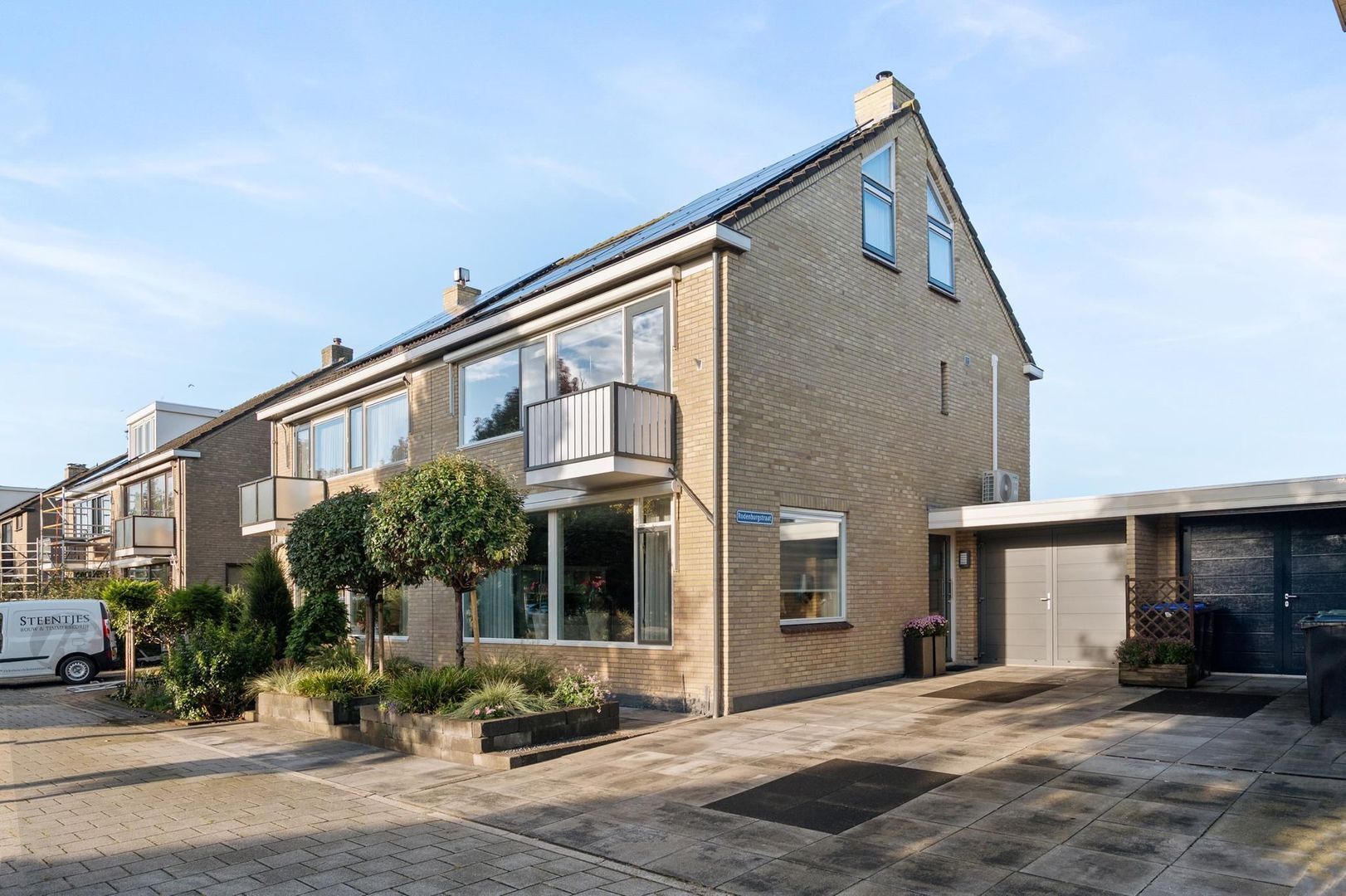 Voortuin met oprit voorzien van een oplaadpunt voor de auto. Dubbele garagedeur naar de garage. Hiervandaan is er toegang tot de hal en het souterrain.