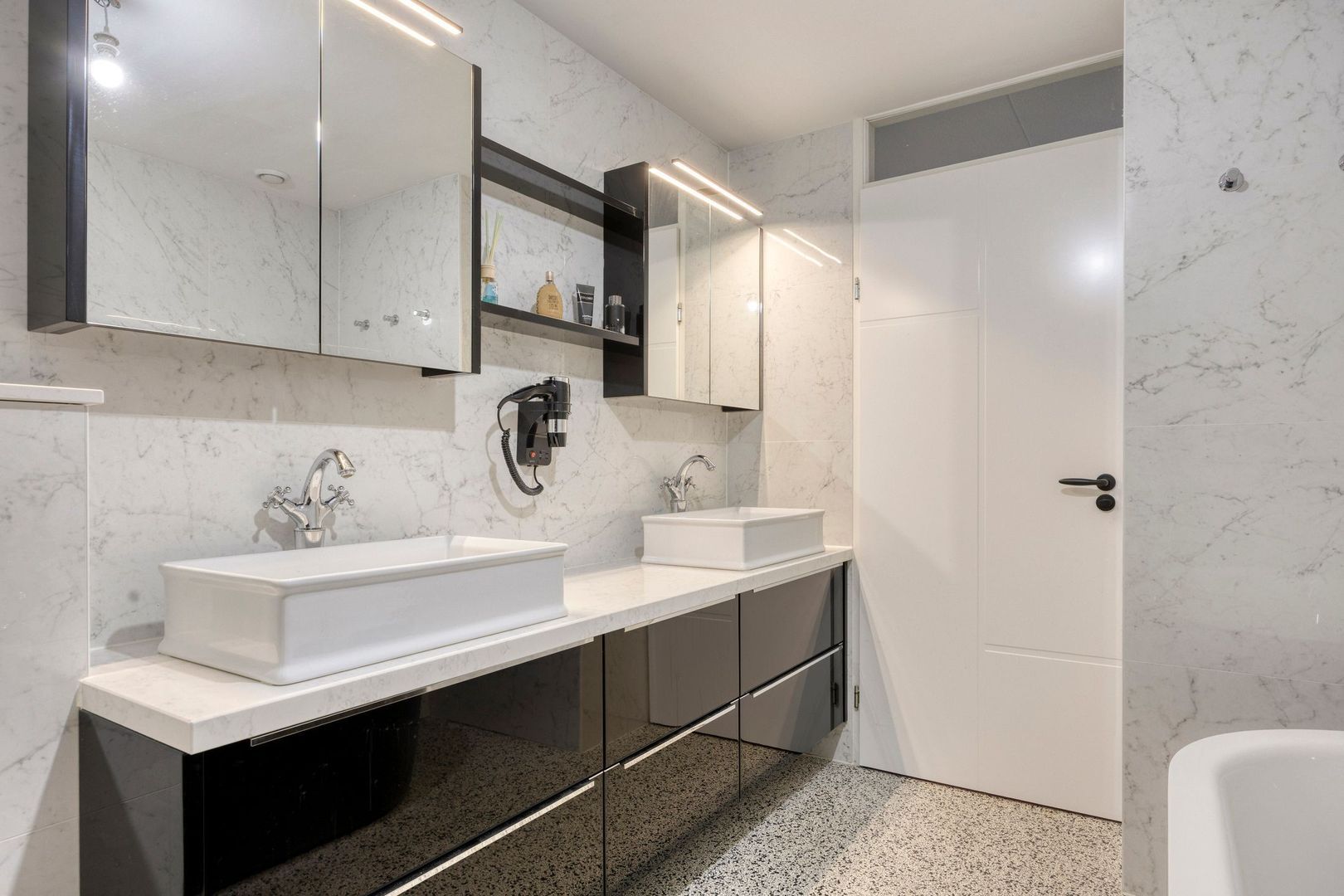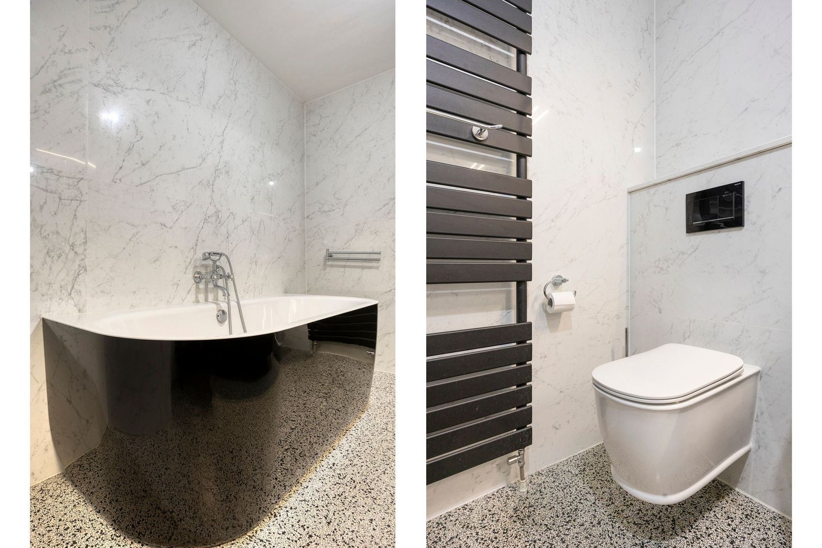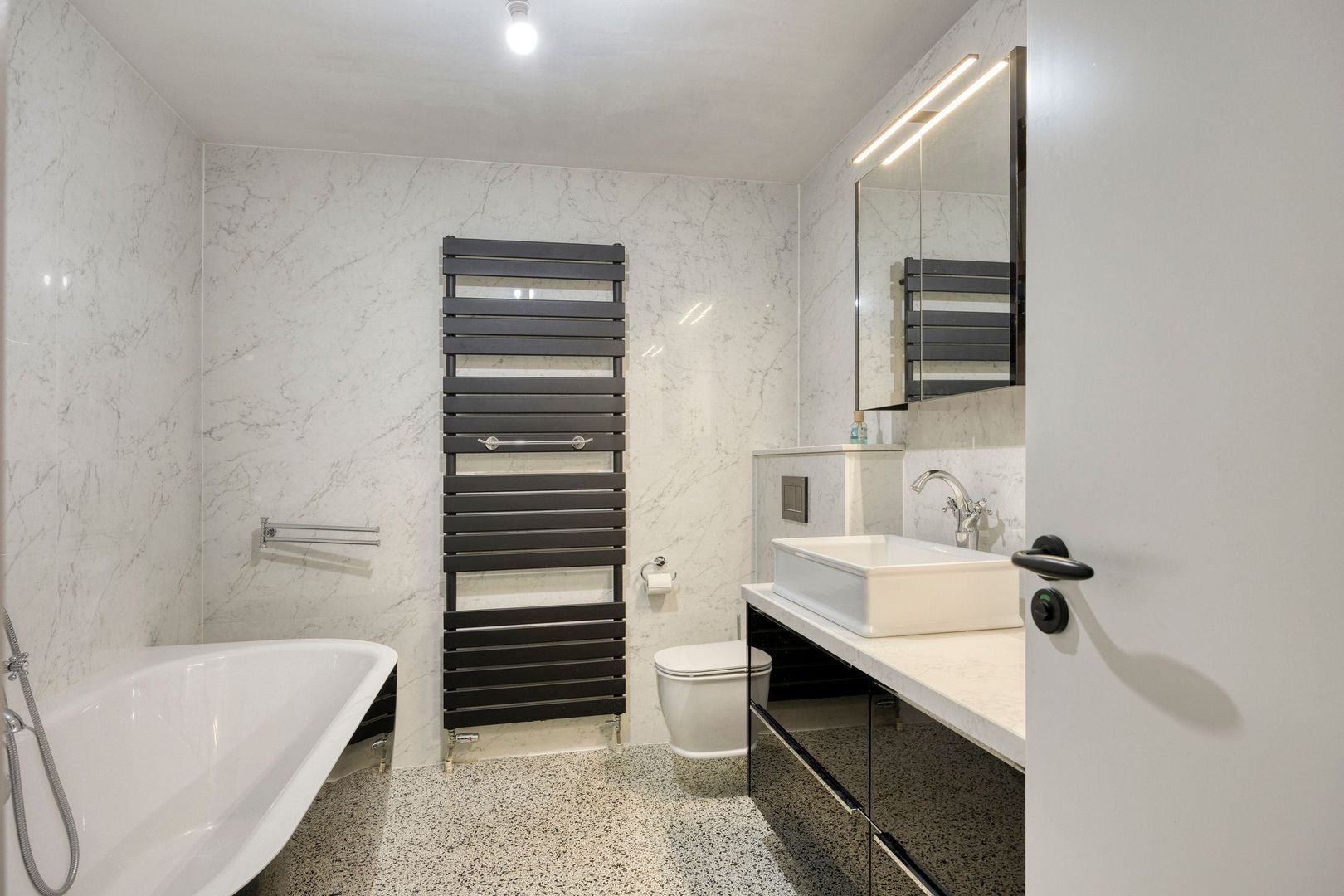De badkamer is uitgerust met een ligbad, dubbele wastafel, tweede toilet en een handdoekradiator.