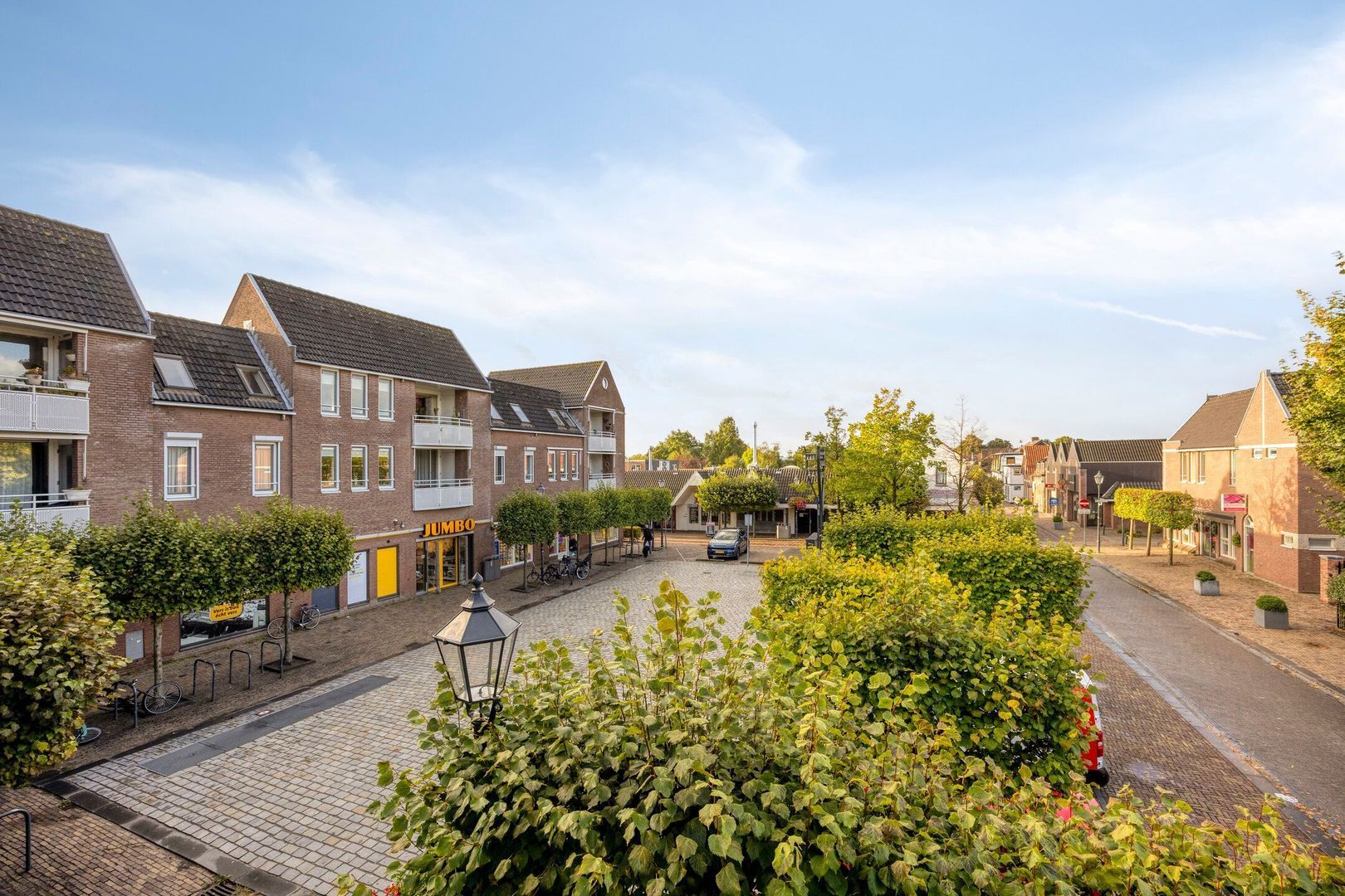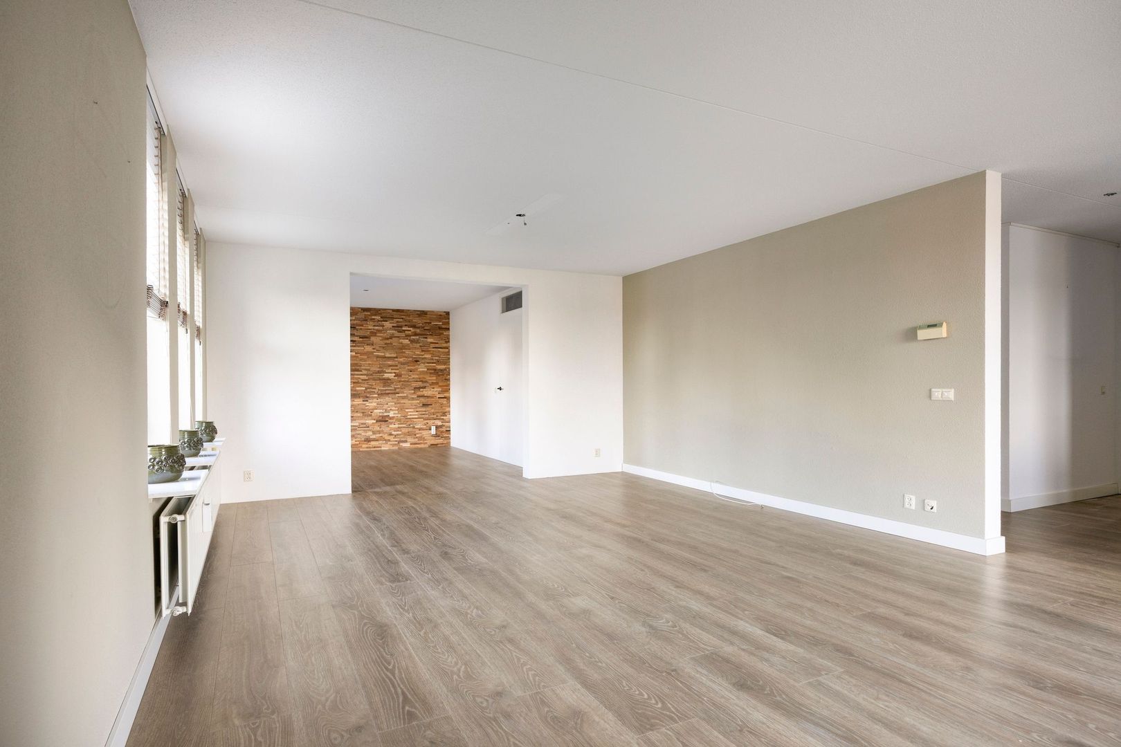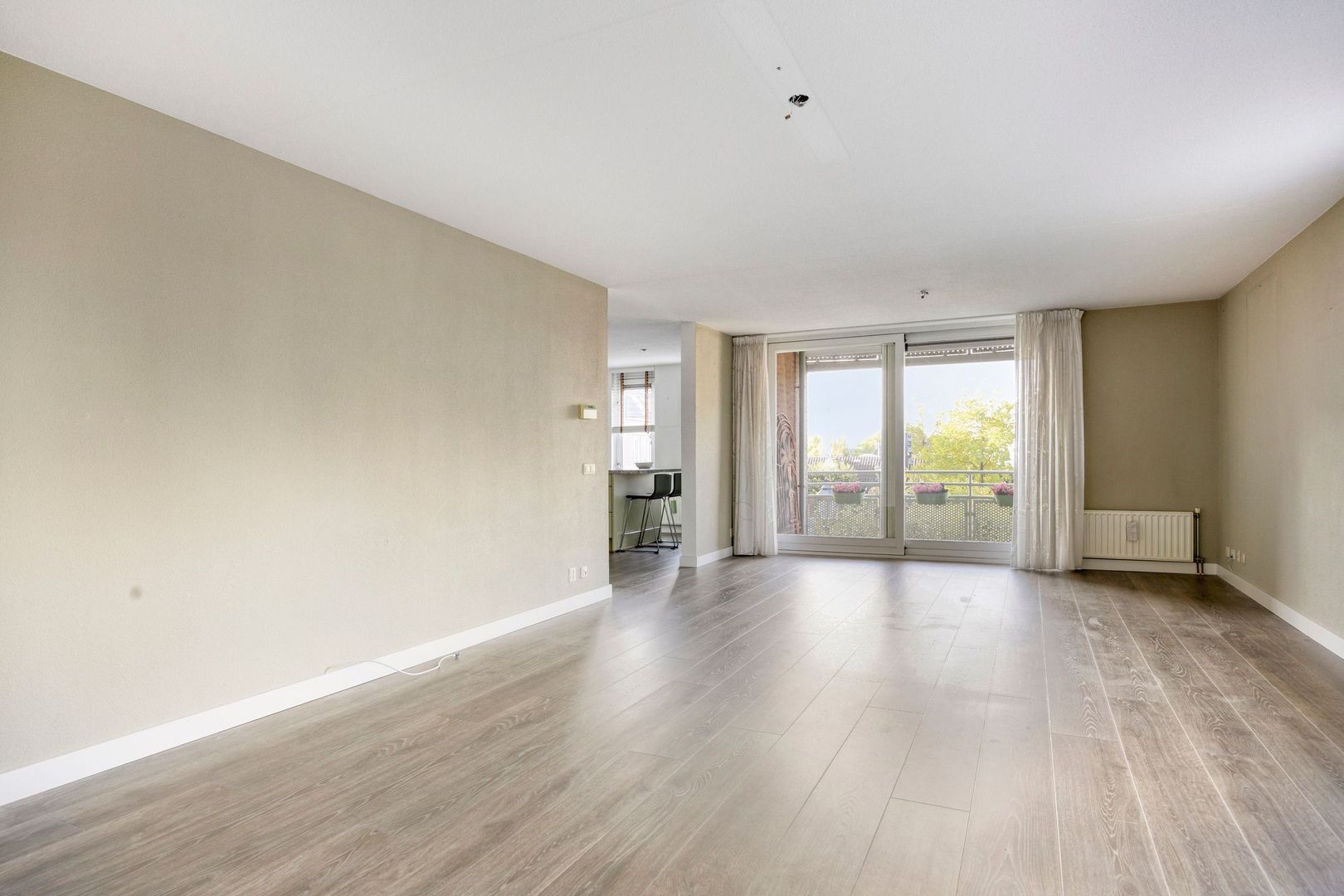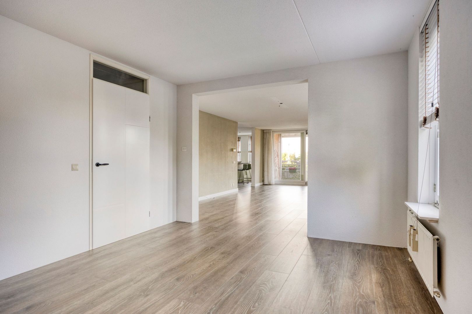 De ruime en lichte woonkamer is een fijne plek om thuis te komen. Dankzij de grote raampartijen valt er veel daglicht naar binnen en de schuifpui biedt toegang tot het zonnige balkon op het zuiden, met een gezellig uitzicht over het dorpscentrum. Een inpandige bergkast zorgt voor extra opbergruimte.