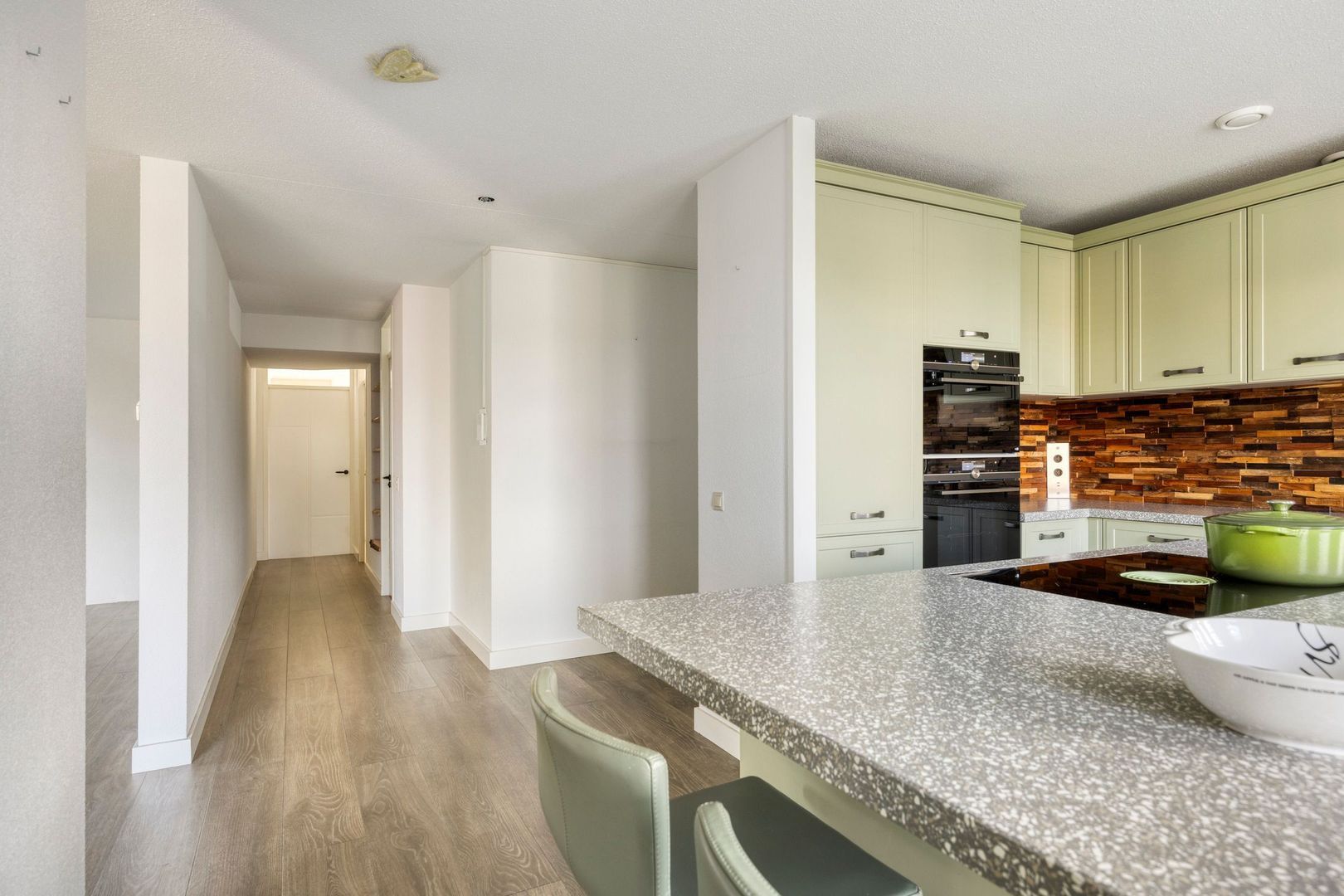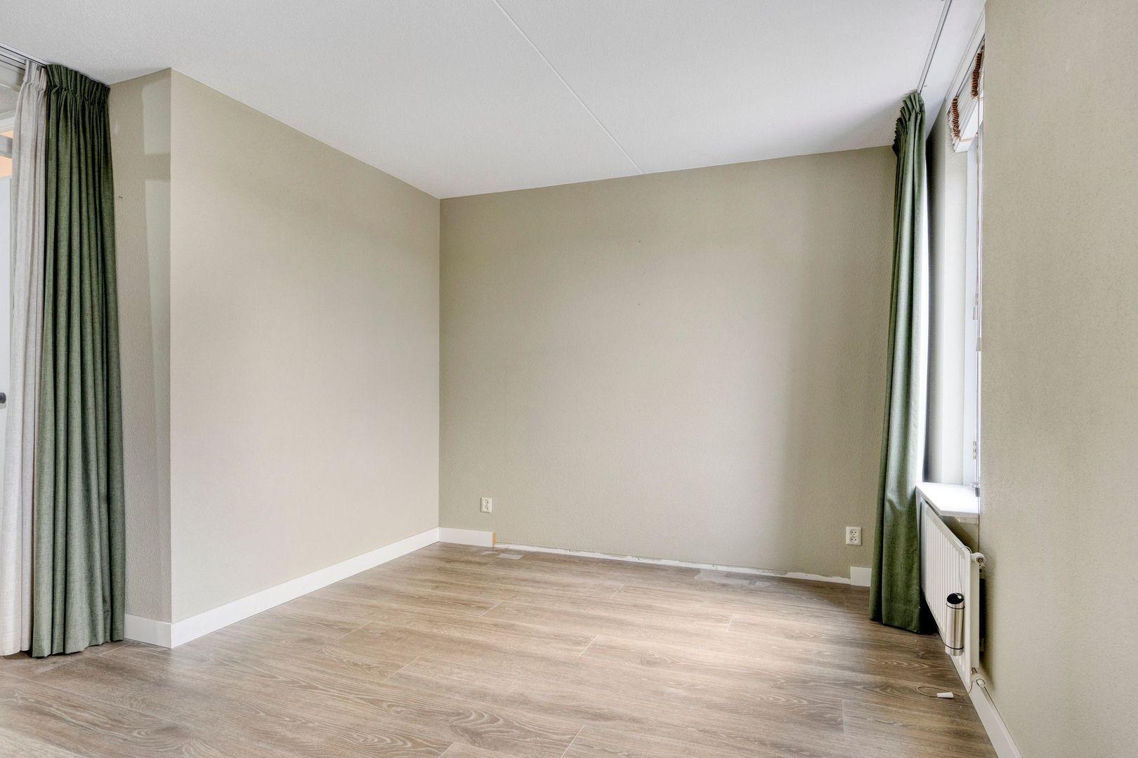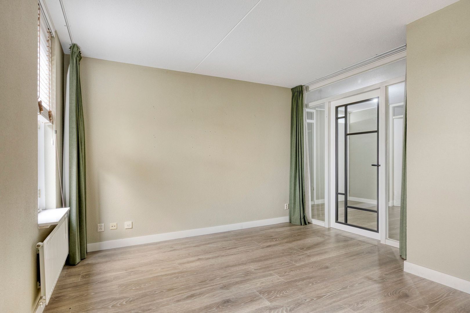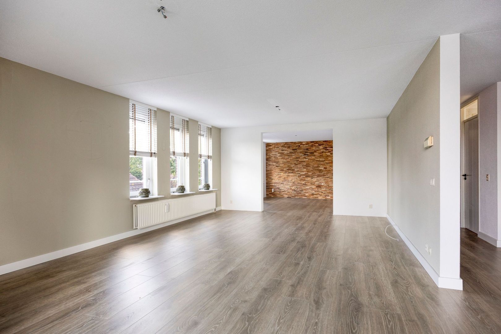 De ruime en lichte woonkamer is een fijne plek om thuis te komen. Dankzij de grote raampartijen valt er veel daglicht naar binnen en de schuifpui biedt toegang tot het zonnige balkon op het zuiden, met een gezellig uitzicht over het dorpscentrum. Een inpandige bergkast zorgt voor extra opbergruimte.