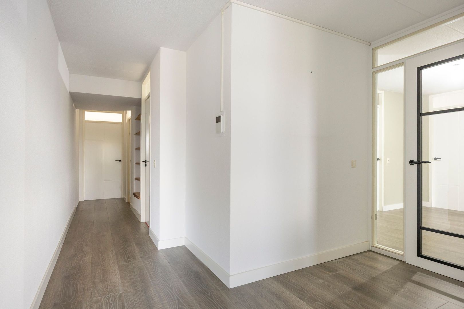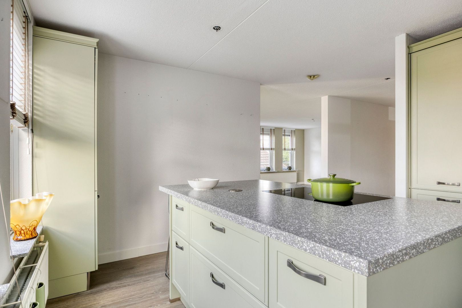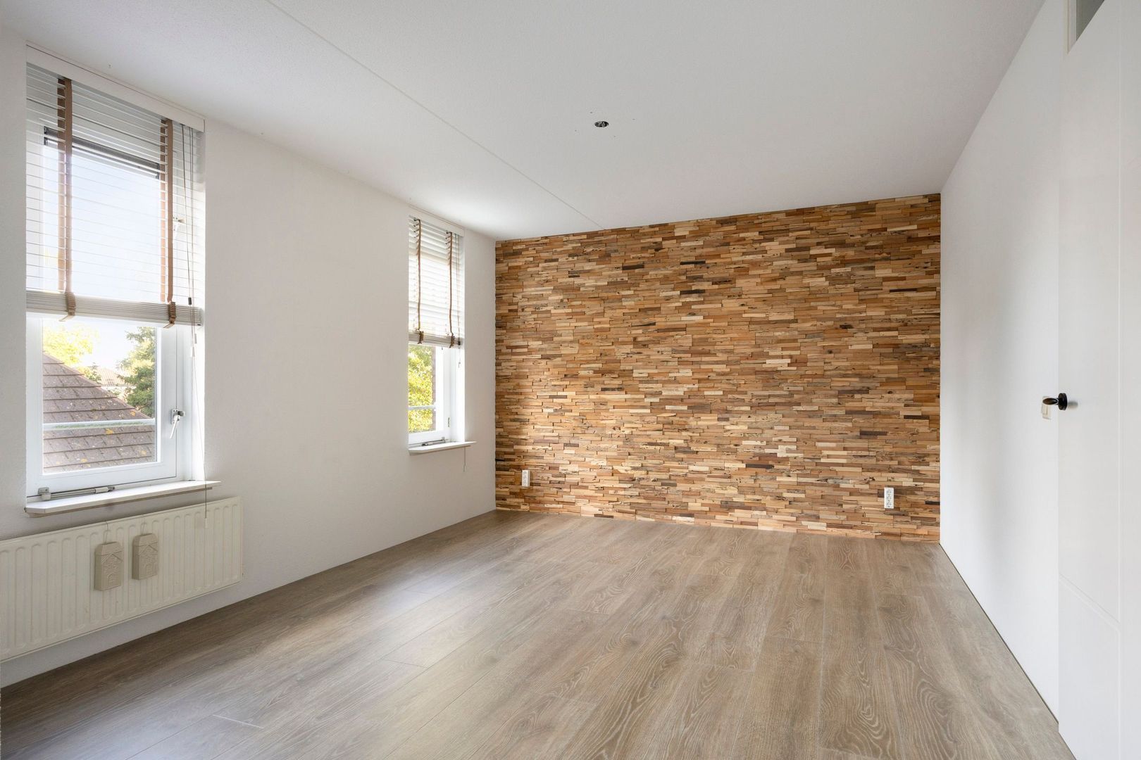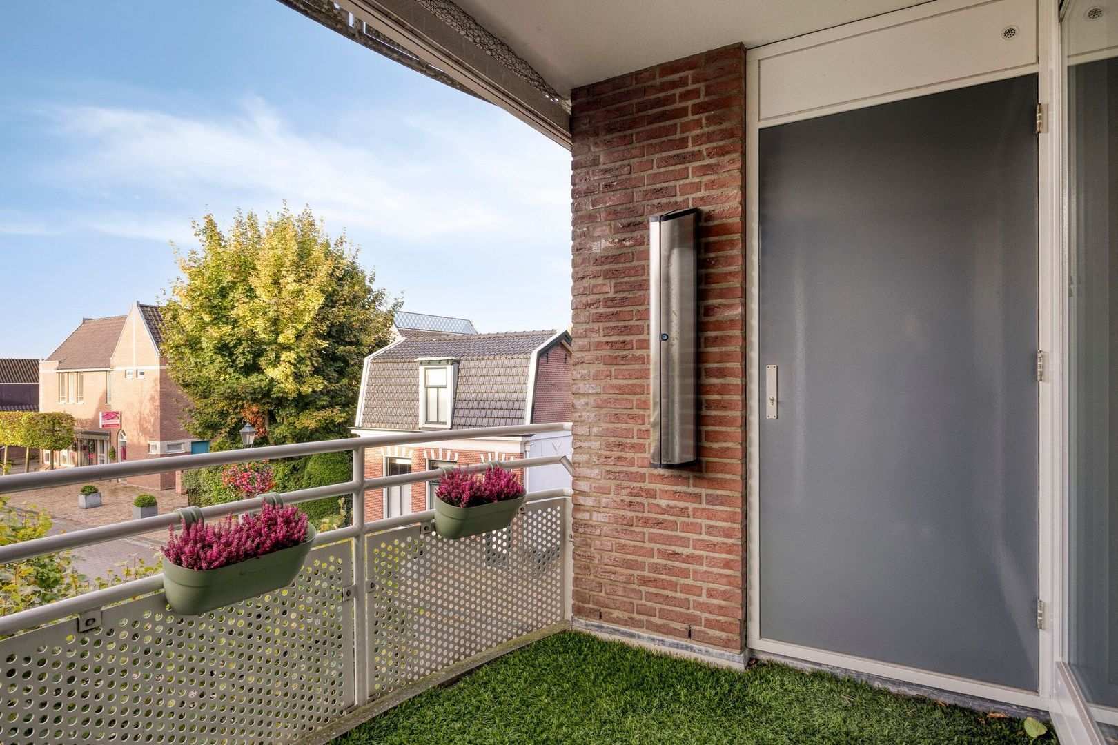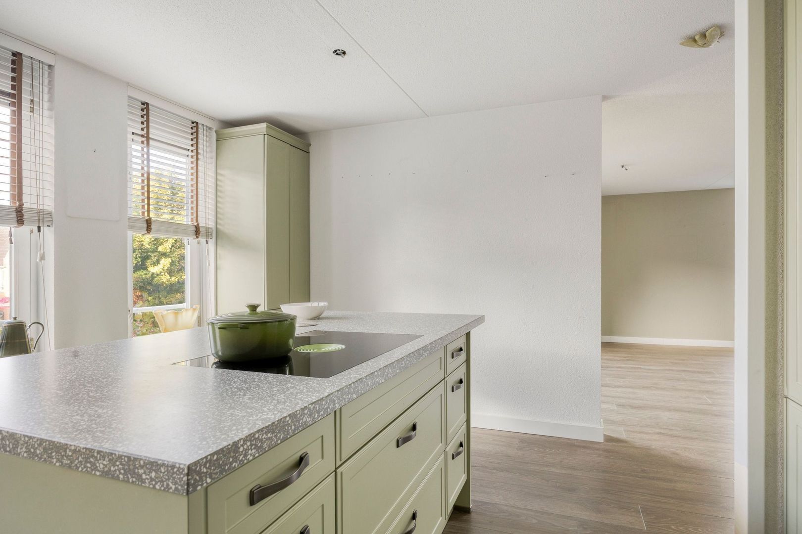 De ruime en lichte woonkamer is een fijne plek om thuis te komen. Dankzij de grote raampartijen valt er veel daglicht naar binnen en de schuifpui biedt toegang tot het zonnige balkon op het zuiden, met een gezellig uitzicht over het dorpscentrum. Een inpandige bergkast zorgt voor extra opbergruimte.
