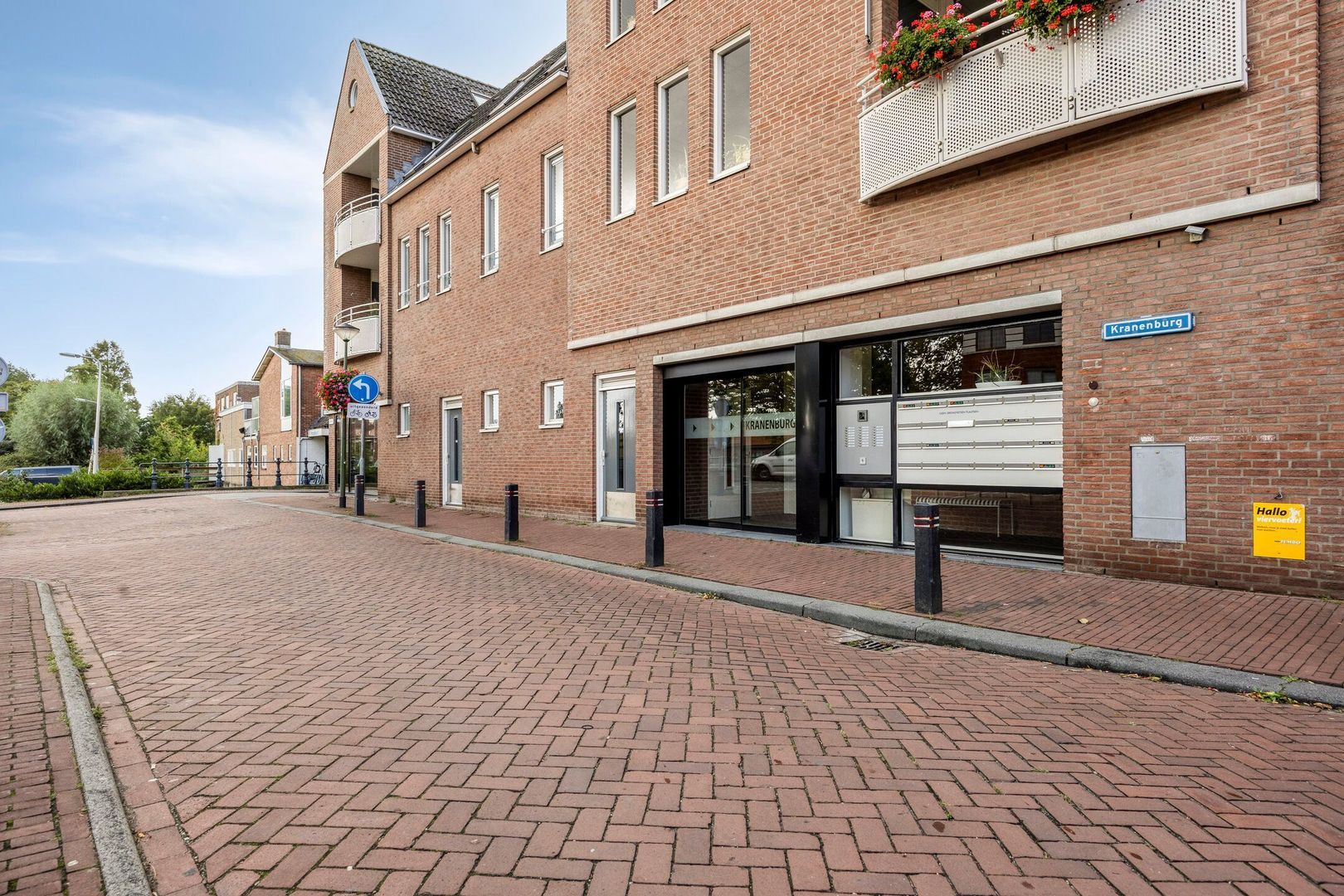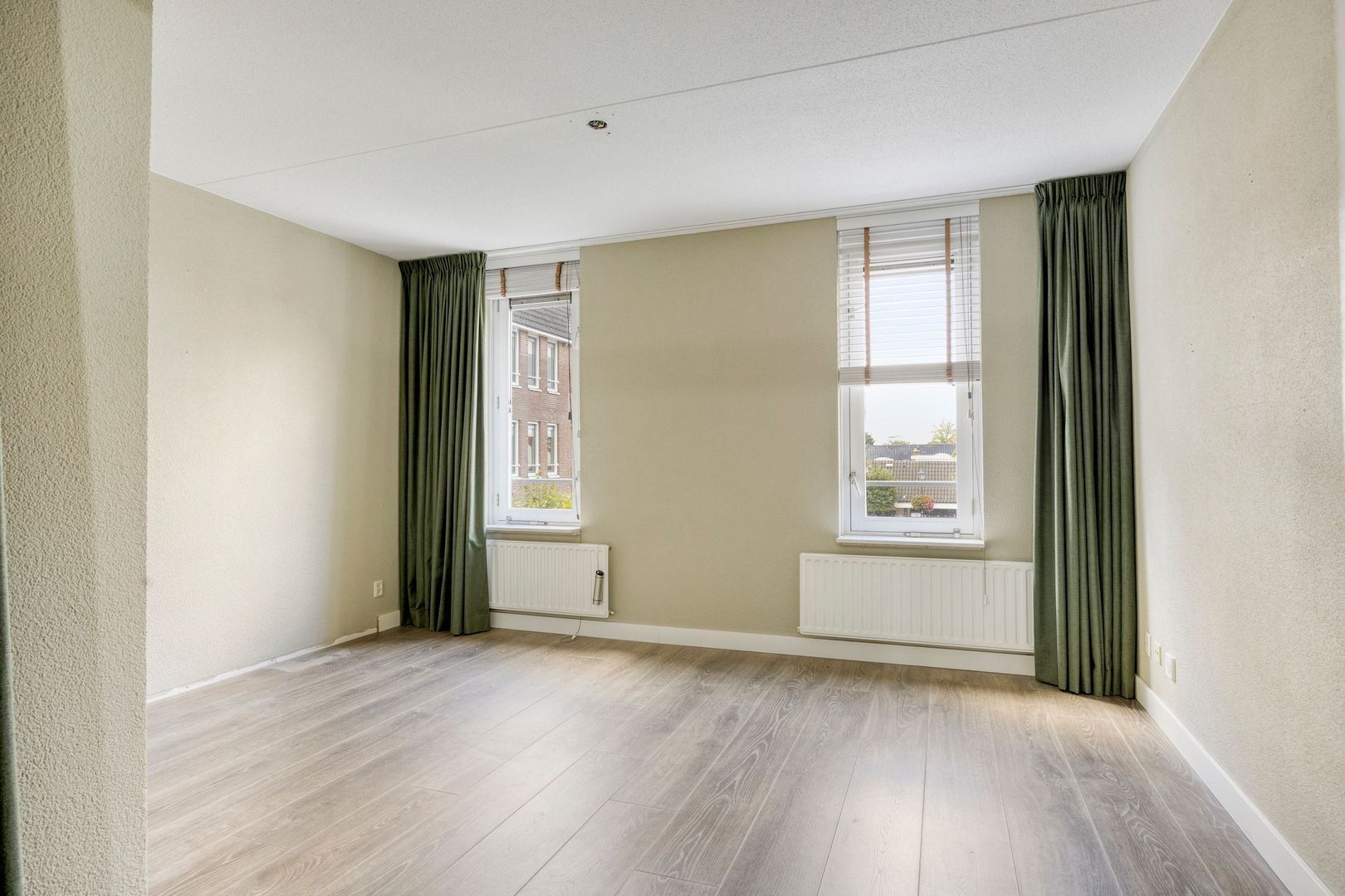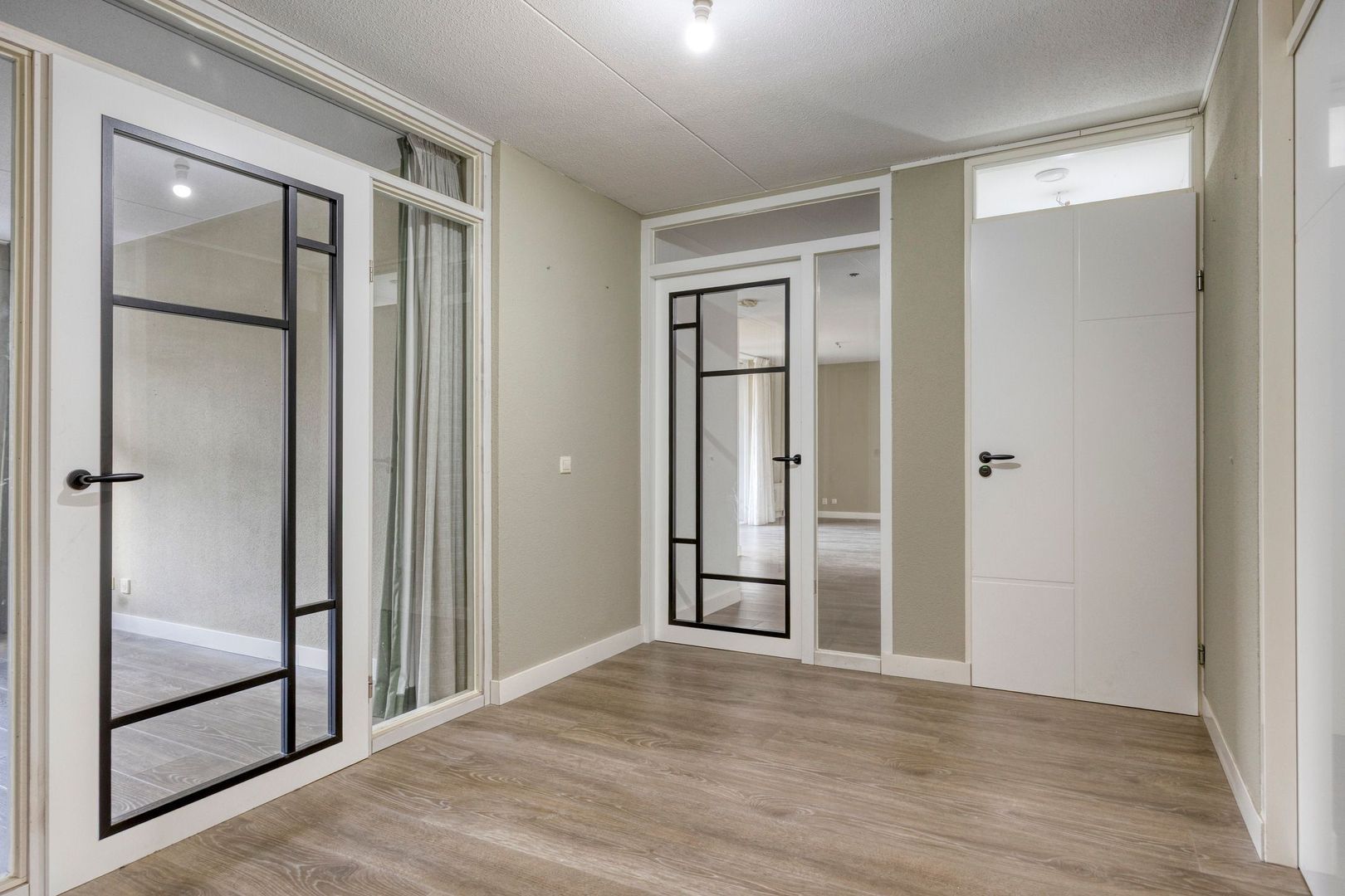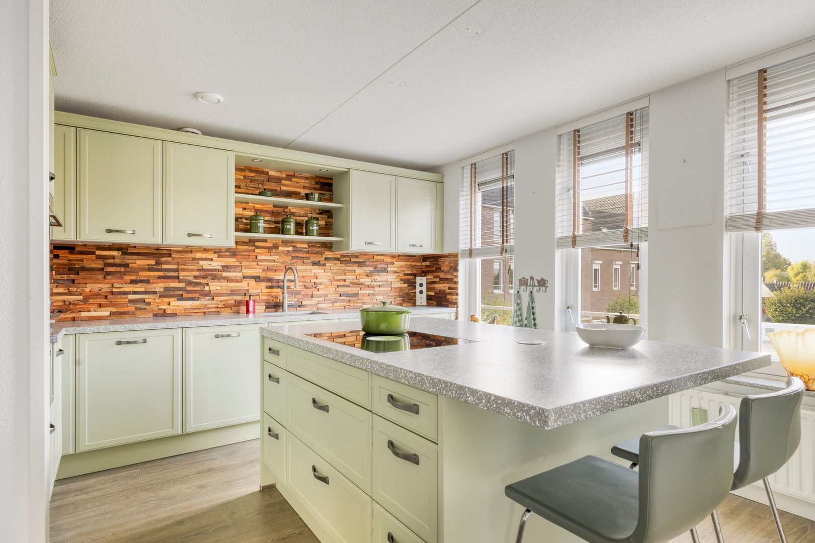 De ruime en lichte woonkamer is een fijne plek om thuis te komen. Dankzij de grote raampartijen valt er veel daglicht naar binnen en de schuifpui biedt toegang tot het zonnige balkon op het zuiden, met een gezellig uitzicht over het dorpscentrum. Een inpandige bergkast zorgt voor extra opbergruimte.
