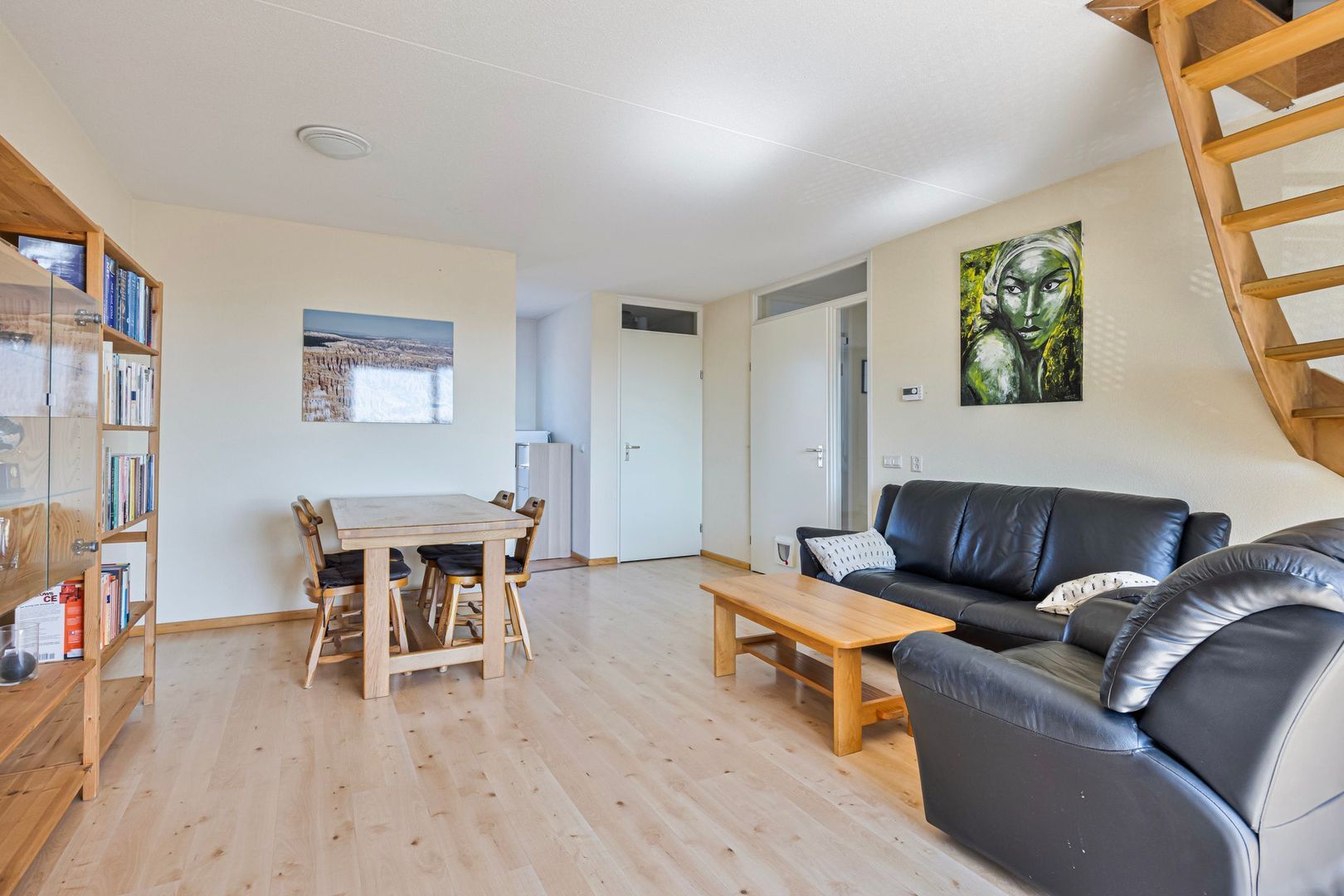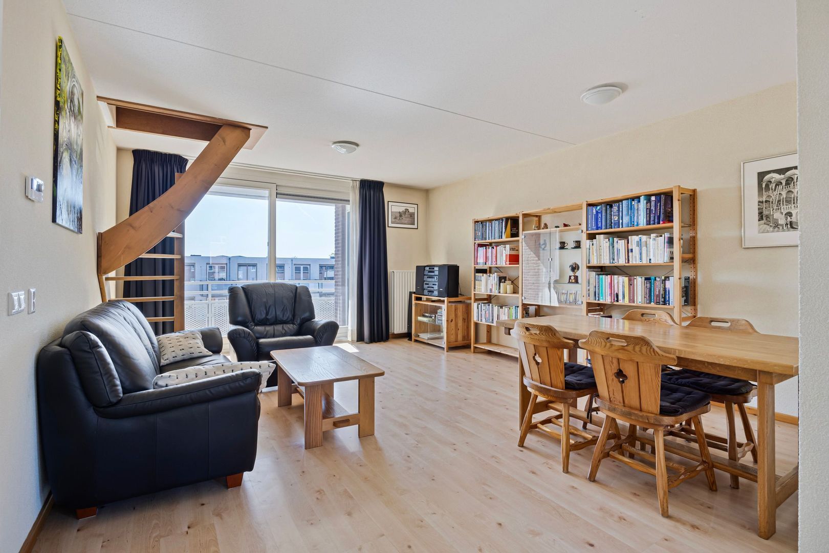 De lichte en ruime woonkamer valt direct op door de grote raampartijen en prettige indeling.