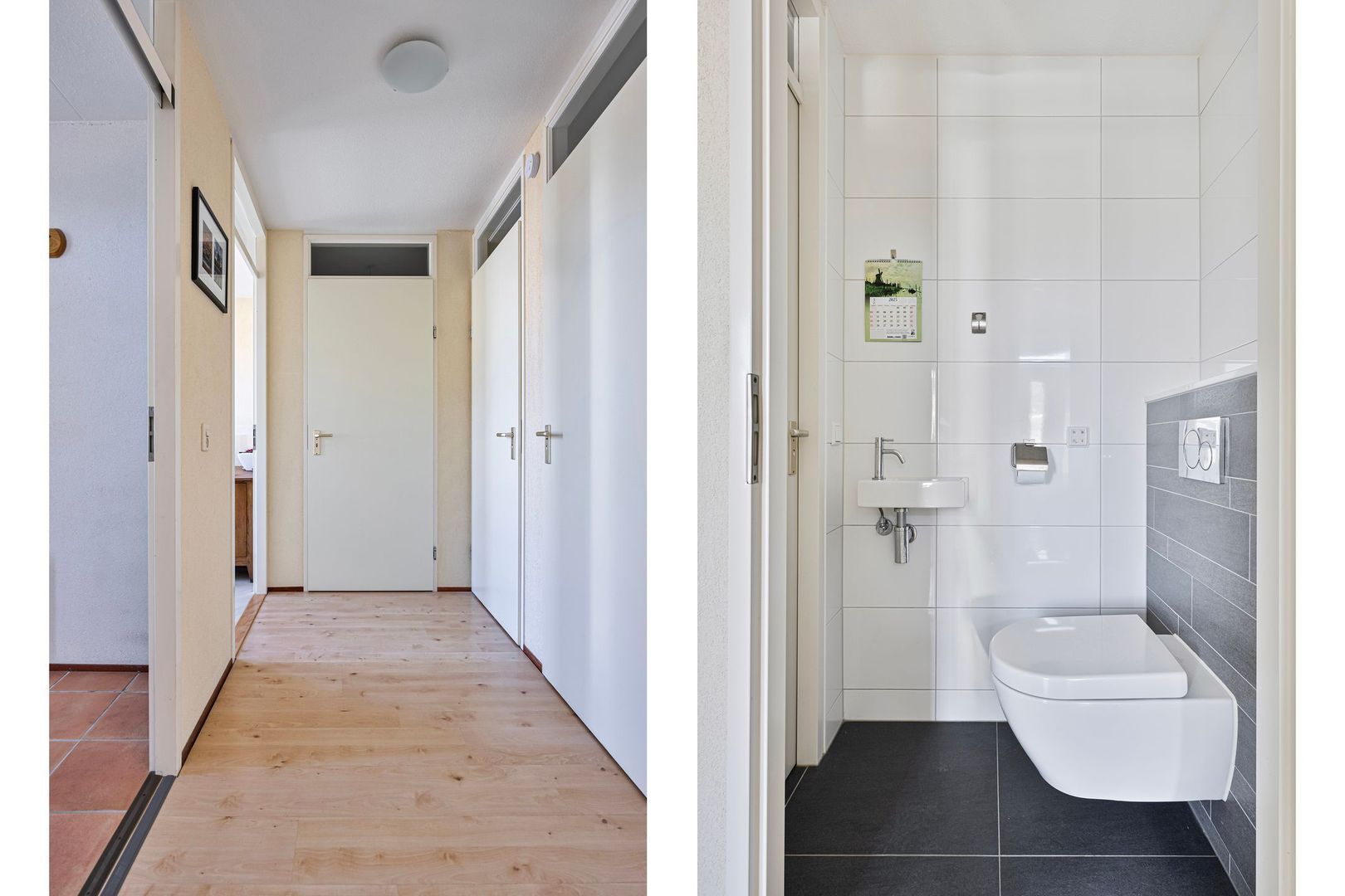 De hal geeft toegang tot het toilet, een praktische berging met aansluitingen voor wasmachine en droger, en alle overige vertrekken.