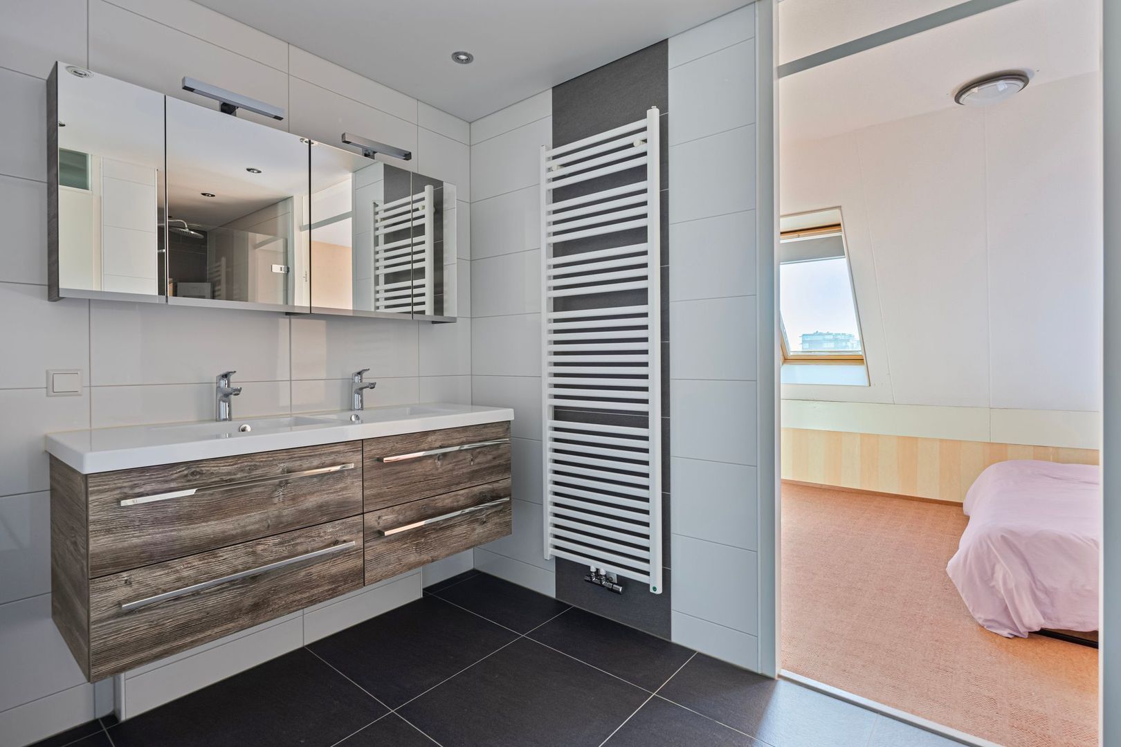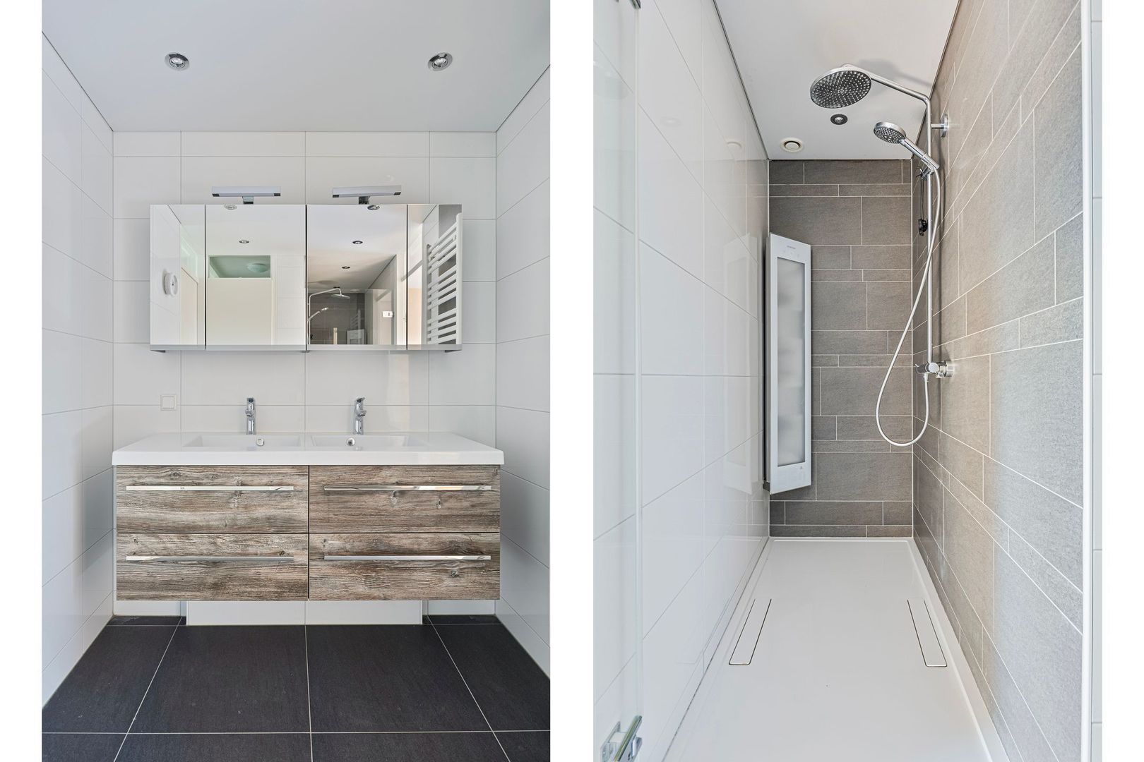 De badkamer is netjes afgewerkt en uitgerust met een dubbele wastafel met meubel, inloopdouche met sunshower en handdoekradiator.