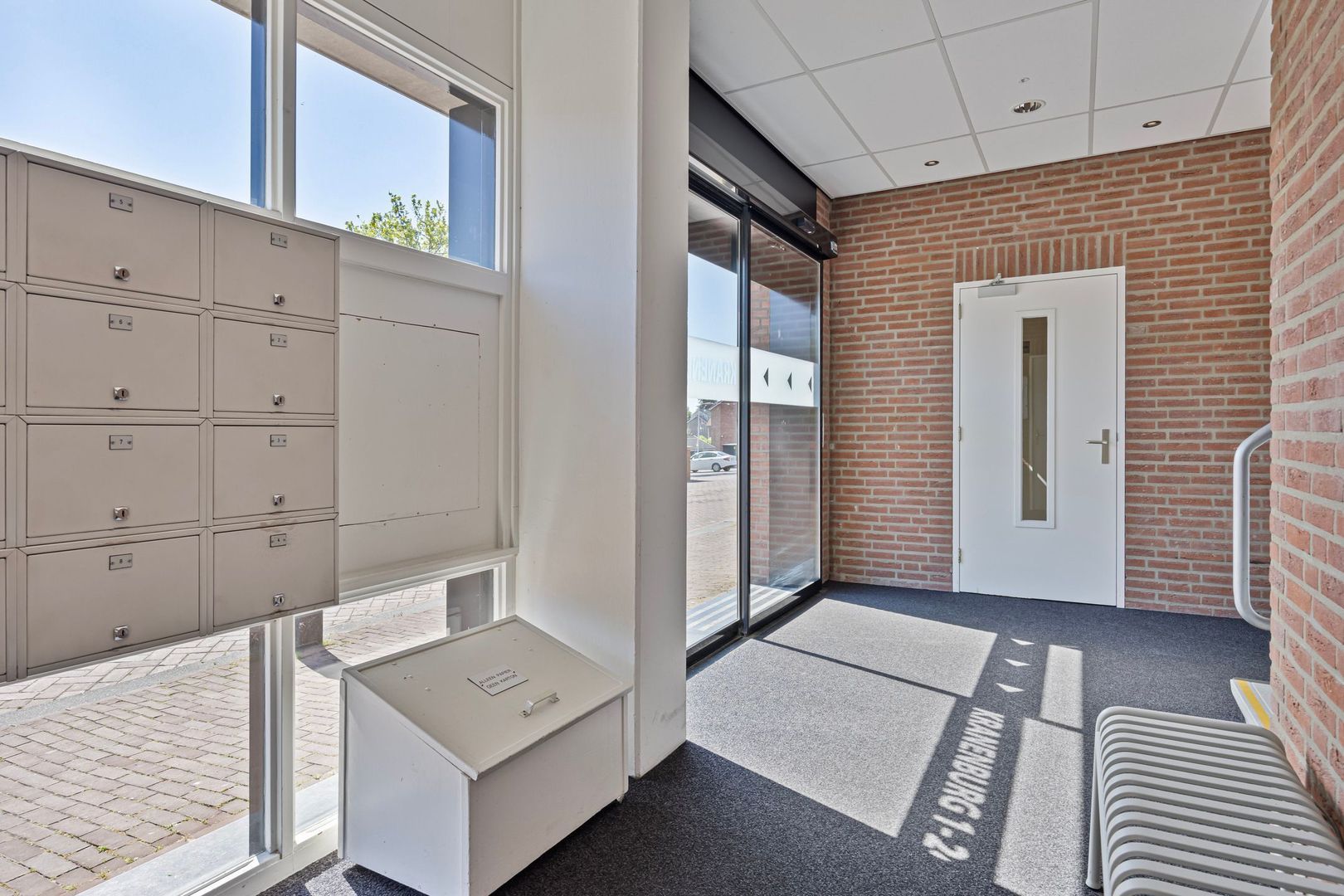 Afgesloten portiek met bellentableau, videofoon en brievenbussen.