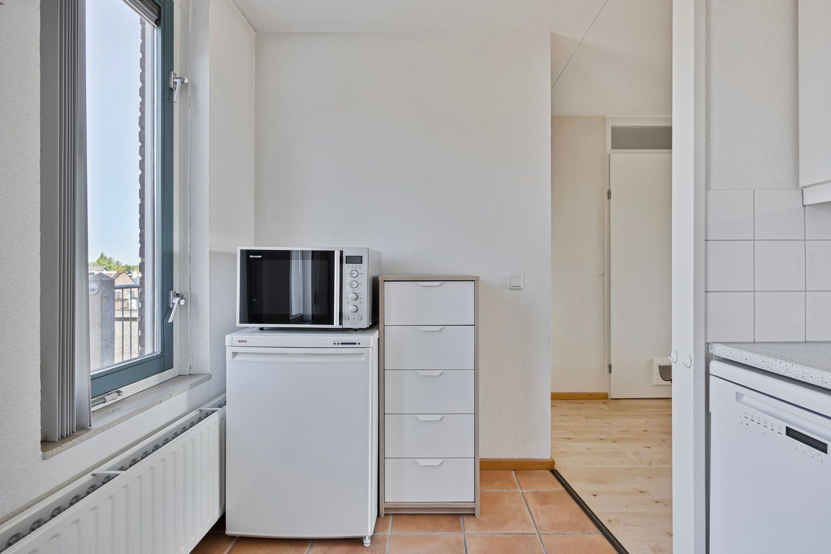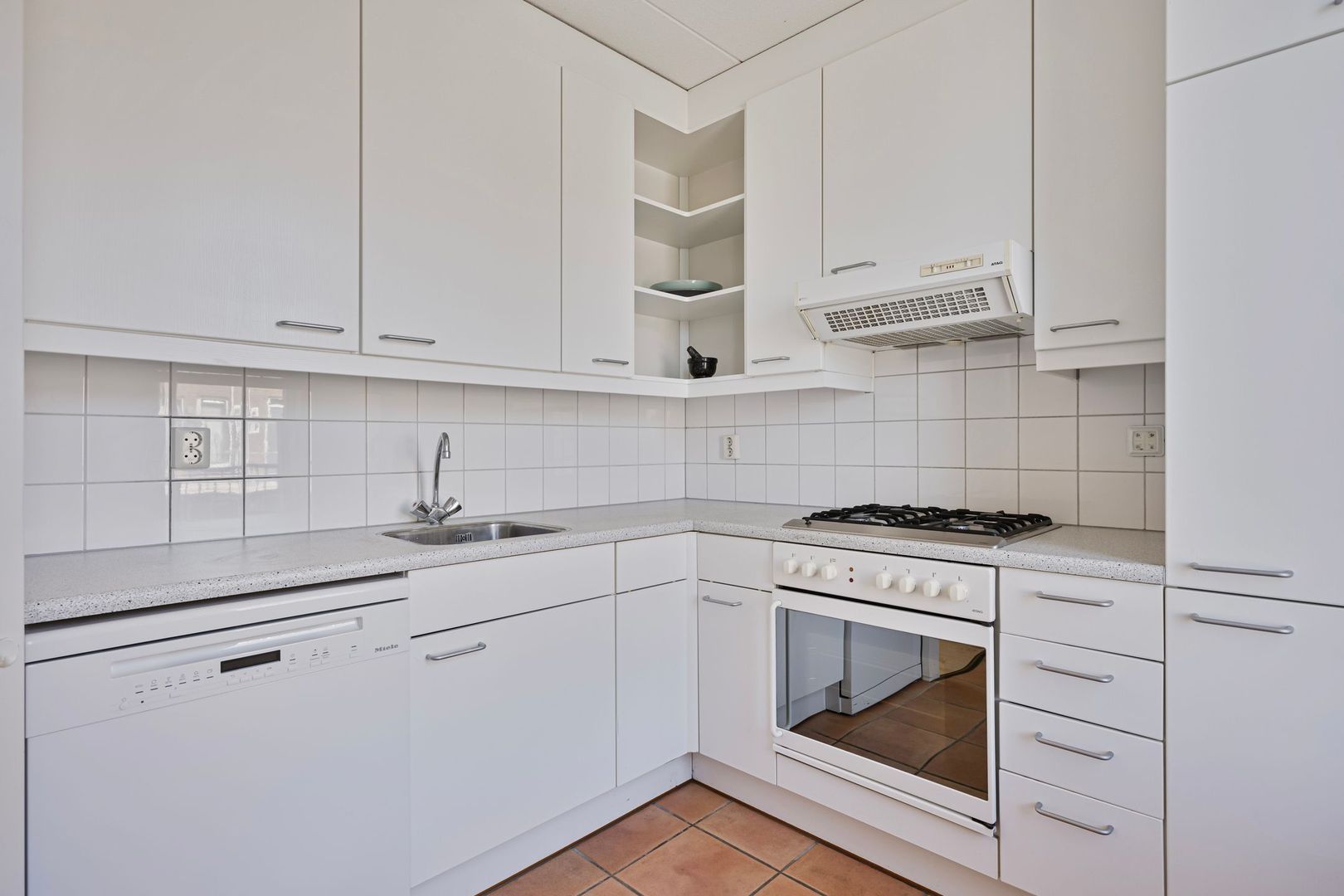 De L-vormige keuken is van alle gemakken voorzien, zoals een vaatwasser, oven, gasfornuis en koel-vries combinatie. Vanuit de woonkamer heeft u via een schuifpui toegang tot het balkon met buitenberging. Een heerlijke plek om de dag te beginnen met een lekker kopje koffie of juist om lekker in de schaduw te zitten op een warme zomerdag.