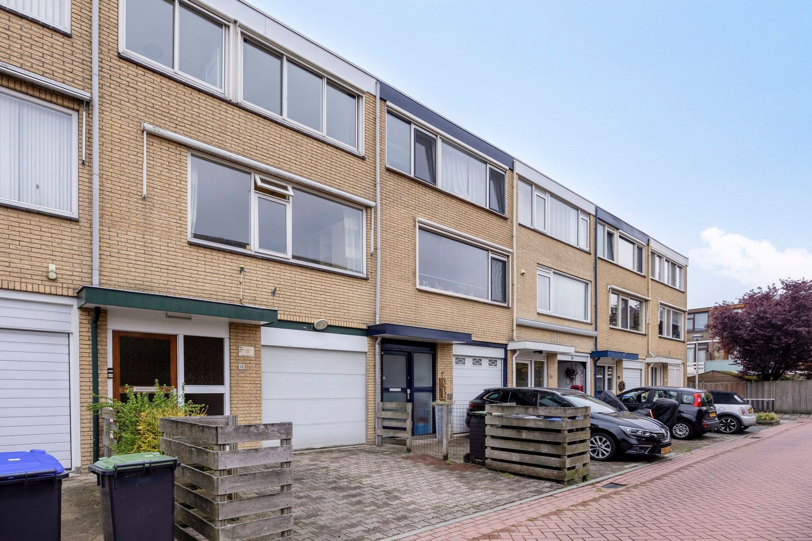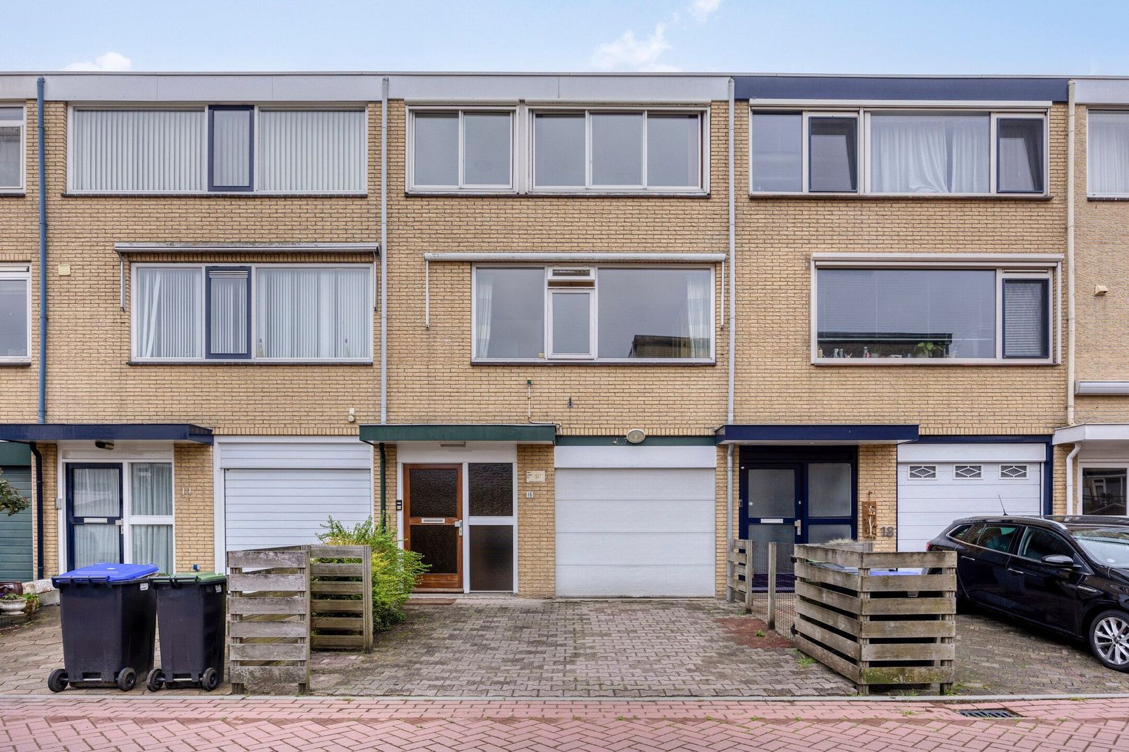 Grote oprit met parkeergelegenheid voor een auto en toegang tot de inpandige garage, voorzien van een elektrische roldeur. In de garage bevindt zich ook de aansluiting voor de wasmachine. Naast het parkeren van een auto biedt de garage ook volop ruimte voor het opbergen van fietsen, gereedschap of andere spullen.