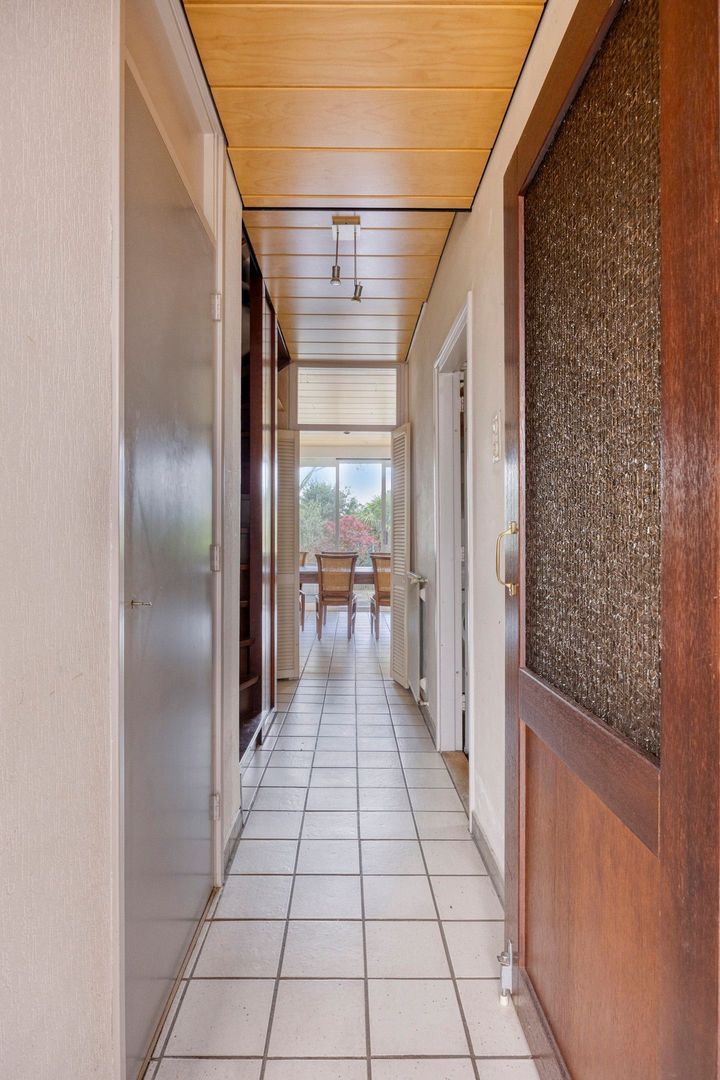 Entree, hal met meterkast, een kleine bergkast met opstelplaats voor de cv-ketel, trapopgang naar de eerste verdieping, toegang tot de garage en doorloop naar de aan de achterzijde gelegen woonkeuken. Vanuit de keuken heb je via een schuifpui toegang tot de nette achtertuin op het zonnige westen. In de tuin bevindt zich bovendien een elektrisch zonnescherm en een houten chalet, geschikt voor extra opslagruimte.