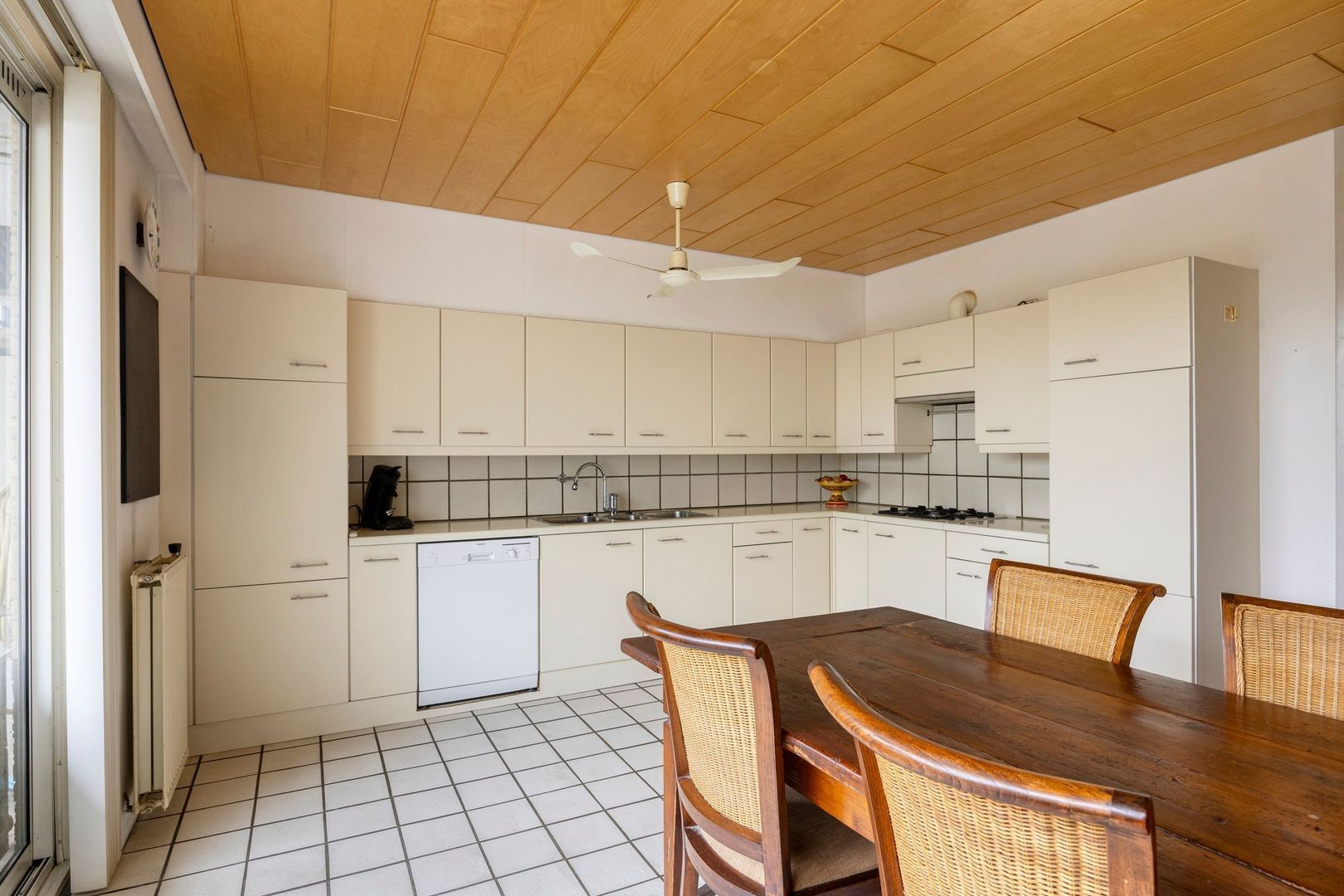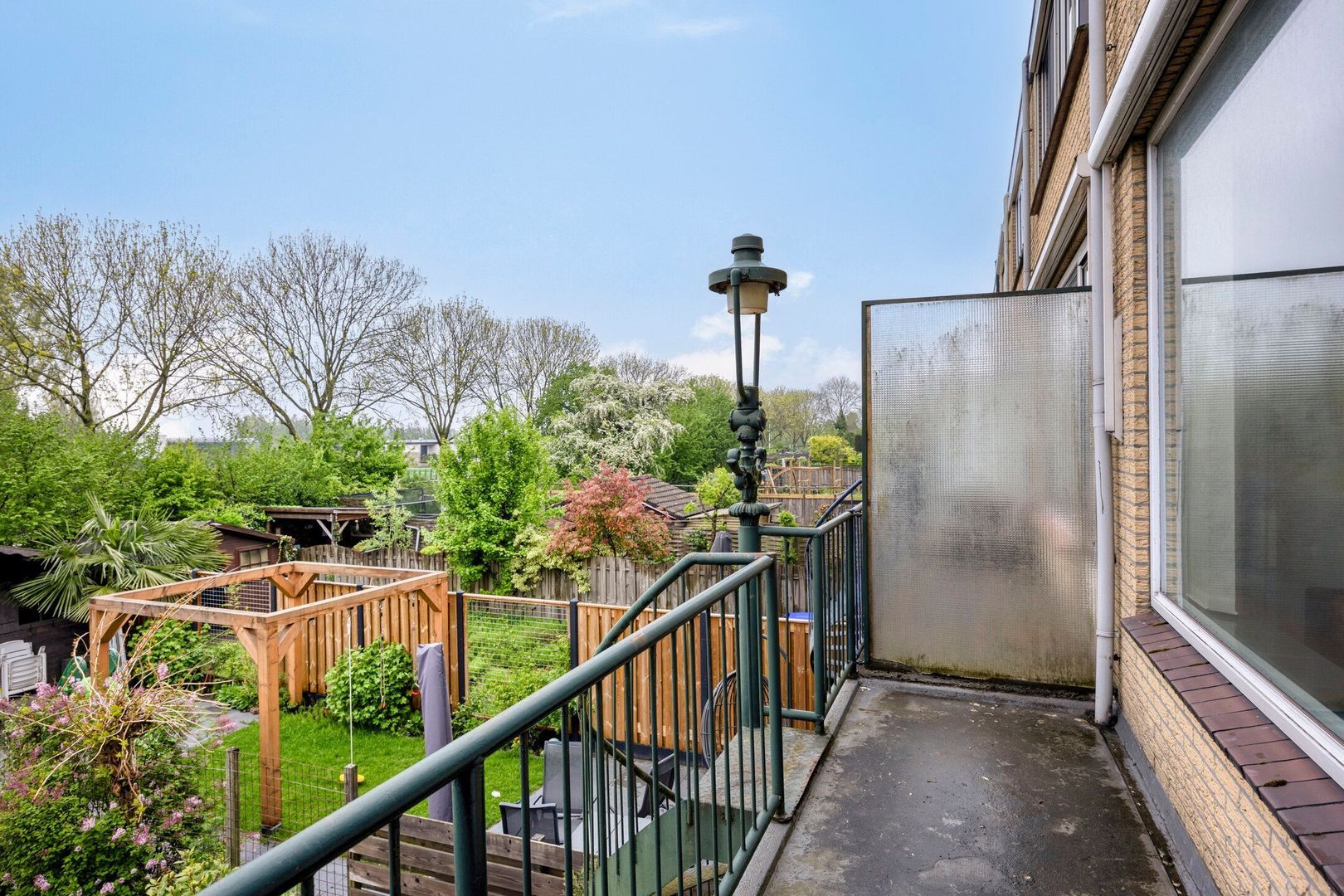 De ruime en lichte woonkamer is aan de achterzijde gelegen. Via de deur in de woonkamer heb je toegang tot het balkon, vanwaar je met een trap direct in de achtertuin komt. Ook in de woonkamer is een elektrisch zonnescherm aanwezig. Aan de voorzijde van deze verdieping bevindt zich een kleine keuken.