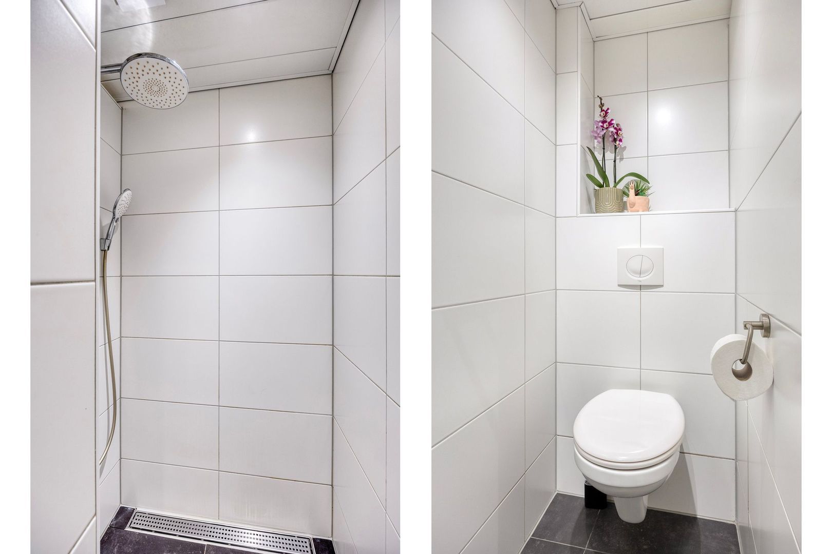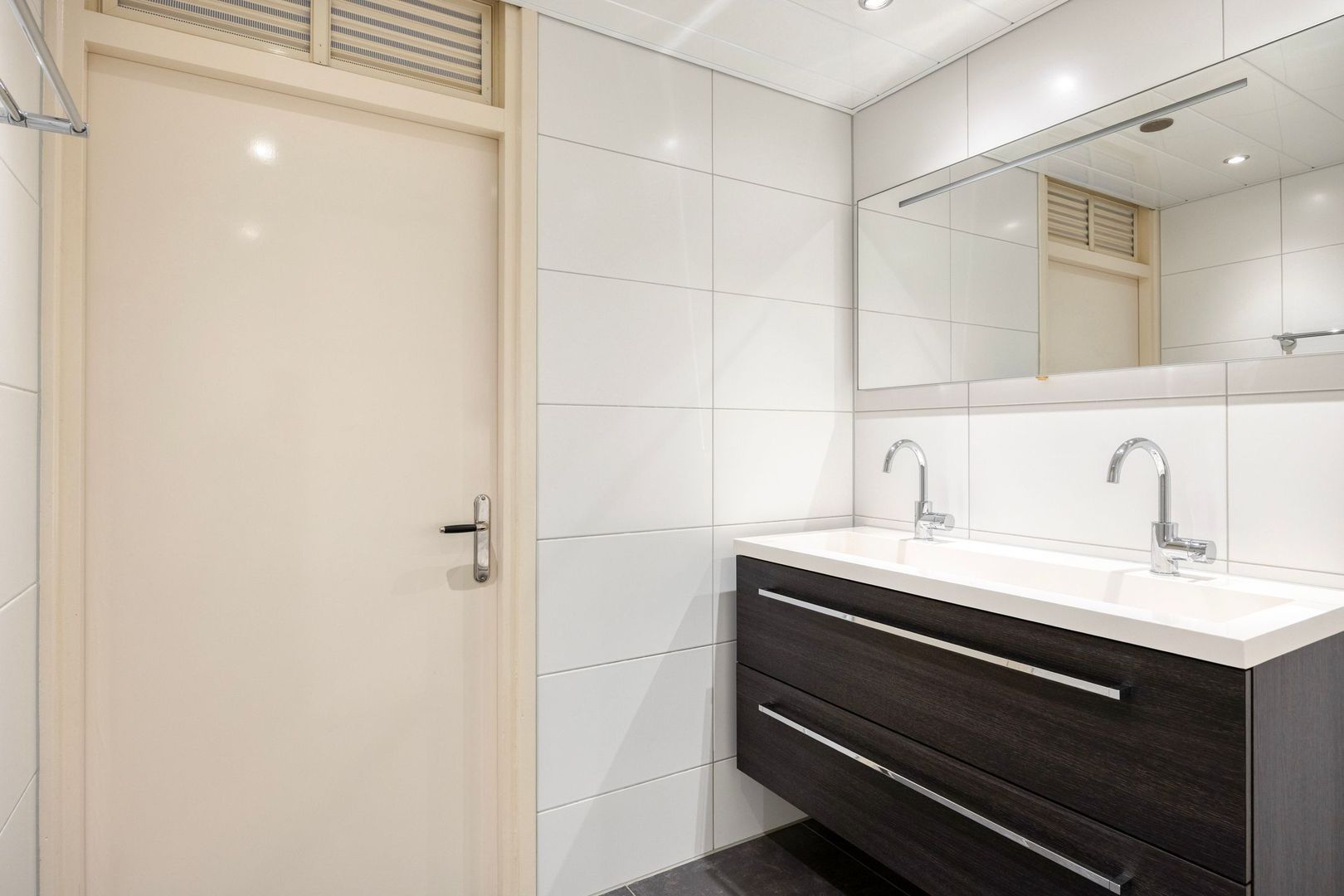 De badkamer is voorzien van een dubbele wastafel, toilet en een ruime inloopdouche.