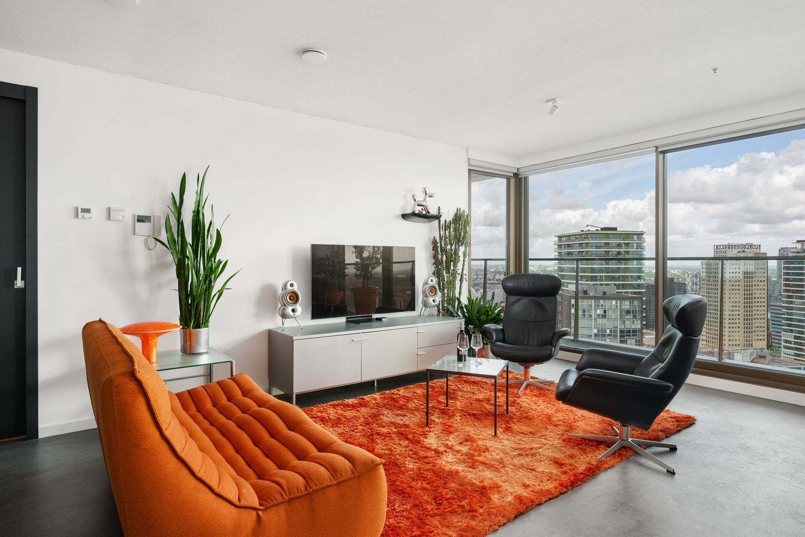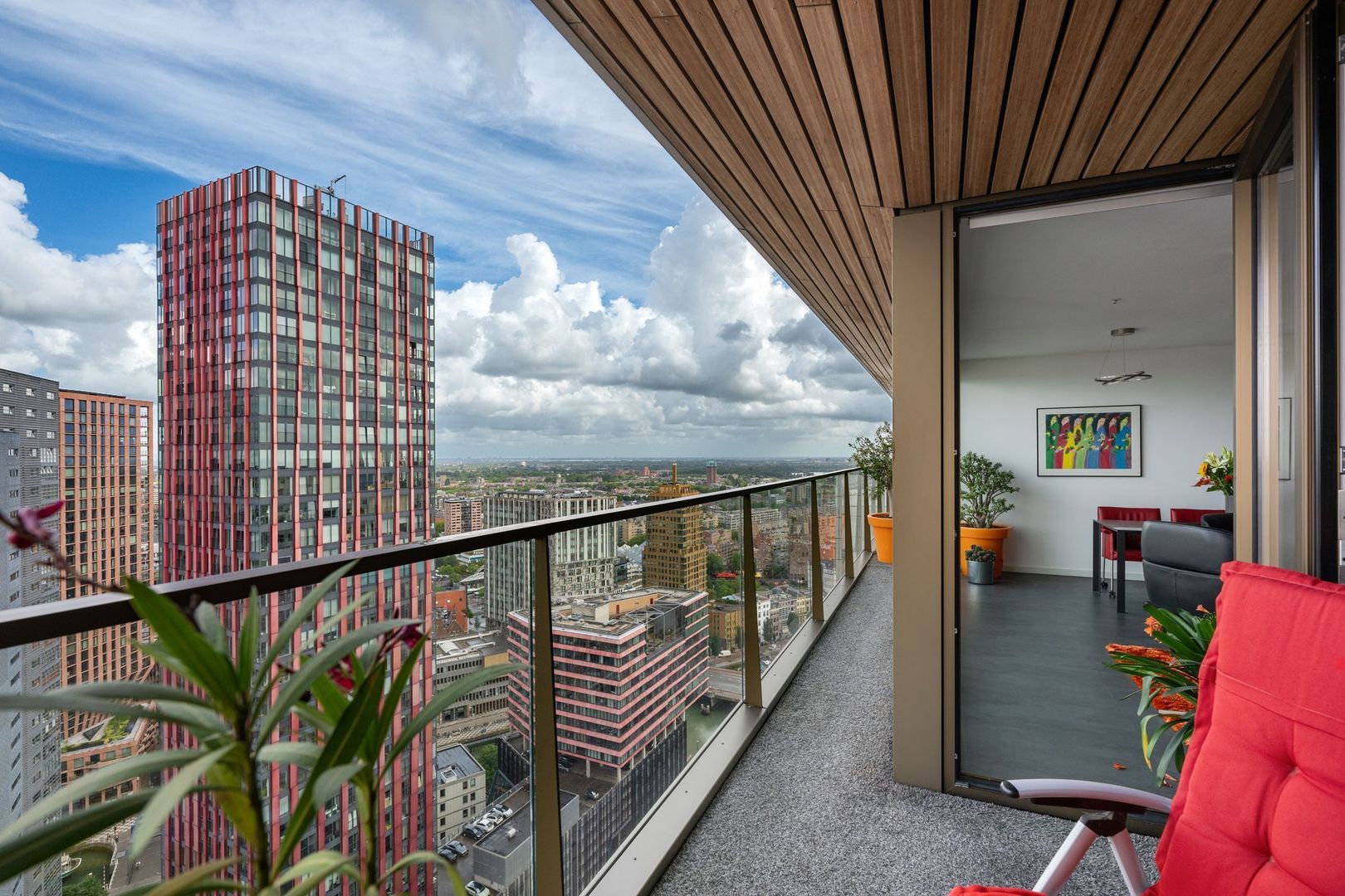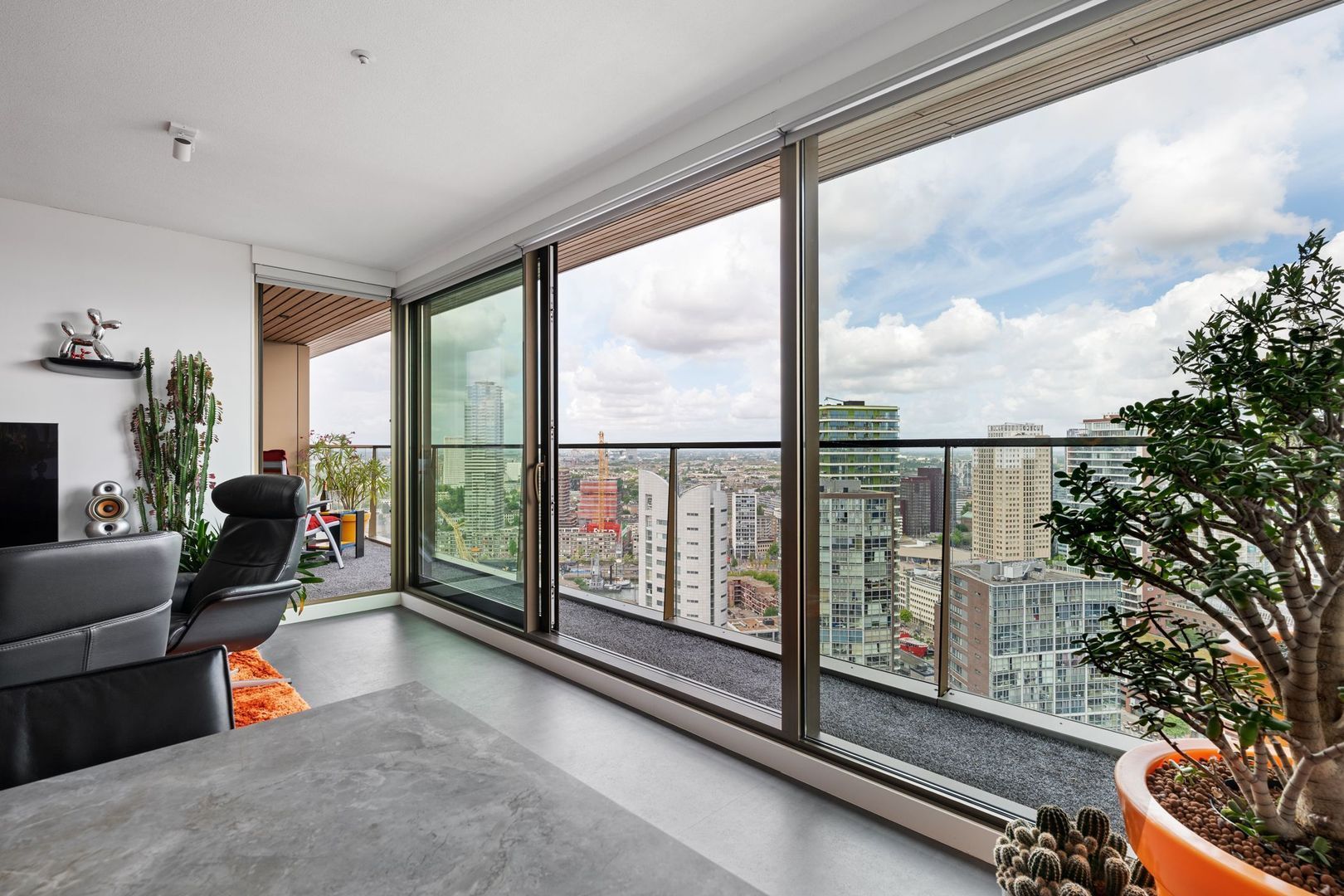 Zodra je de woonkamer binnenstapt, word je direct verrast door het fenomenale uitzicht over Rotterdam. De ramen zijn voorzien van elektrische bedienbare screens aan de binnenzijde. Via de schuifpui heb je toegang tot het terras, waar je heerlijk kunt ontspannen en genieten van de zonsondergang.