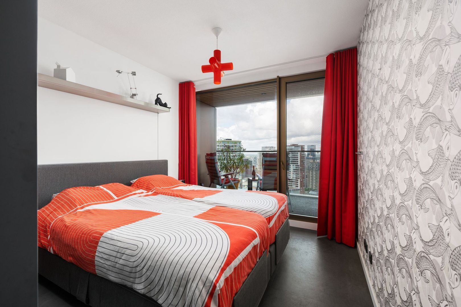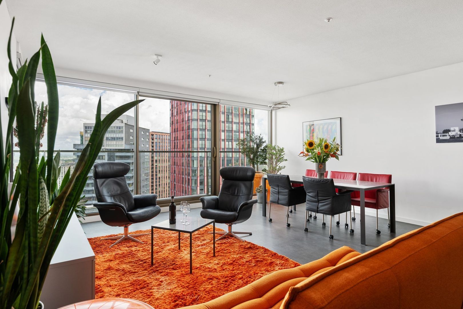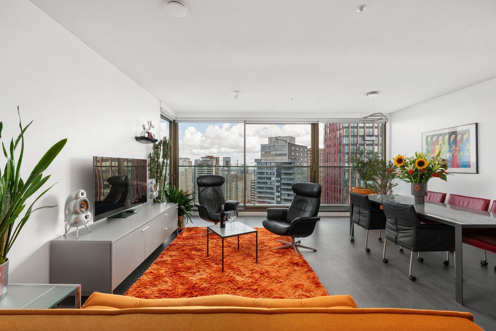 Zodra je de woonkamer binnenstapt, word je direct verrast door het fenomenale uitzicht over Rotterdam. De ramen zijn voorzien van elektrische bedienbare screens aan de binnenzijde. Via de schuifpui heb je toegang tot het terras, waar je heerlijk kunt ontspannen en genieten van de zonsondergang.