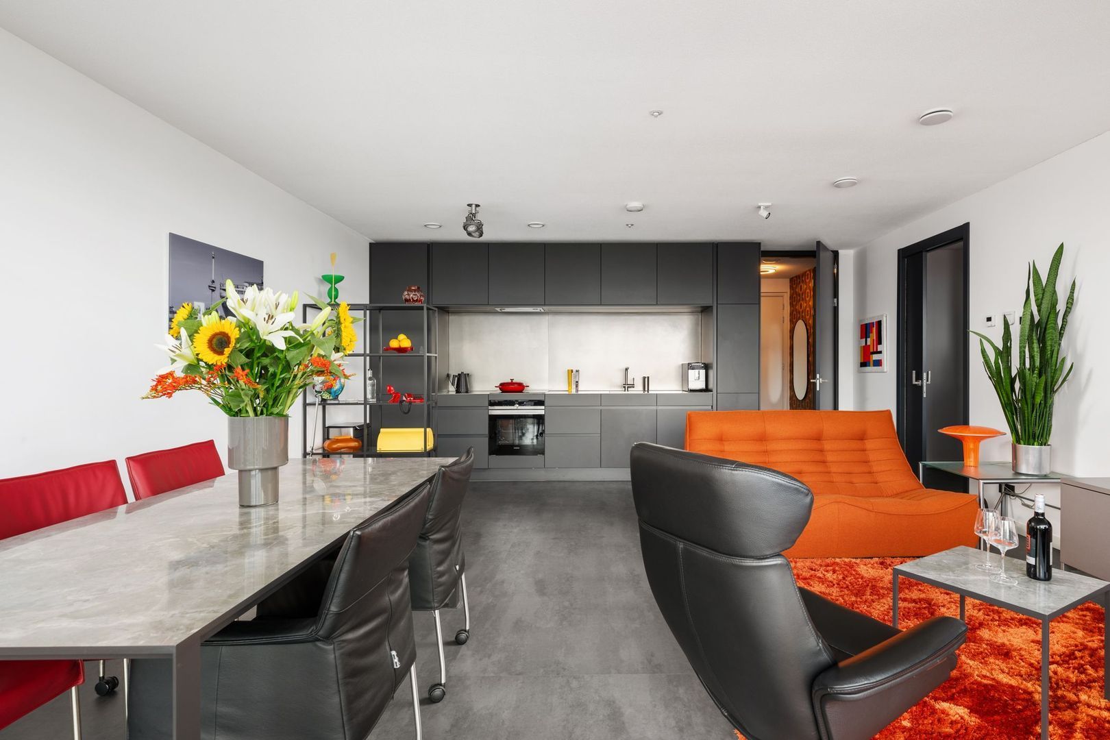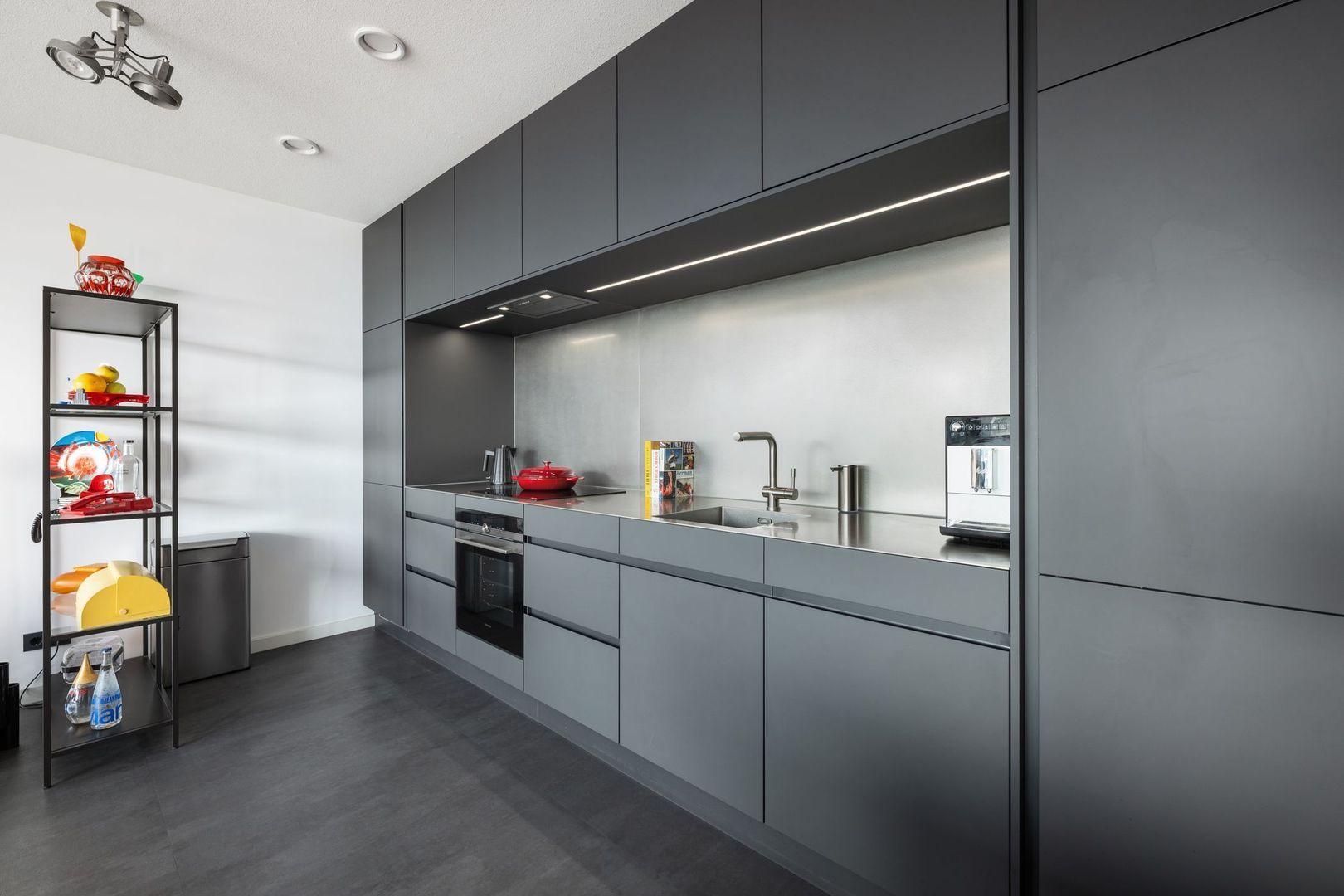 De moderne, open keuken in rechte opstelling is uitgerust met een inductiekookplaat, geïntegreerde afzuigkap, vaatwasser, oven met stoomfunctie en een koel-vriescombinatie.