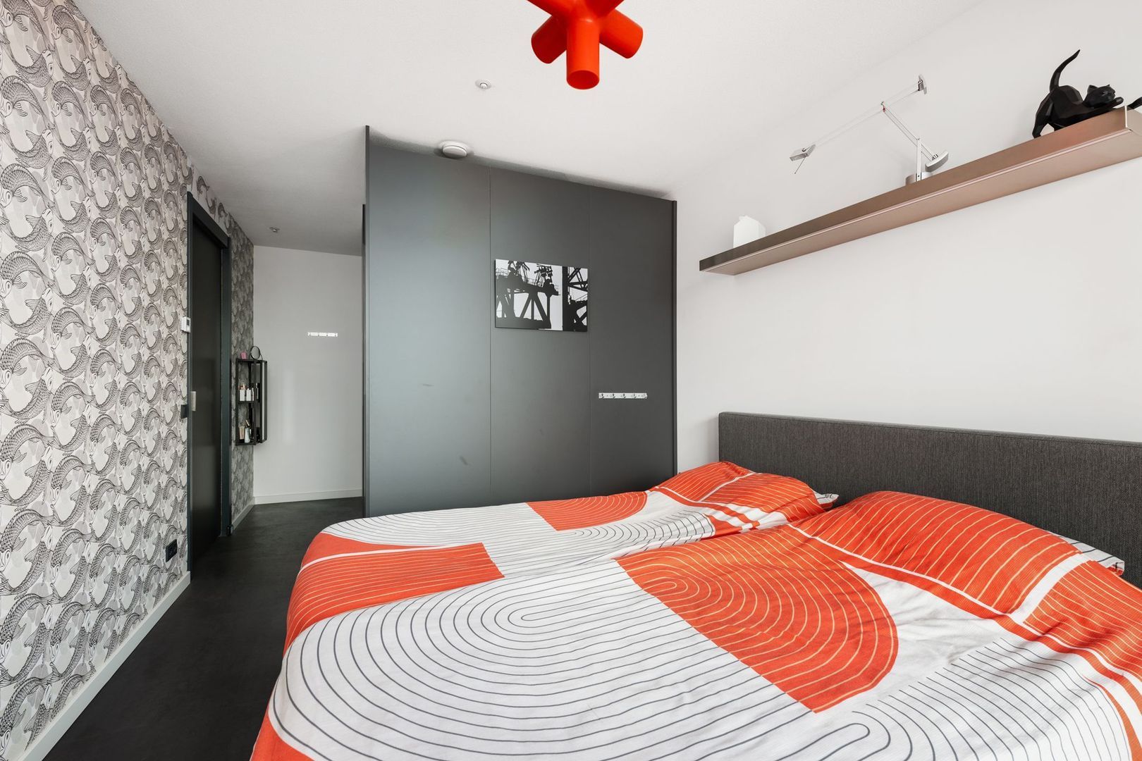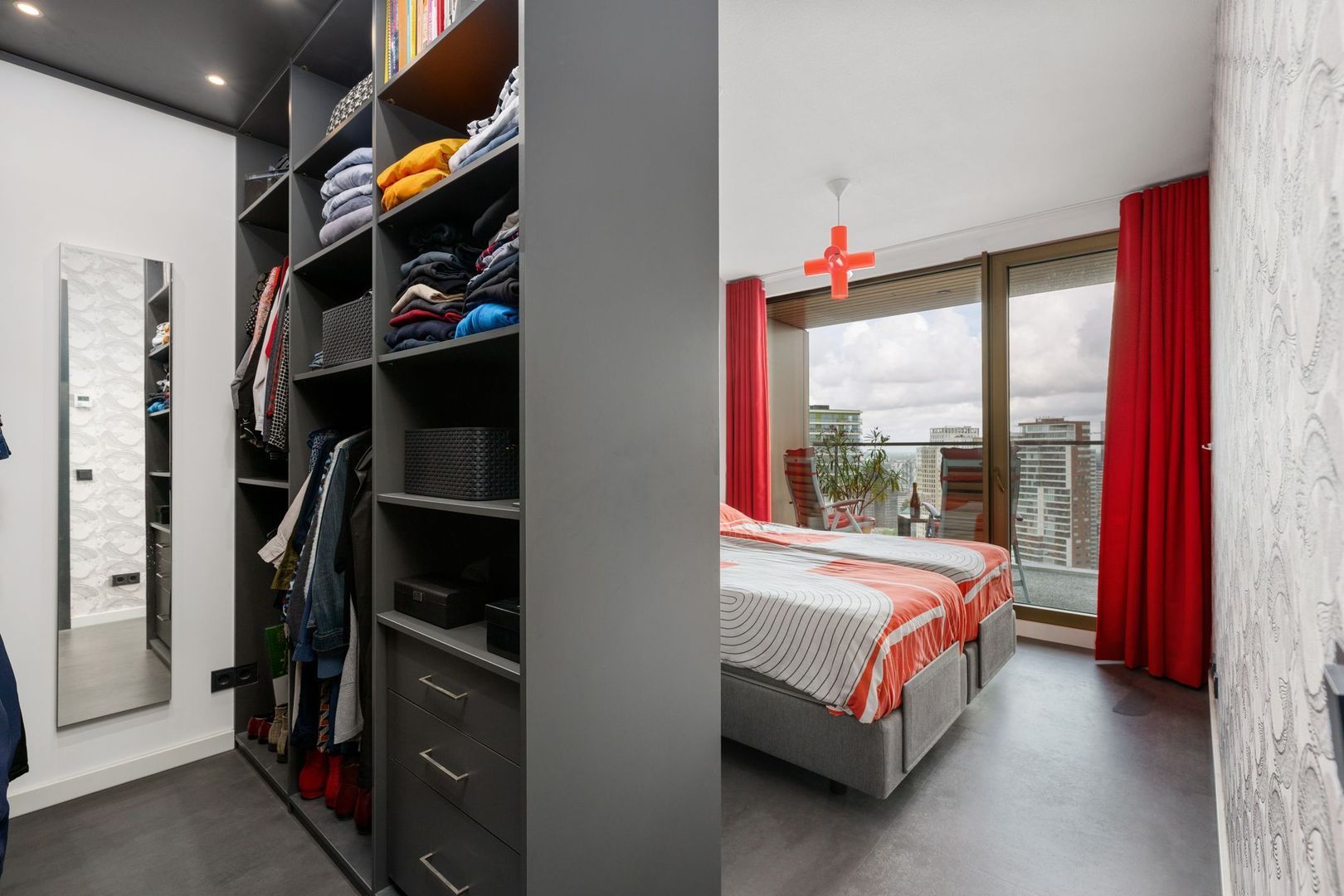 De ruime slaapkamer beschikt over een praktische walk-in closet en biedt eveneens toegang tot het terras.
