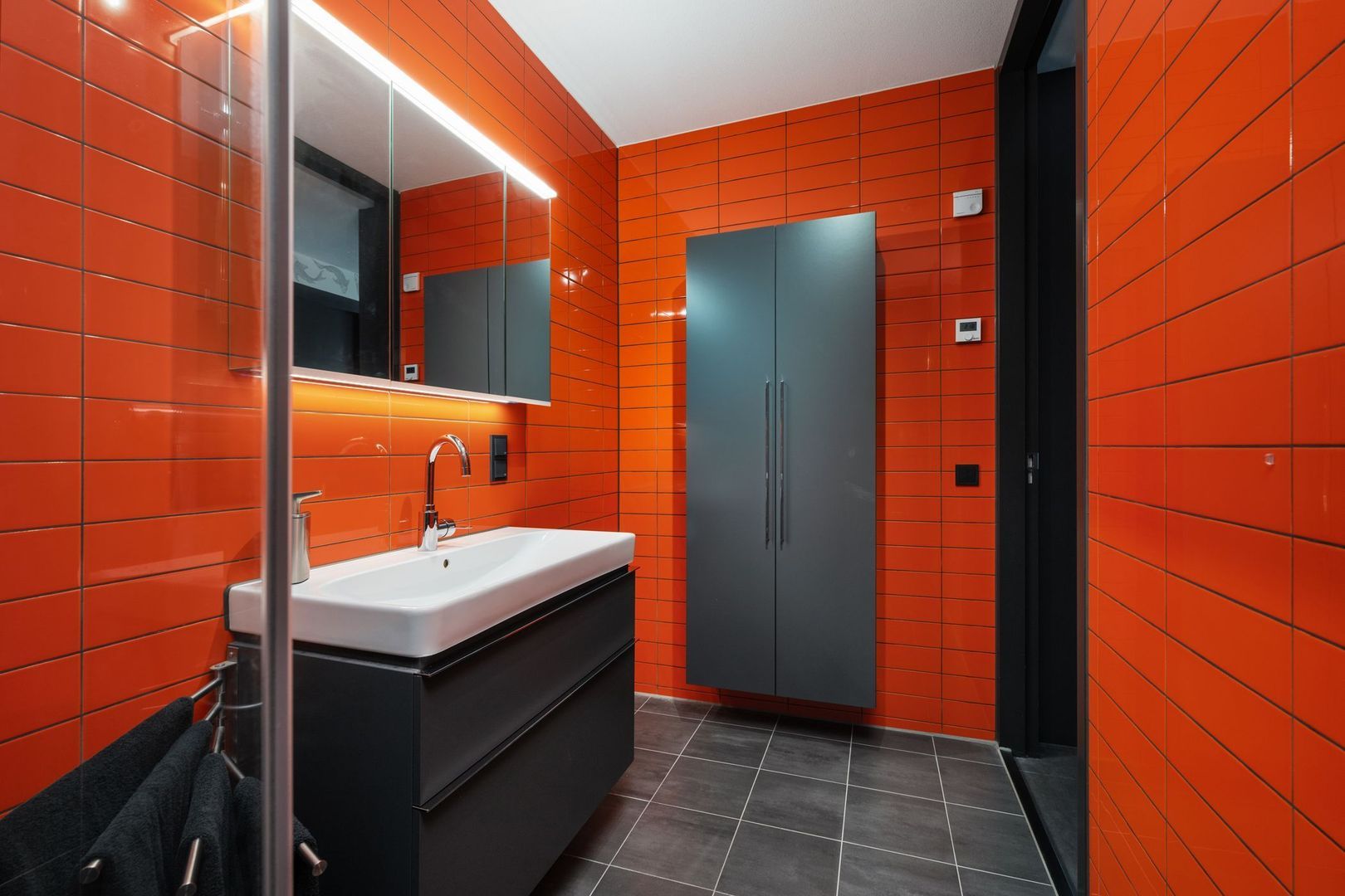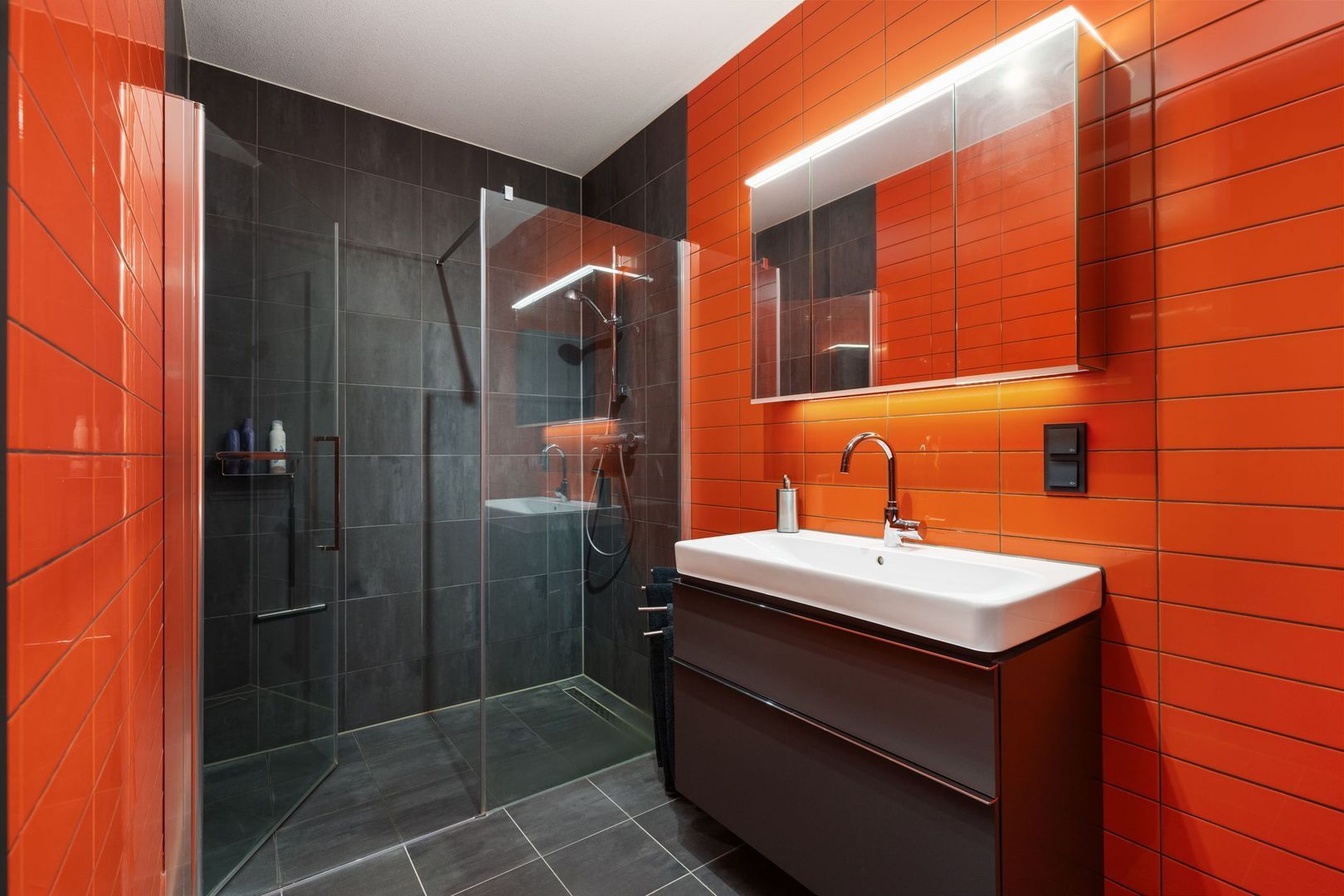 De badkamer is voorzien van een inloopdouche, wastafel en een spiegelkast met verlichting.