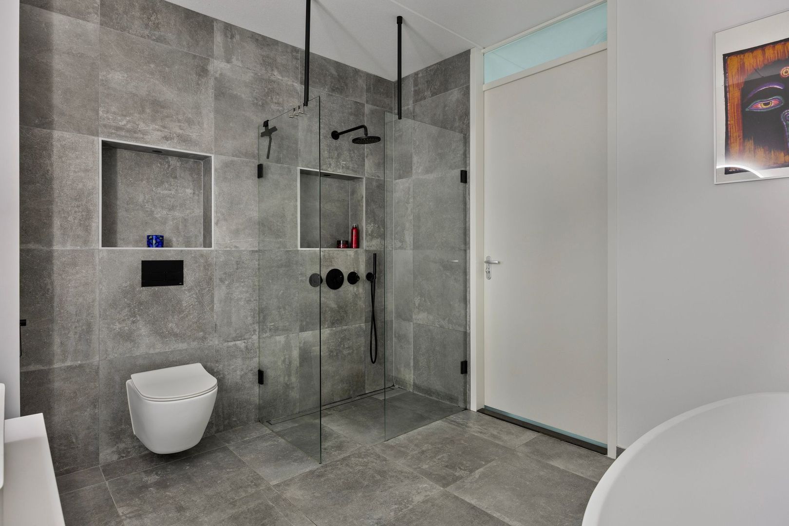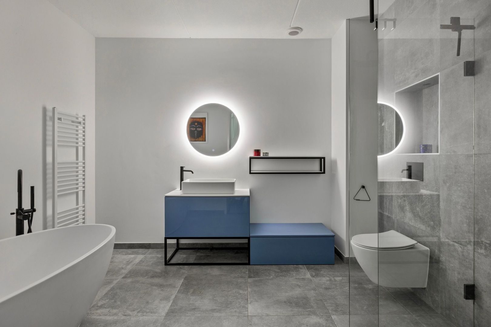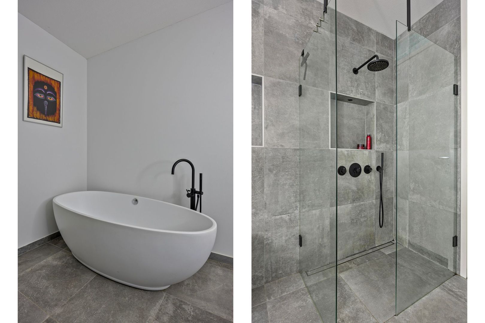 De ruime badkamer is voorzien van een douche, handdoekradiator, ligbad, wastafel en toilet.