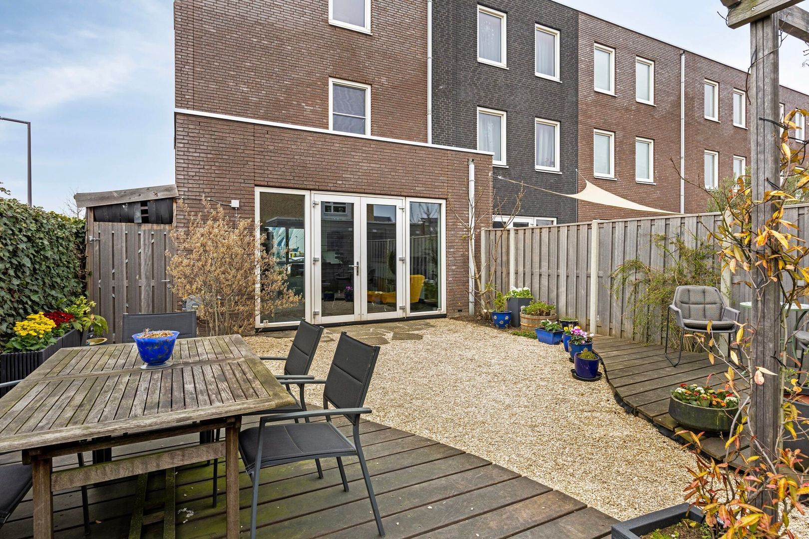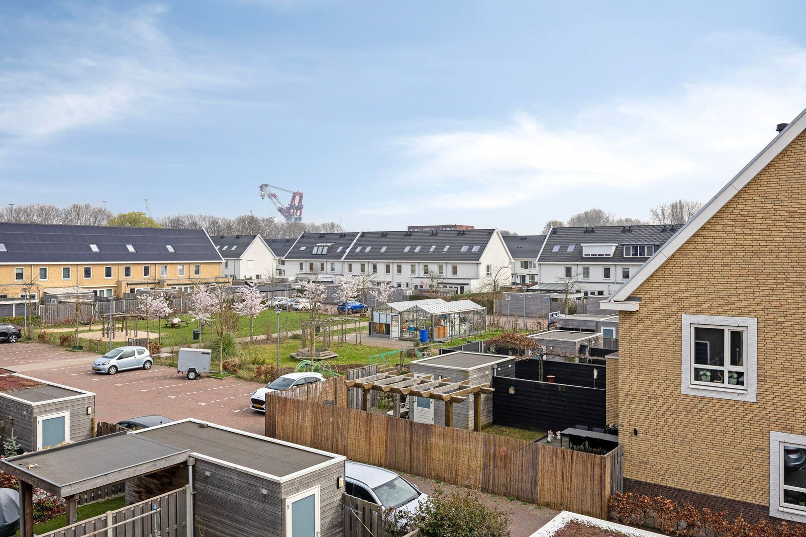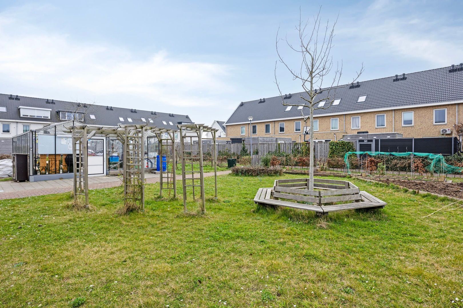 De achtertuin met berging is gelegen op het zuiden. Direct buiten de tuin bevindt zich de eigen parkeerplaats met oplader voor een elektrische auto. In de gezamenlijke binnentuin is extra buitenruimte gecreëerd met speel- en zitgelegenheid, een kas en een moestuin, waar kinderen zich volop kunnen uitleven op de speeltoestellen. Deze tuin, gedeeld eigendom, is een fijne plek voor ontspanning en gezelligheid.