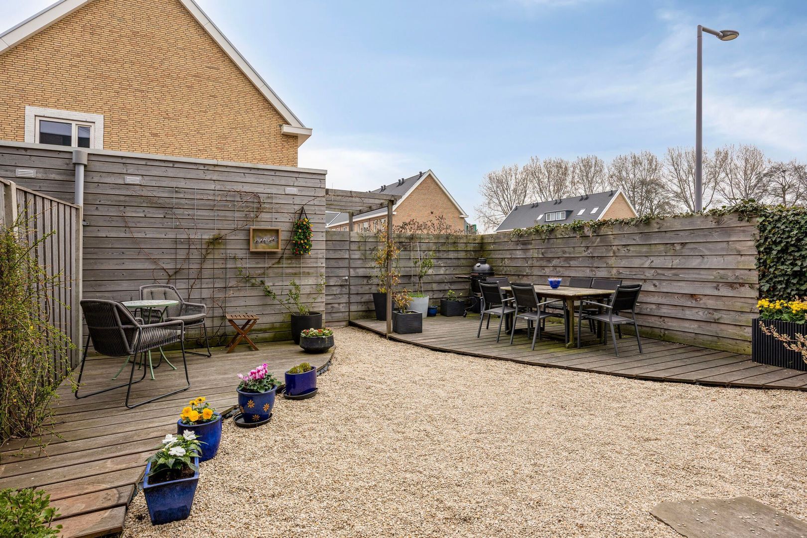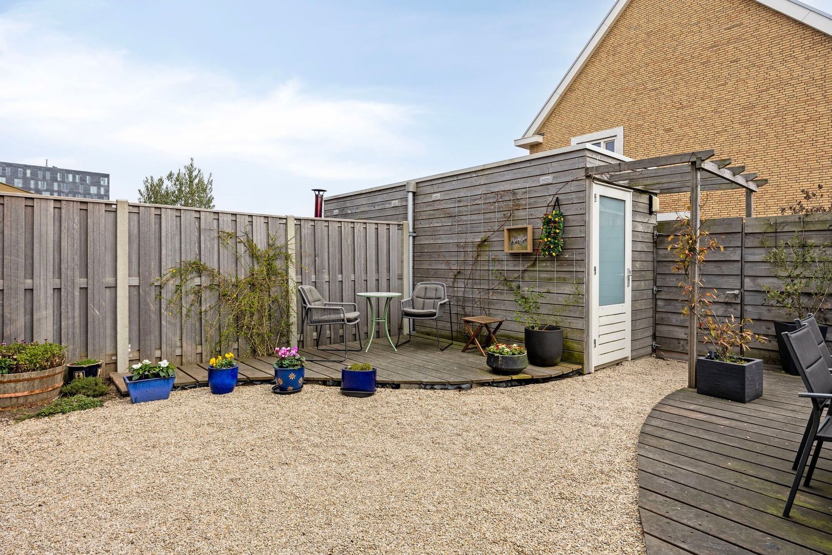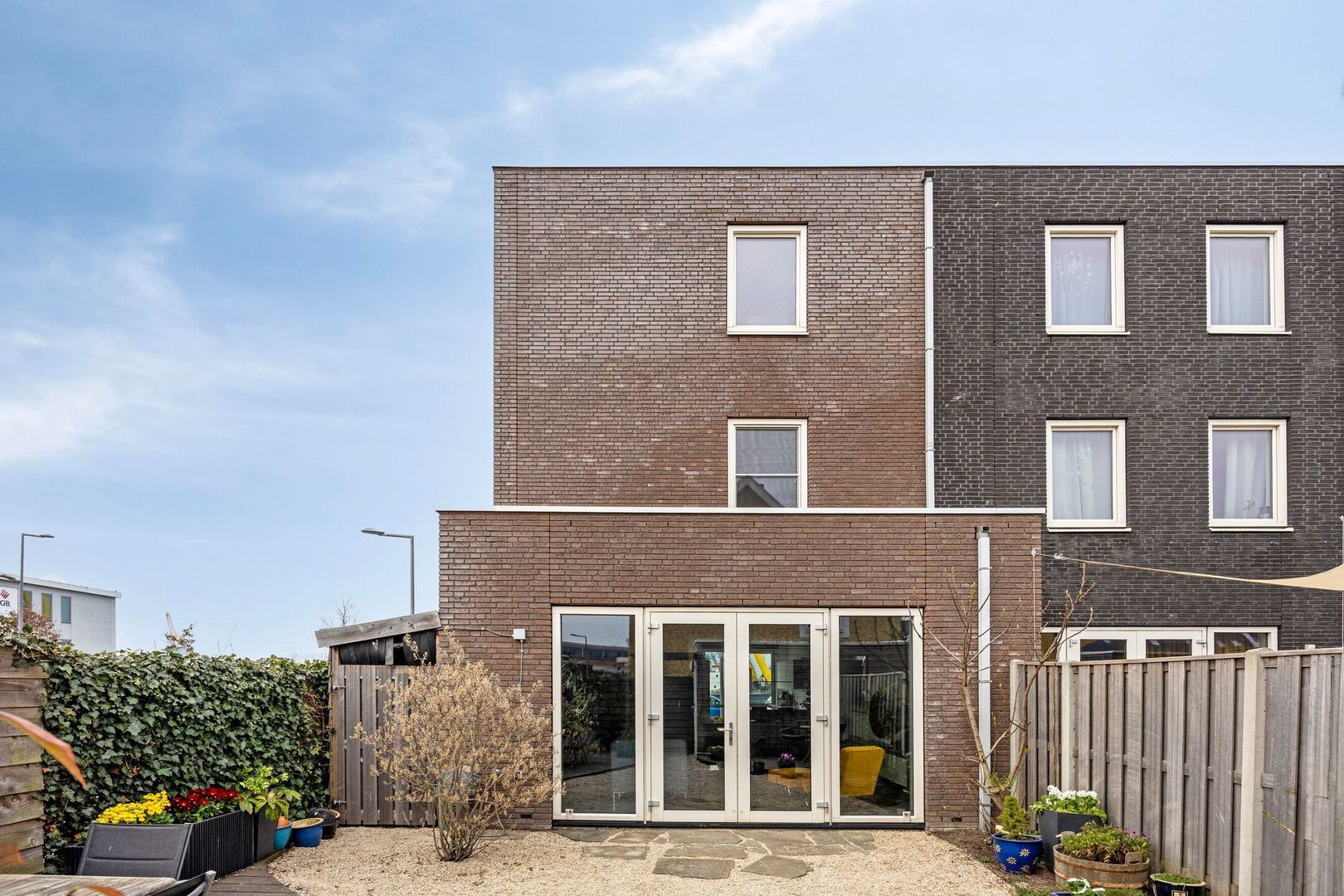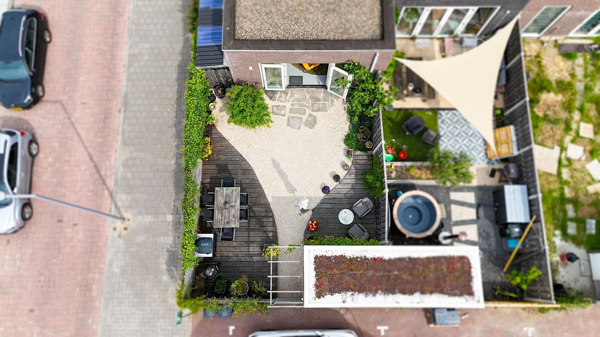 De achtertuin met berging is gelegen op het zuiden. Direct buiten de tuin bevindt zich de eigen parkeerplaats met oplader voor een elektrische auto. In de gezamenlijke binnentuin is extra buitenruimte gecreëerd met speel- en zitgelegenheid, een kas en een moestuin, waar kinderen zich volop kunnen uitleven op de speeltoestellen. Deze tuin, gedeeld eigendom, is een fijne plek voor ontspanning en gezelligheid.