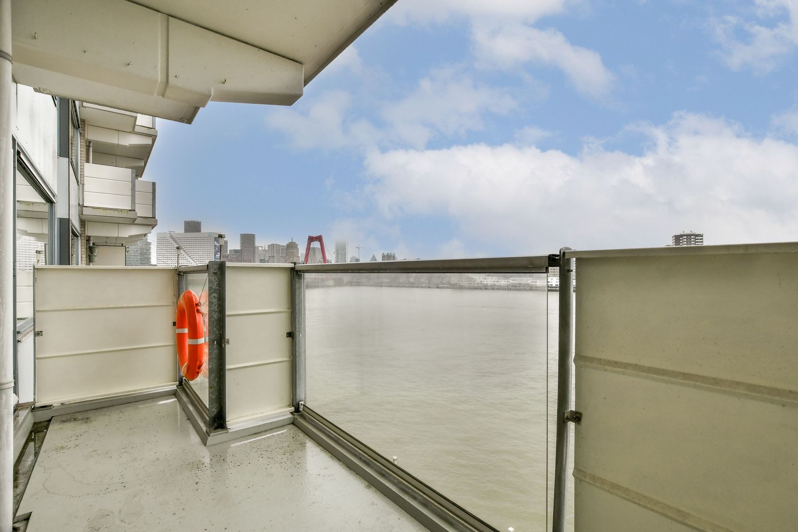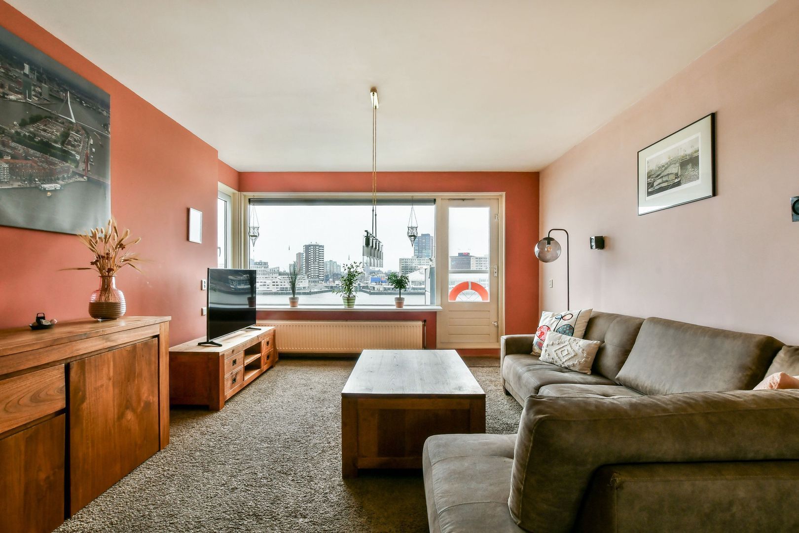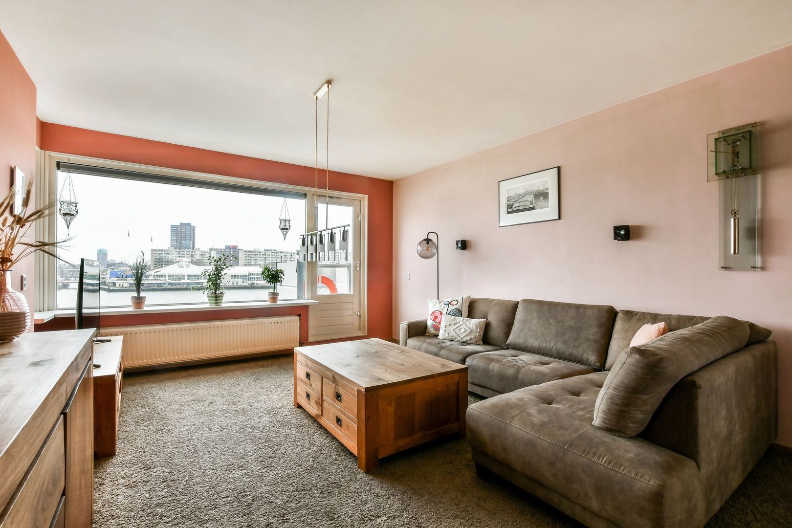 De ruime en lichte woonkamer beschikt over een fantastisch uitzicht over de Maas. Aansluitend bevindt zich de keuken. Vanuit de woonkamer is er toegang tot het balkon, dat direct aan de Maas is gelegen. Een heerlijke plek om ’s ochtends te genieten van een kop koffie of ’s avonds te dineren met een prachtig uitzicht over Rotterdam.