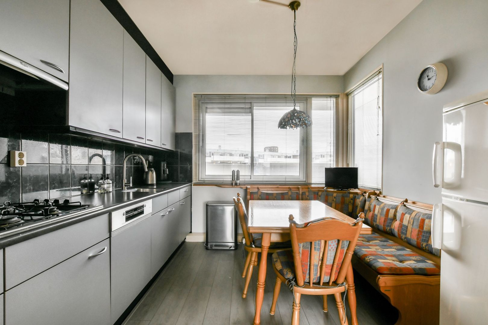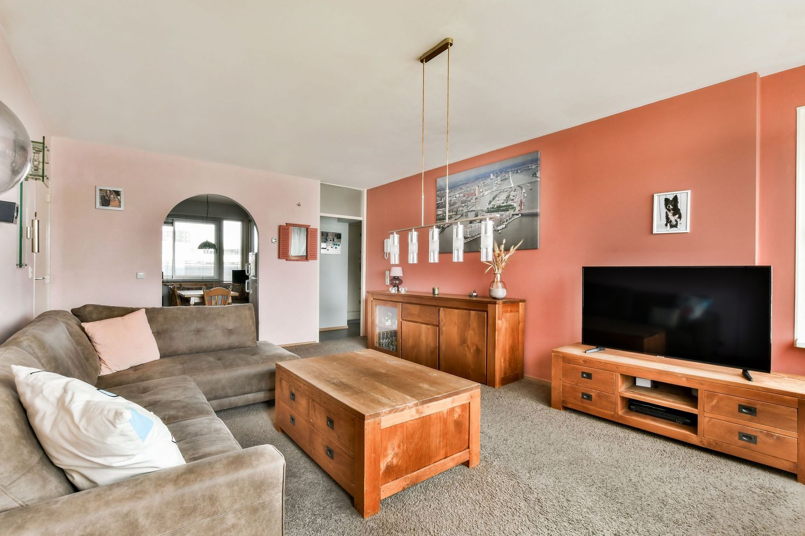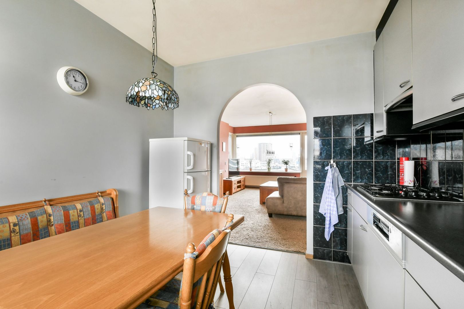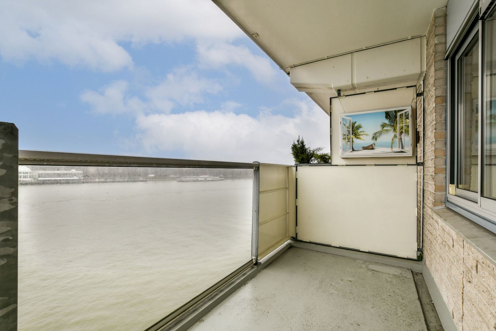 De ruime en lichte woonkamer beschikt over een fantastisch uitzicht over de Maas. Aansluitend bevindt zich de keuken. Vanuit de woonkamer is er toegang tot het balkon, dat direct aan de Maas is gelegen. Een heerlijke plek om ’s ochtends te genieten van een kop koffie of ’s avonds te dineren met een prachtig uitzicht over Rotterdam.