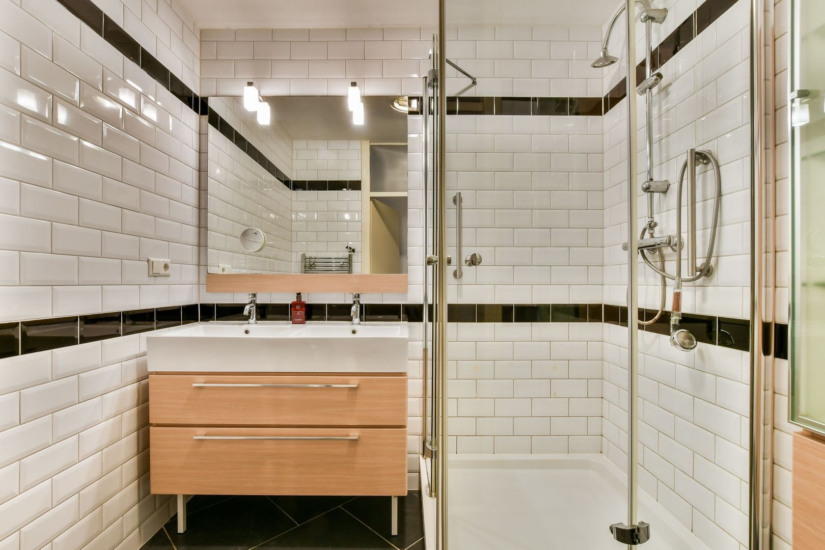De badkamer is uitgerust met een douche, dubbelle wastafel en handdoekradiator.