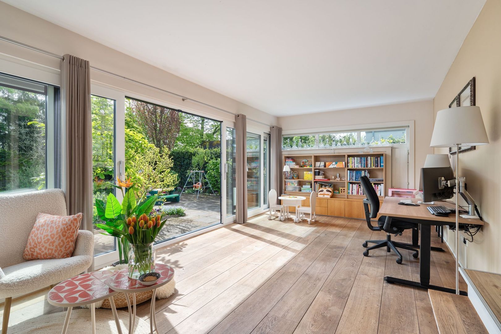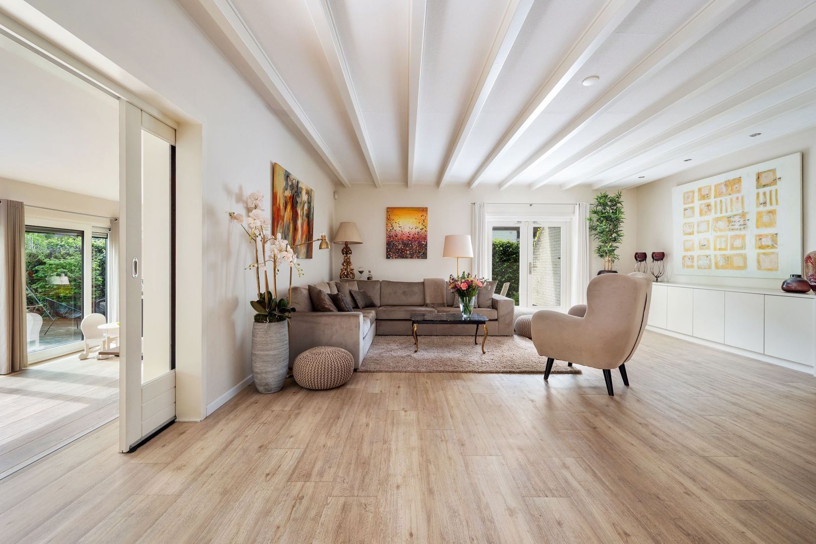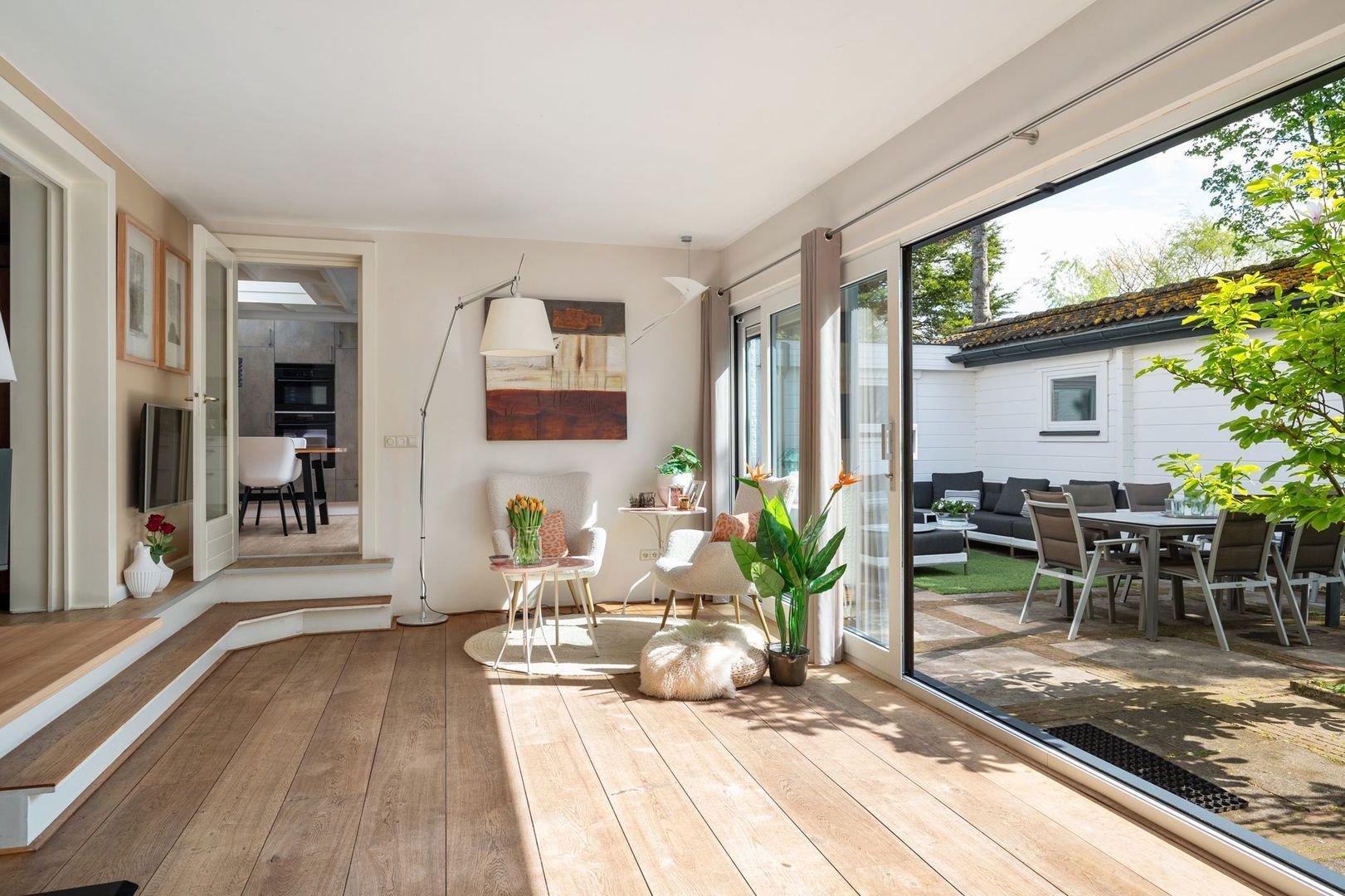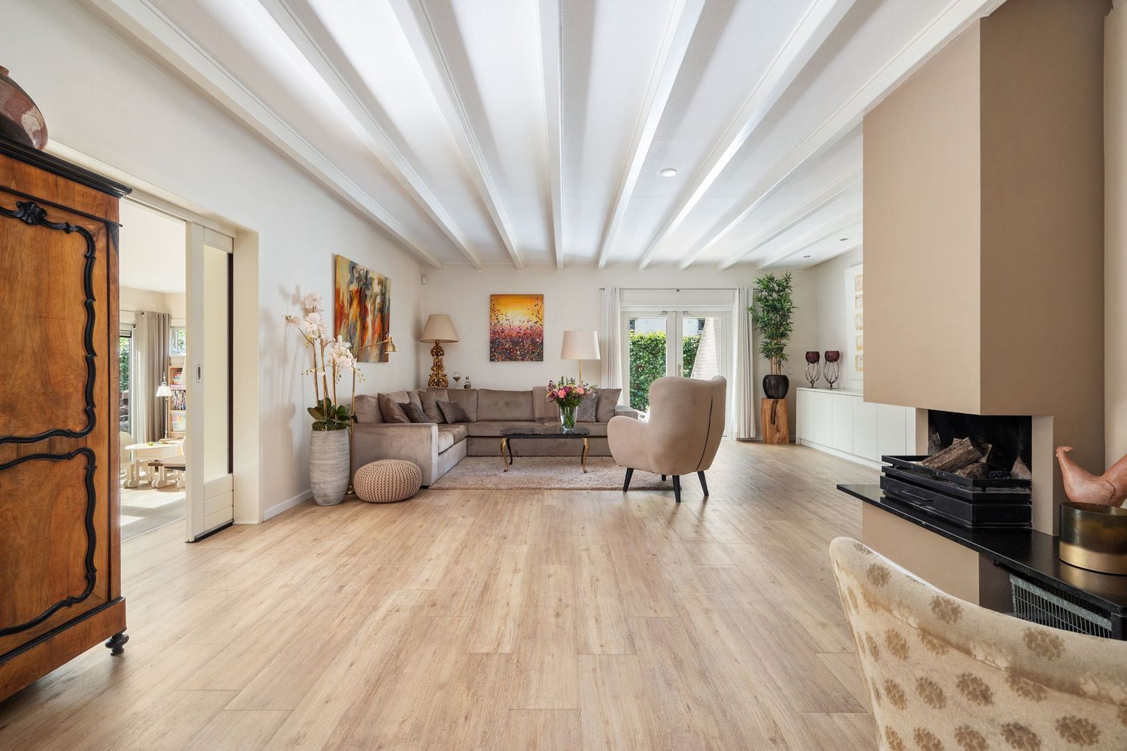 De sfeervolle woonkamer is ruim en licht, met vloerverwarming, een open haard en openslaande deuren naar de achtertuin. De aangrenzende tuinkamer is een volwaardige extra leefruimte, met veel lichtinval en een directe verbinding met buiten.
