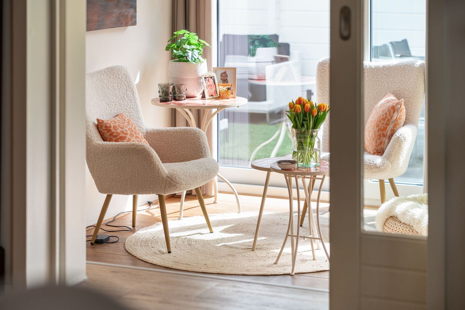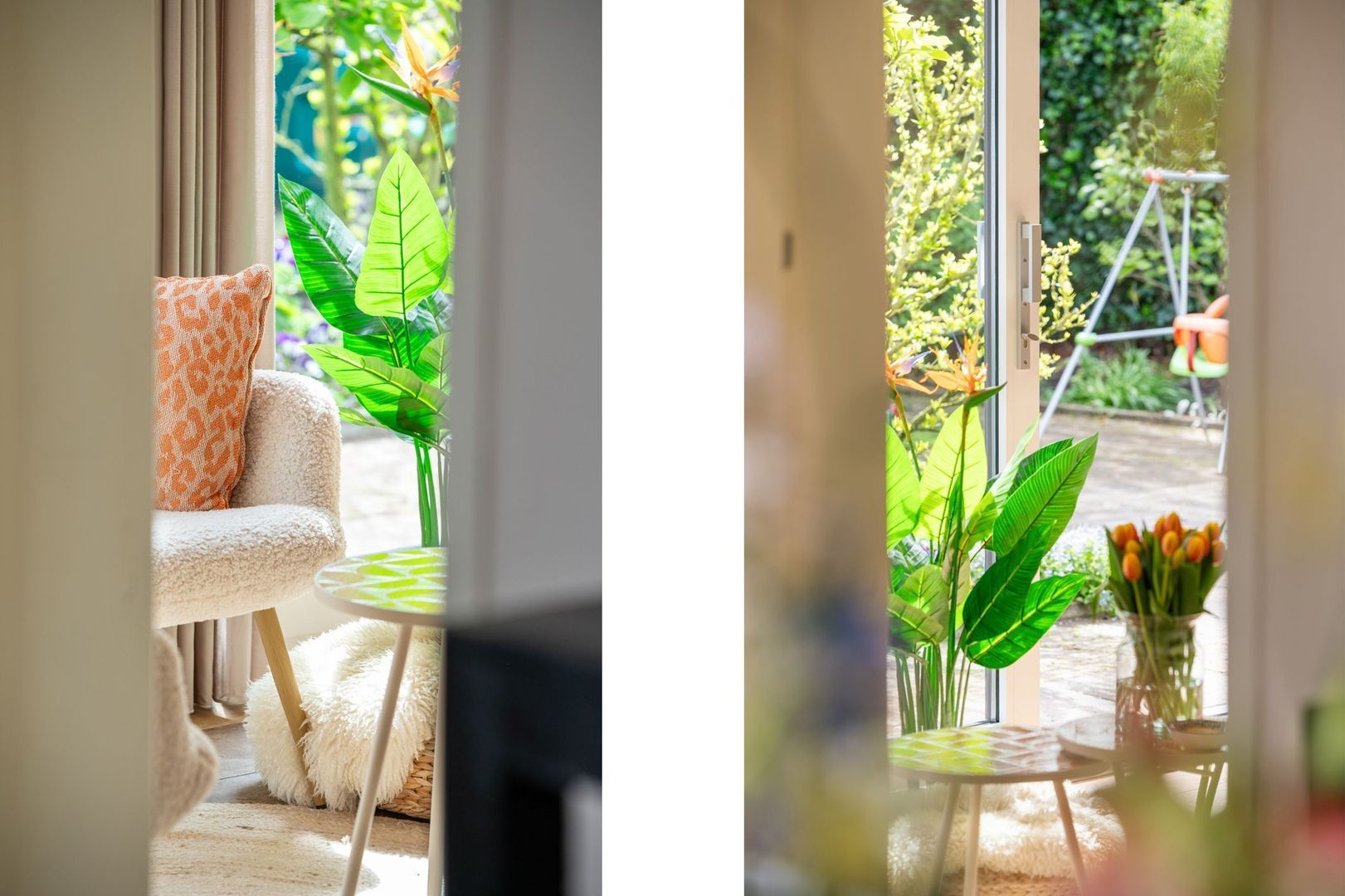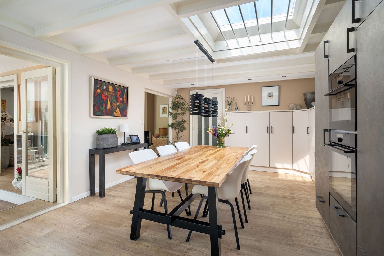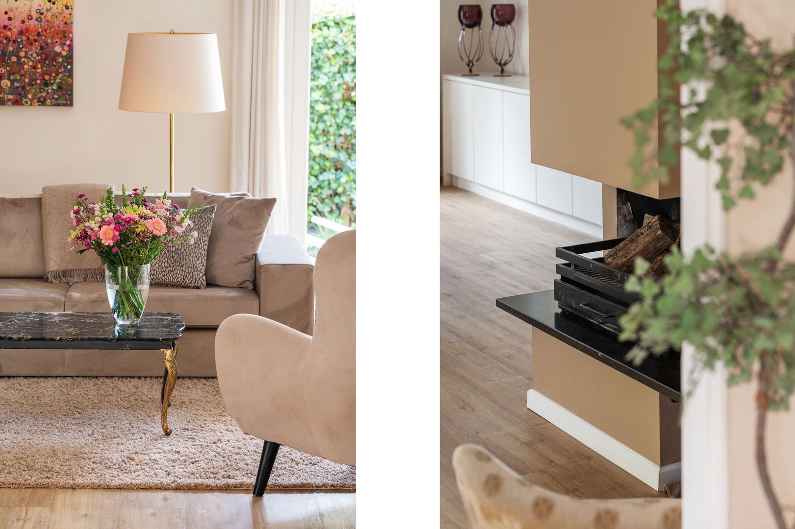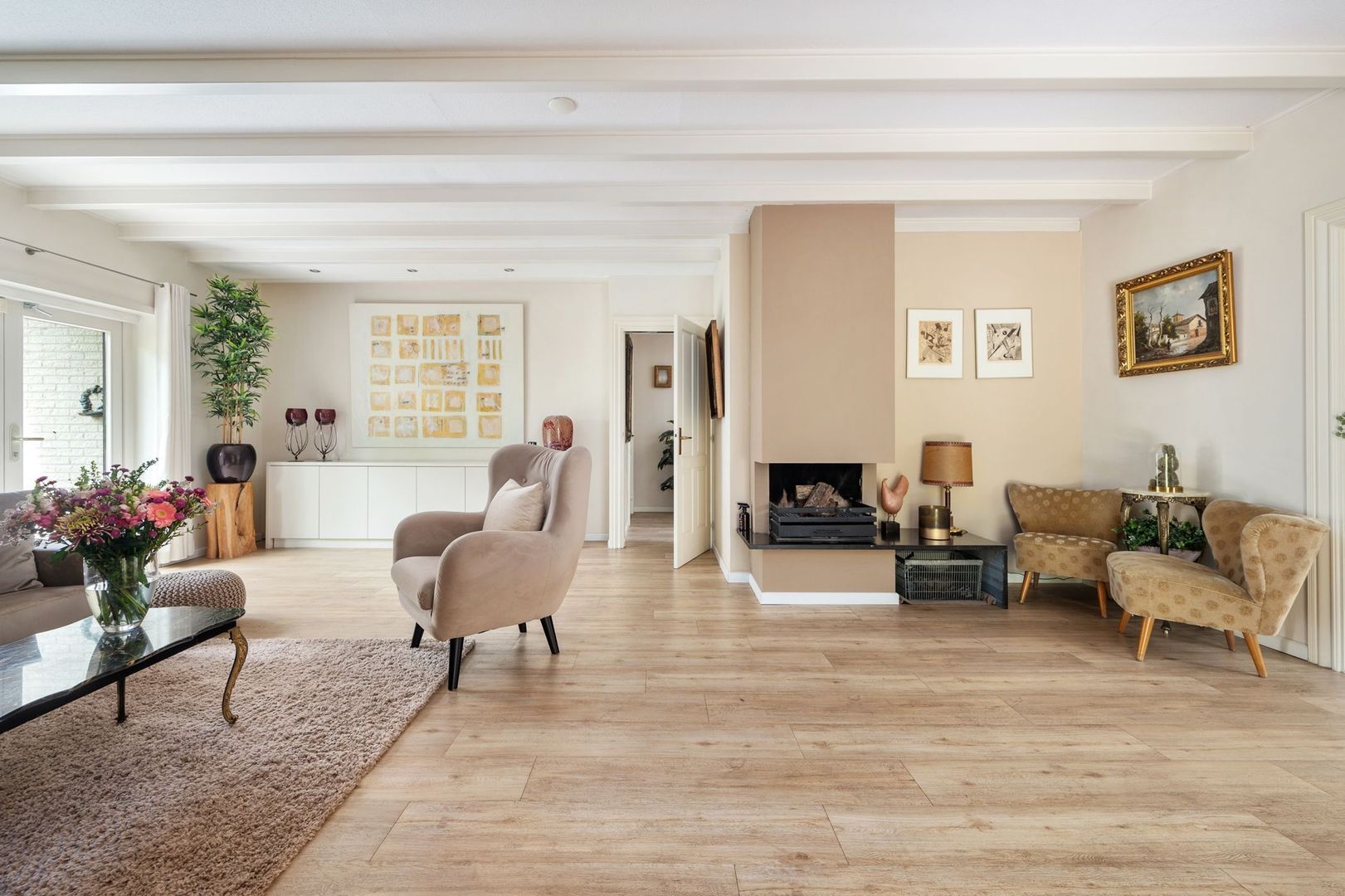 De sfeervolle woonkamer is ruim en licht, met vloerverwarming, een open haard en openslaande deuren naar de achtertuin. De aangrenzende tuinkamer is een volwaardige extra leefruimte, met veel lichtinval en een directe verbinding met buiten.