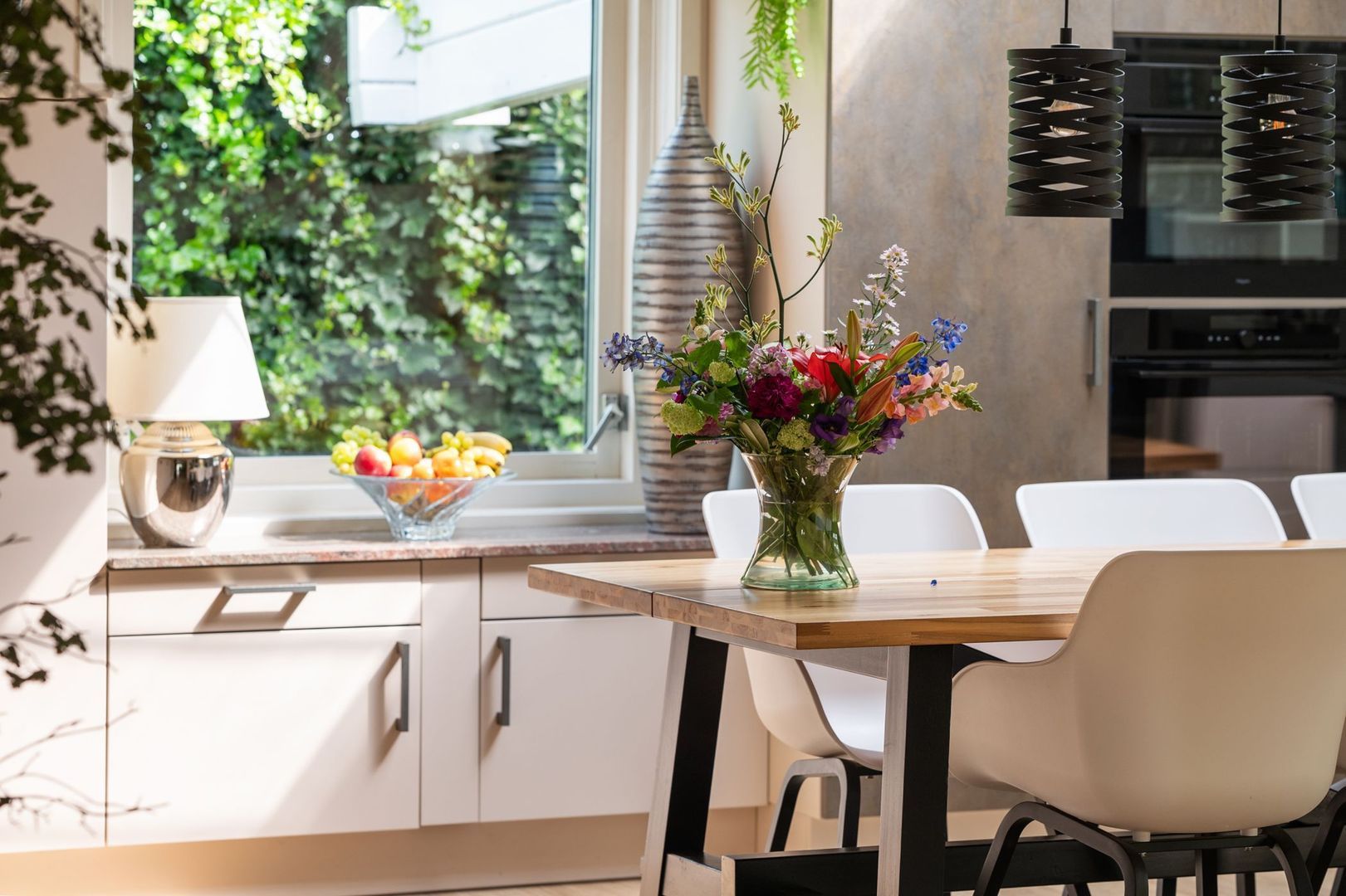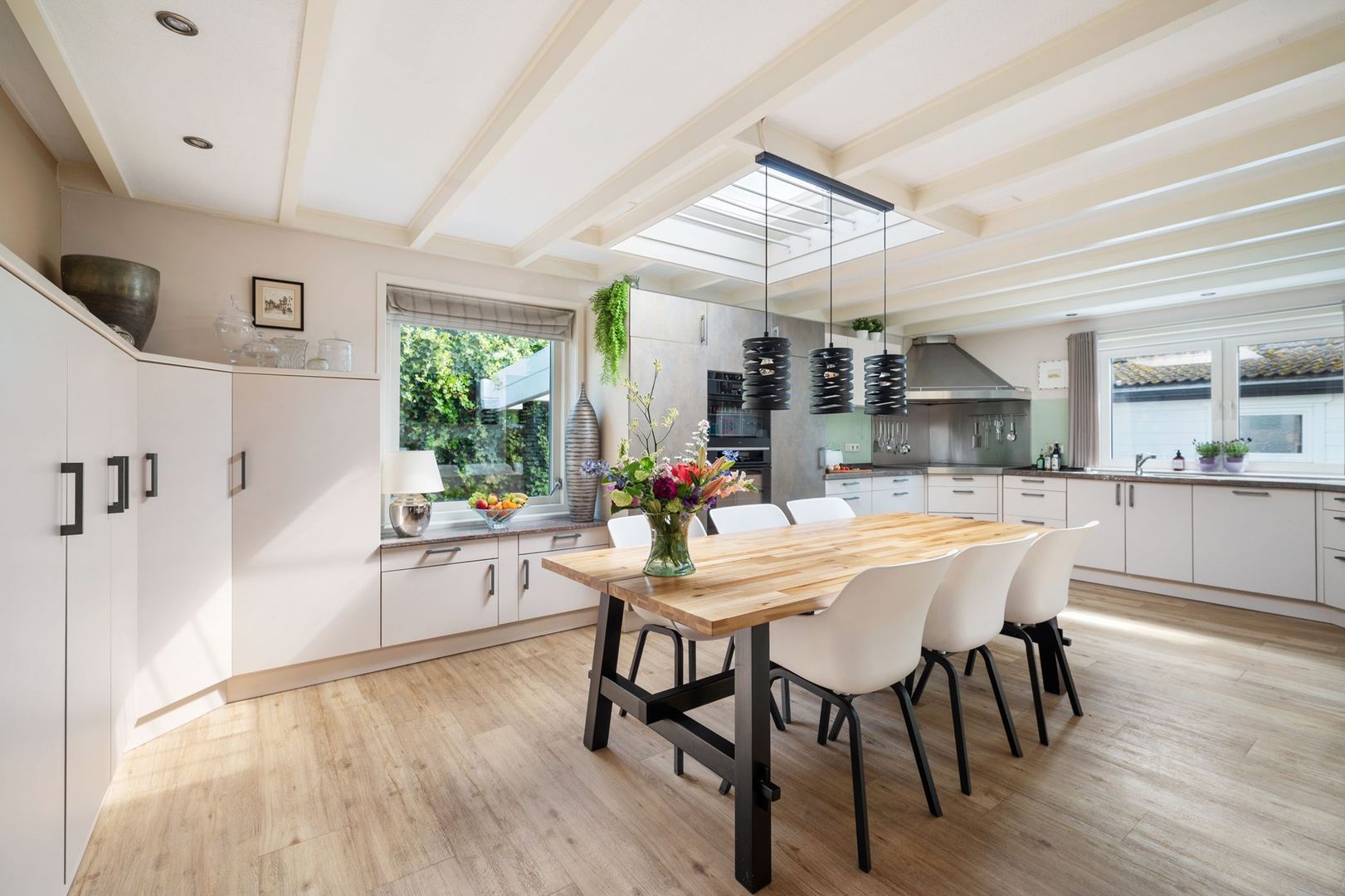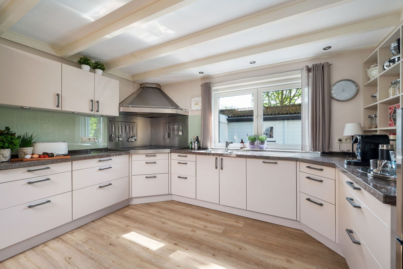 De leefkeuken is voorzien van een granieten aanrechtblad en een lichtkoepel die voor veel natuurlijk licht zorgt. De keuken is uitgerust met diverse inbouwapparatuur, zoals een kookplaat, afzuigkap, oven, combi-oven, grote koelkast, vriezer en vaatwasser. De keuken is bereikbaar vanuit de woonkamer, de tuinkamer en de bijkeuken.