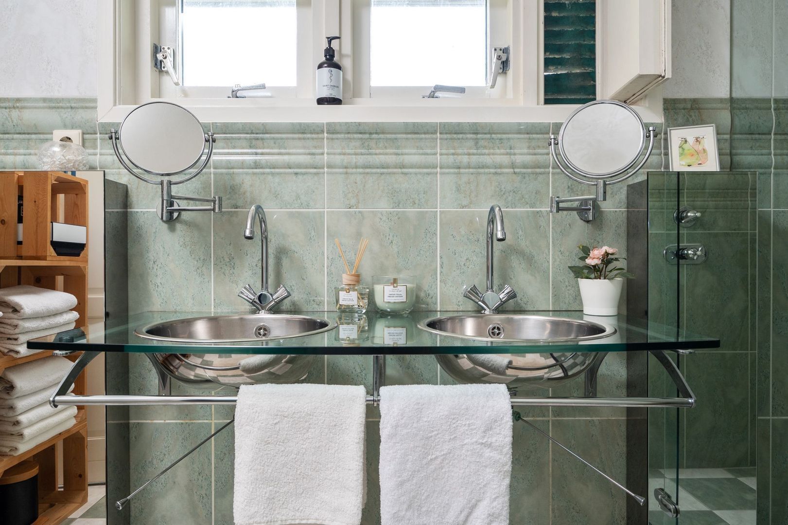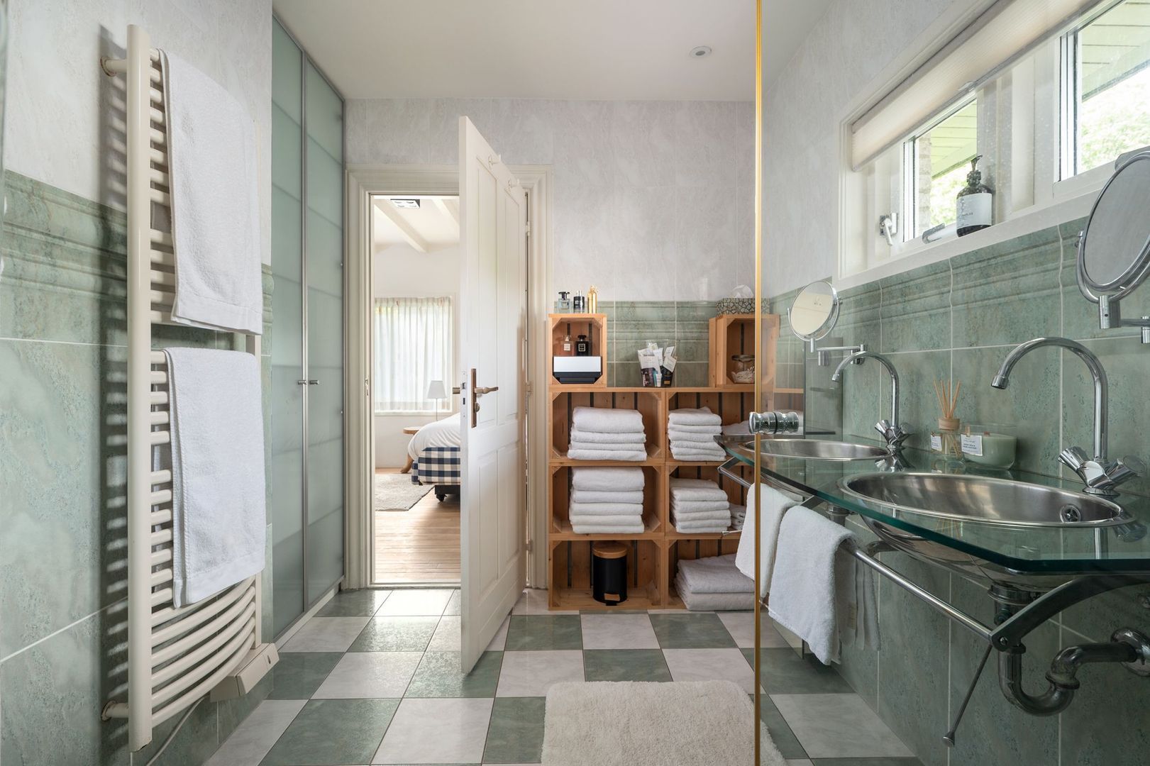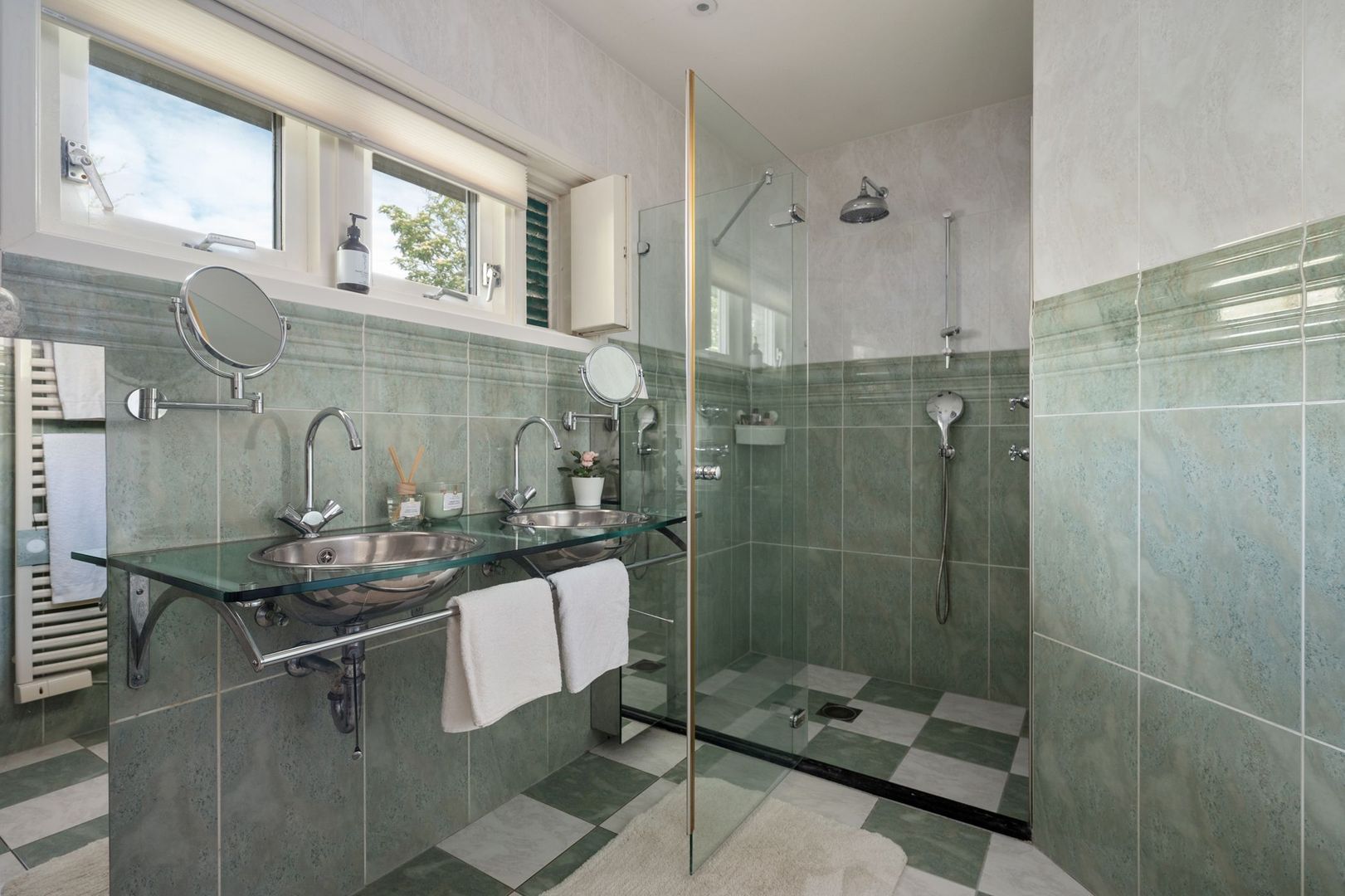 De tweede ruime slaapkamer op de begane grond is voorzien van vaste kasten en airconditioning. Deze slaapkamer heeft toegang tot de eerste badkamer, die geheel betegeld is en beschikt over een dubbele wastafel en een inloopdouche.