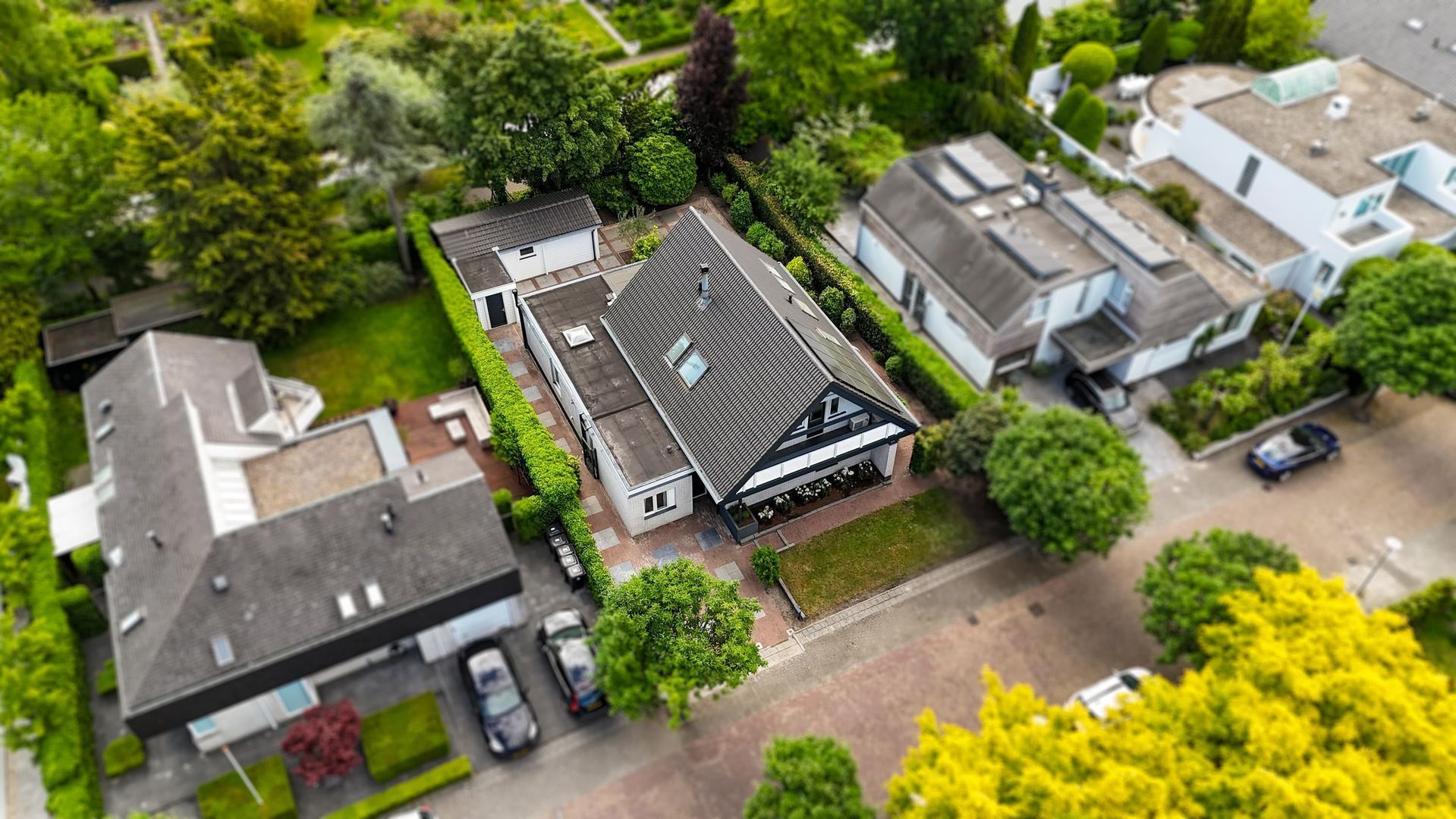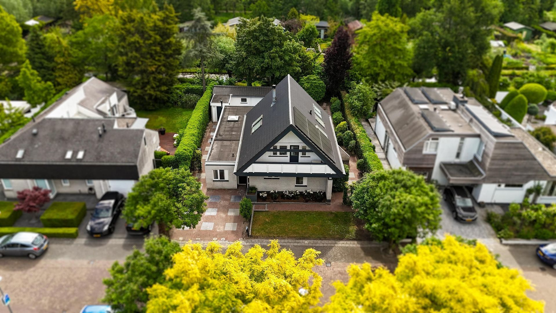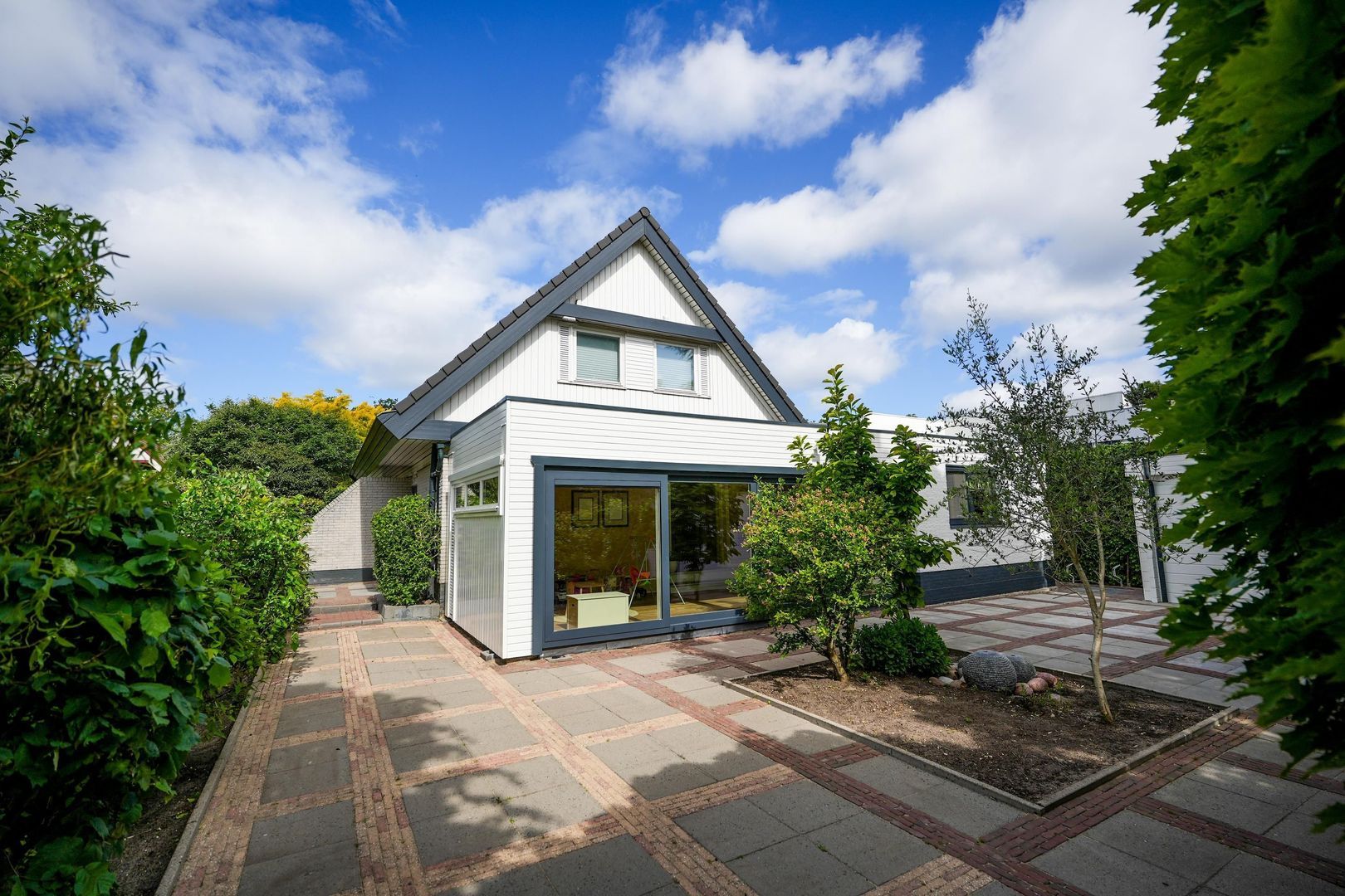 Voortuin met oprit voor meerdere auto’s.