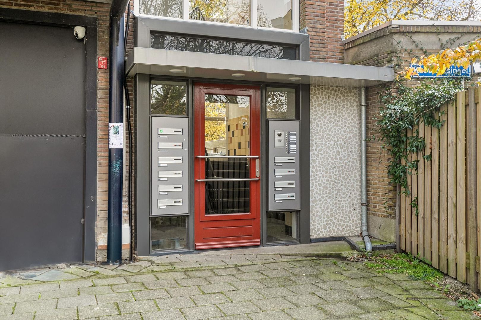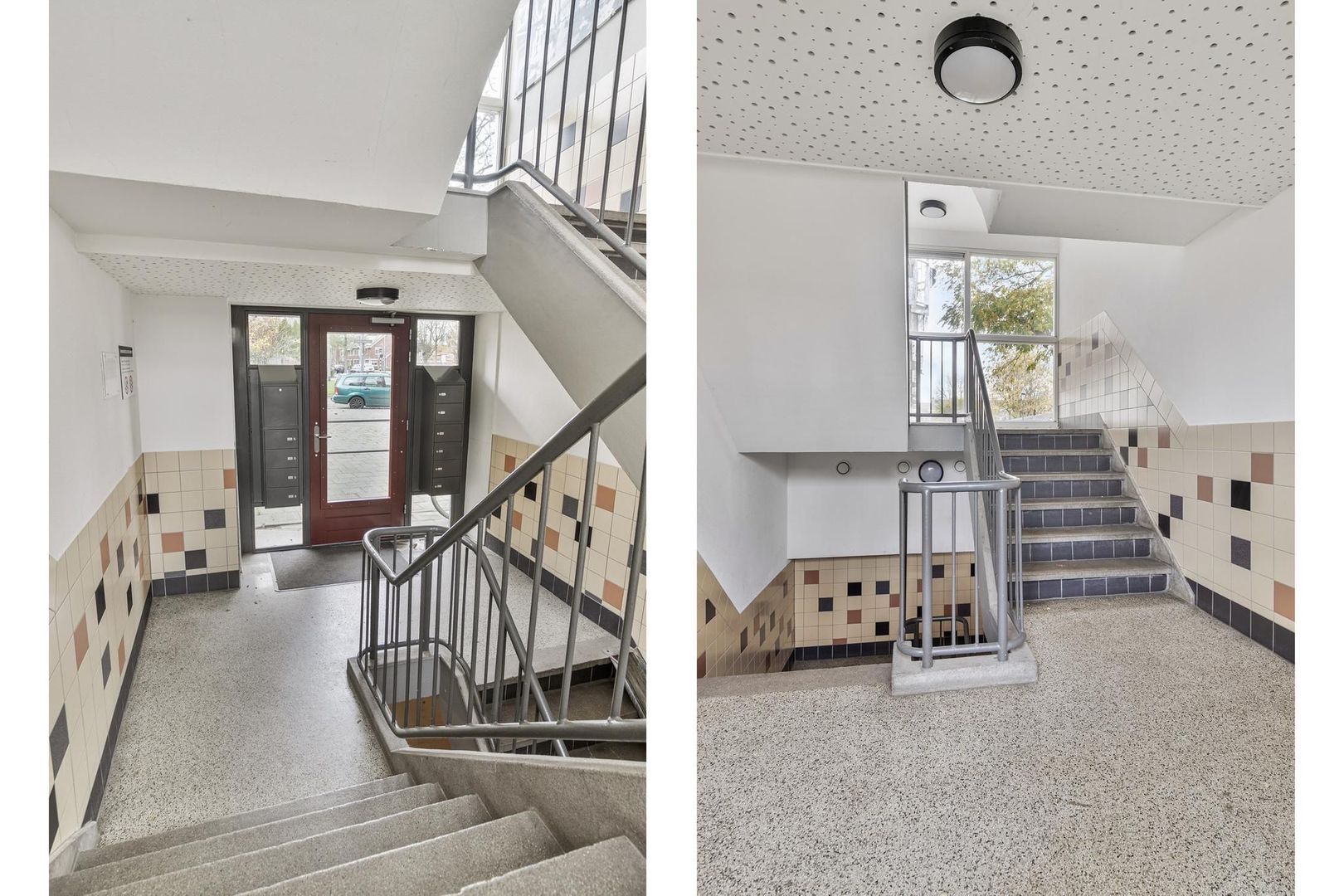 Gesloten portiek met bellentableau en brievenbussen, trap naar de 3e verdieping.