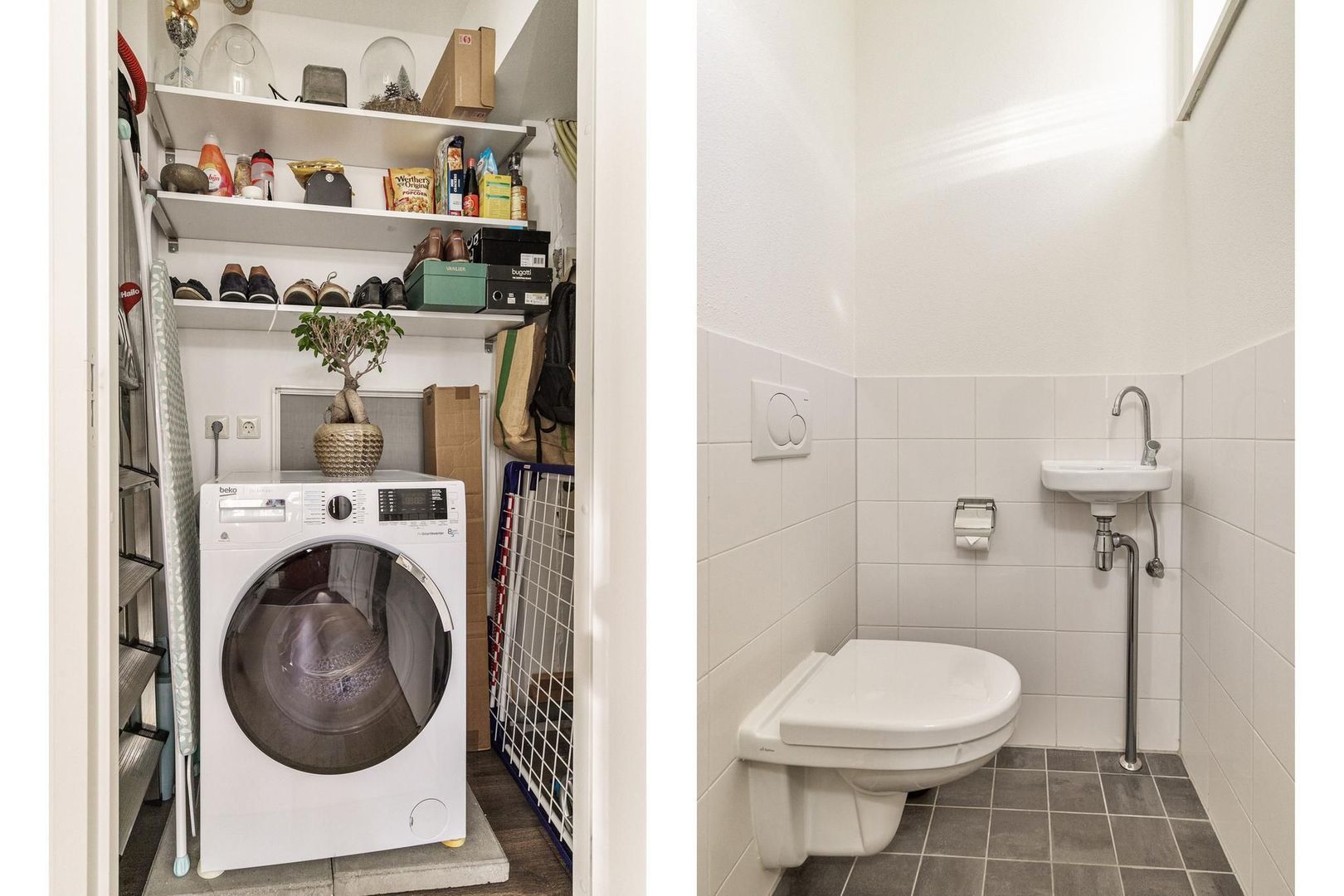 Entree, hal voorzien van toilet, opstalplaats cv ketel, en trapopgang naar de 4e verdieping. In de hal vindt u ook een berging met meterkast en aansluiting voor wasmachine en droger. Vanuit de hal is er toegang tot de L vormige keuken, deze is voorzien van vaatwasser, gasfornuis, koel-vries combinatie, combi-oven, afzuigkap en spoelbak met mengkraan.
