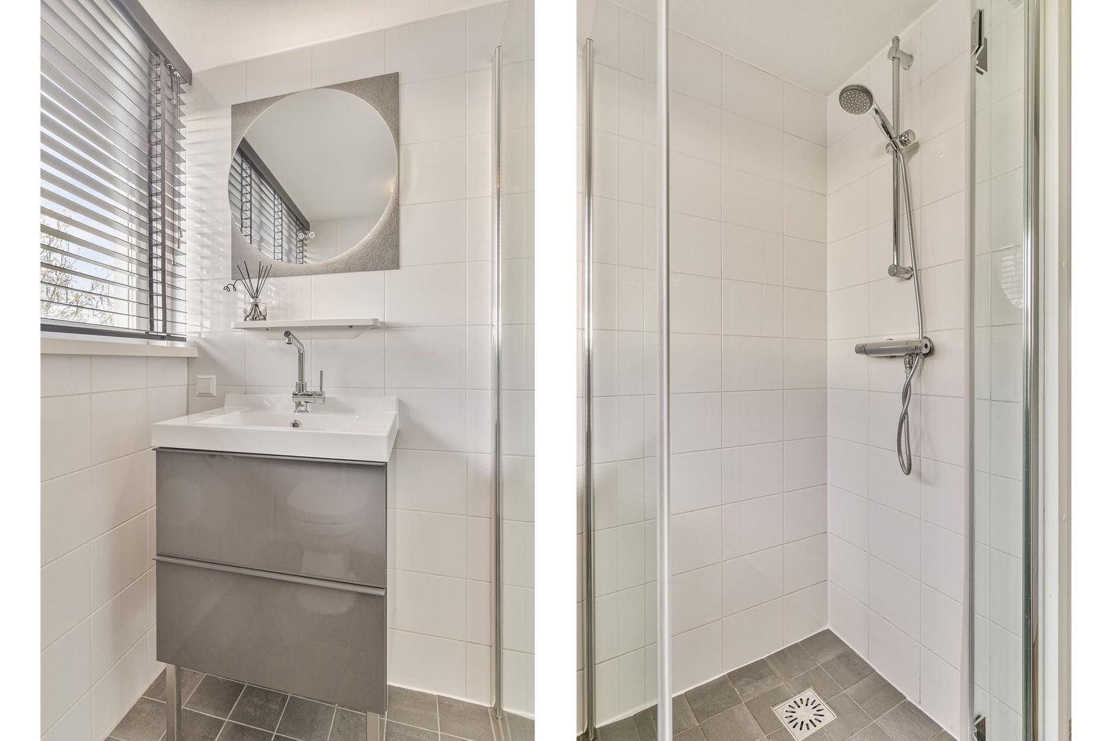 De keurige badkamer is voorzien van een douchcabine, toilet, wastafel met meubel en verlichte spiegel met verwarming.