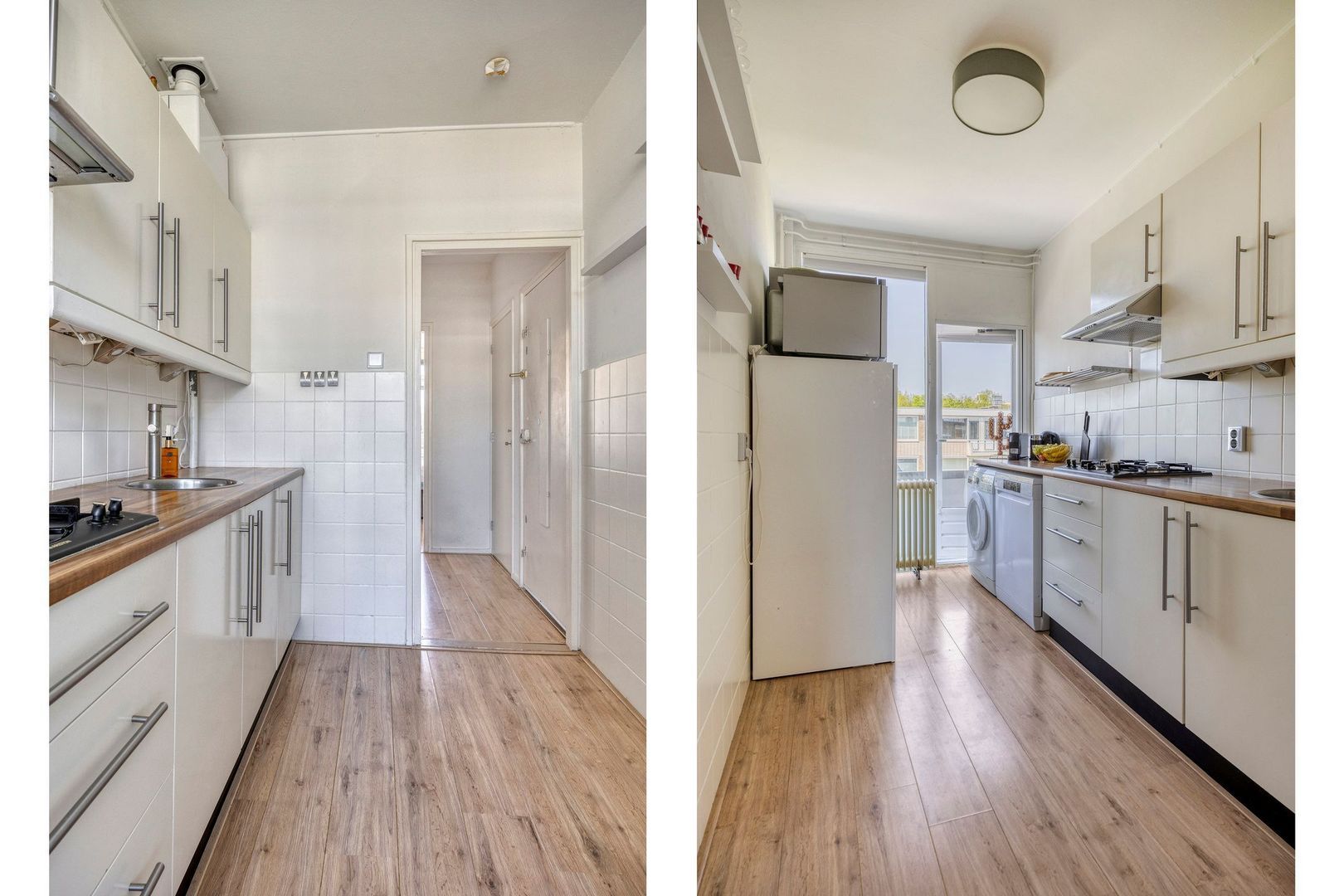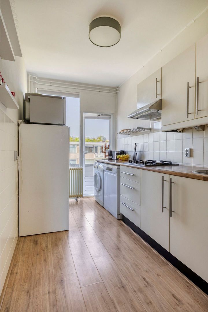De keuken, eveneens aan de voorzijde, beschikt over een 4-pits gasfornuis met afzuigkap, een vaatwasser, een aparte opstelplaats voor de wasmachine én toegang tot het tweede balkon.