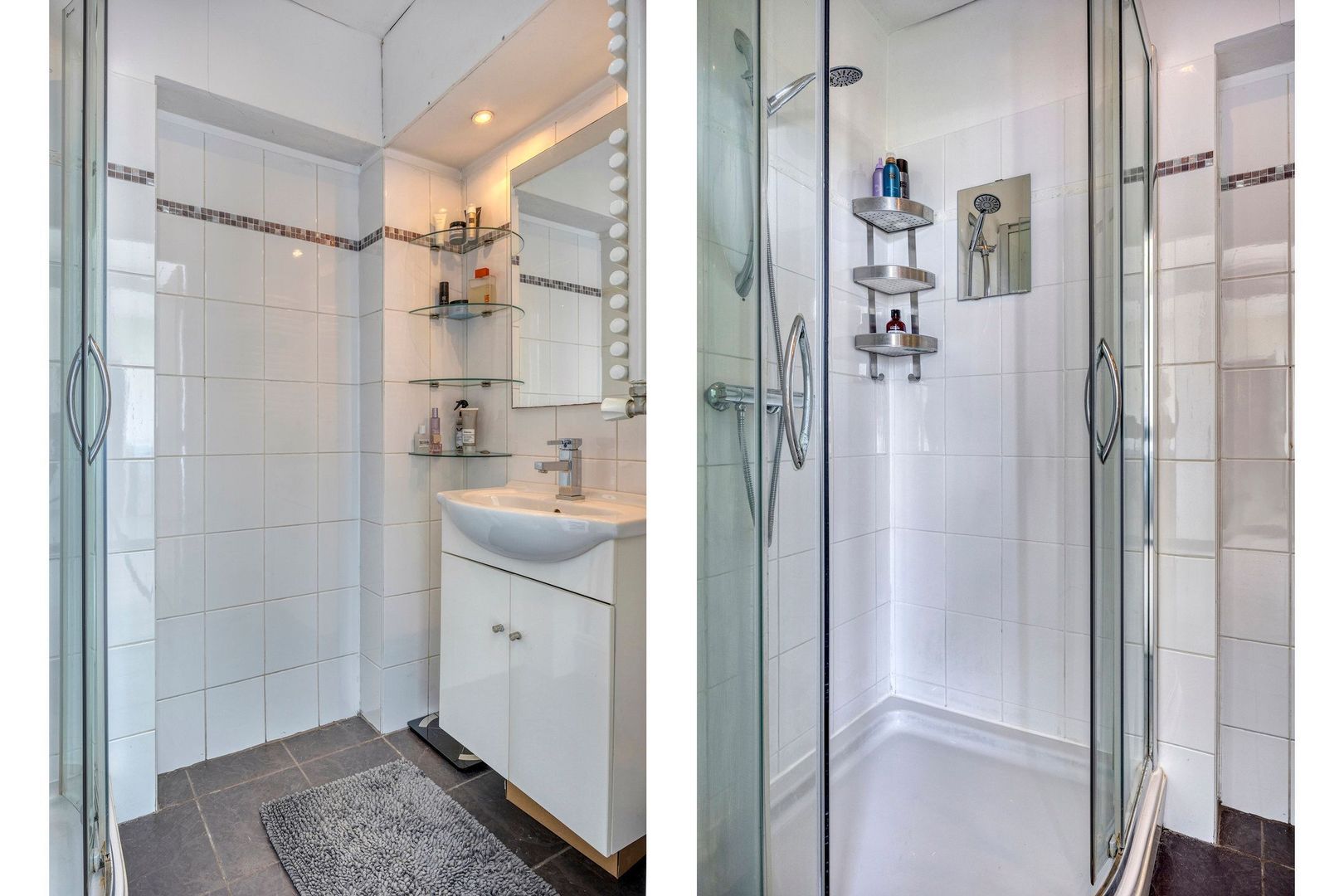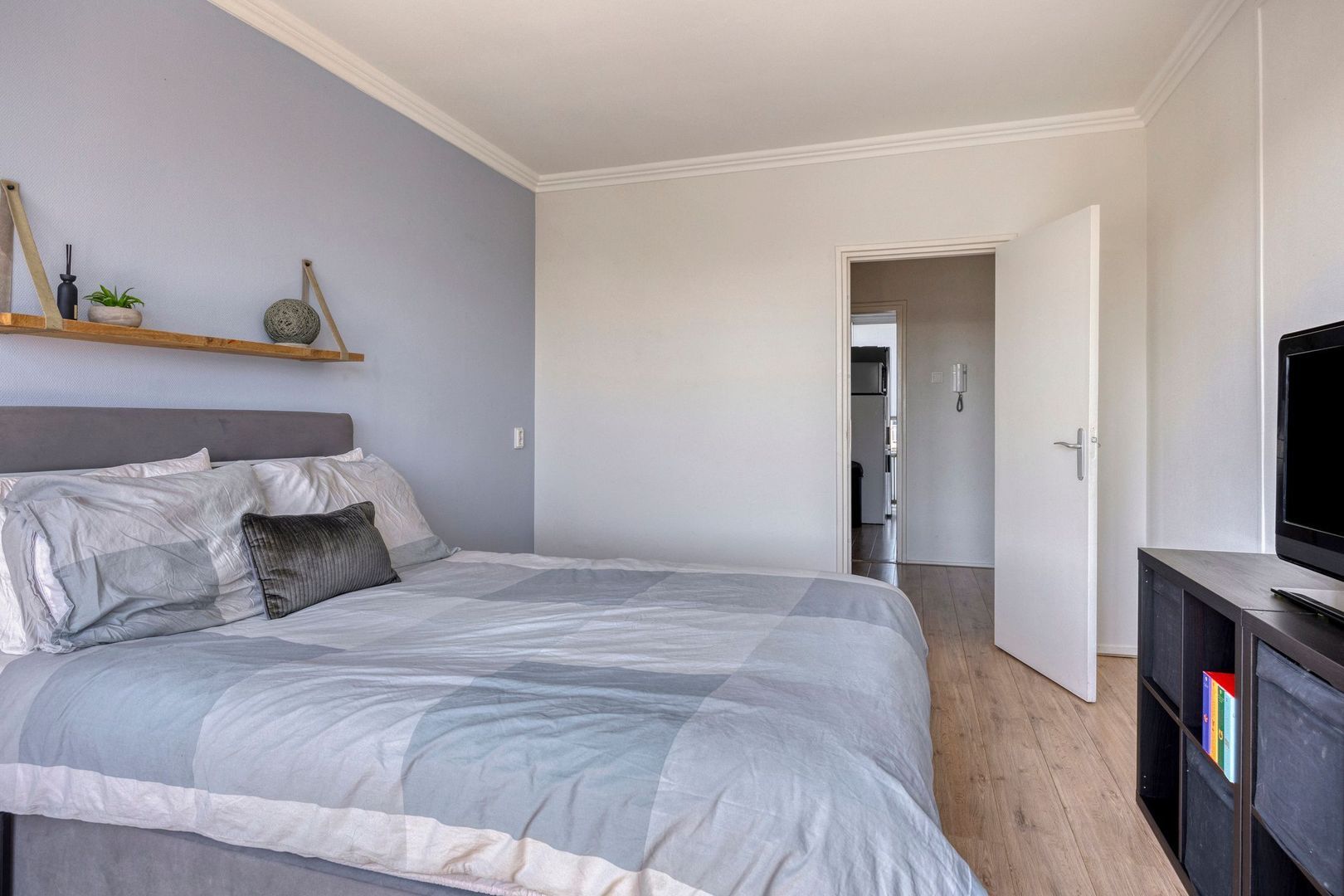 Aan de voorzijde van het appartement bevindt zich de tweede slaapkamer, die direct toegang biedt tot de badkamer. Deze is voorzien van een douche en een wastafelmeubel.