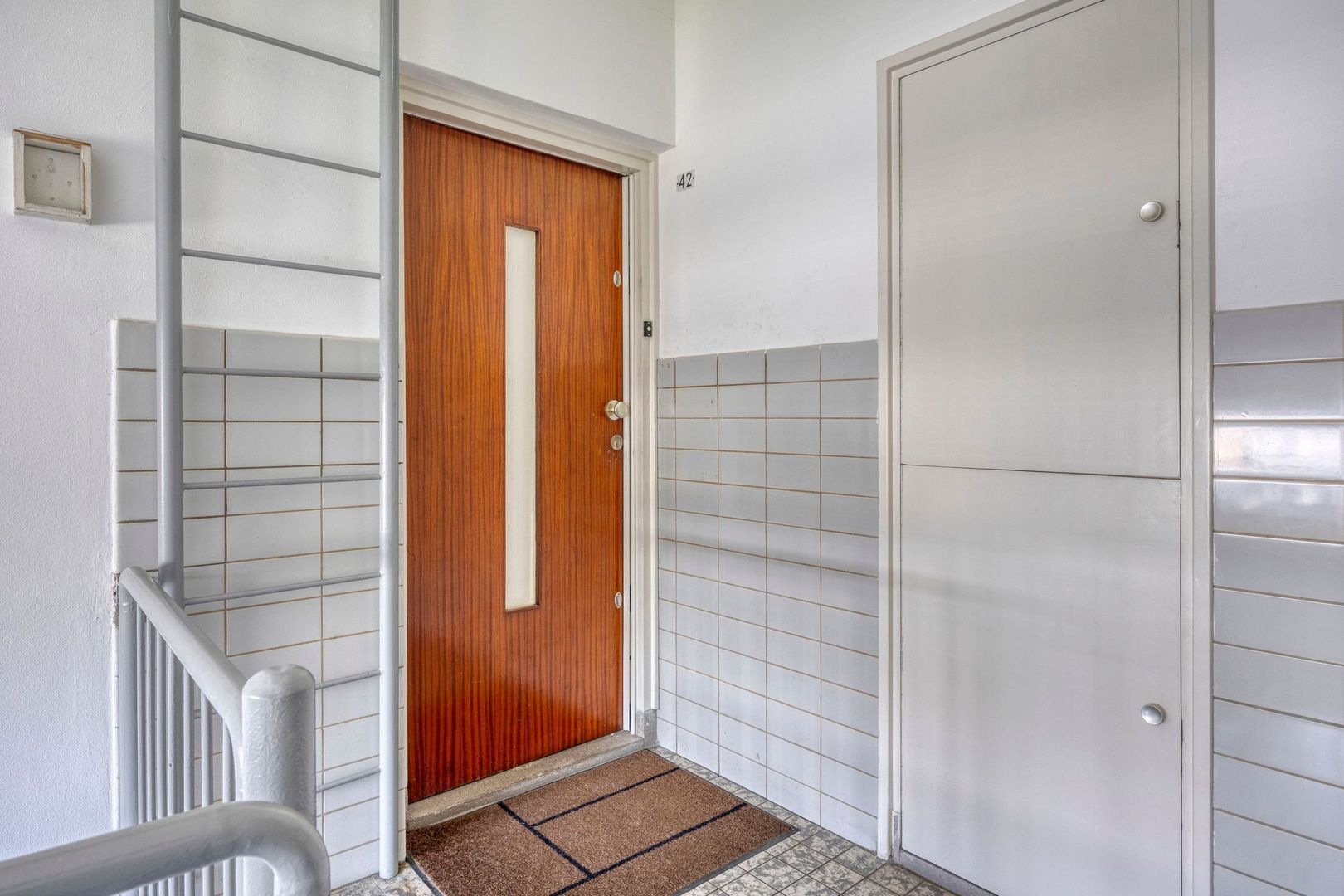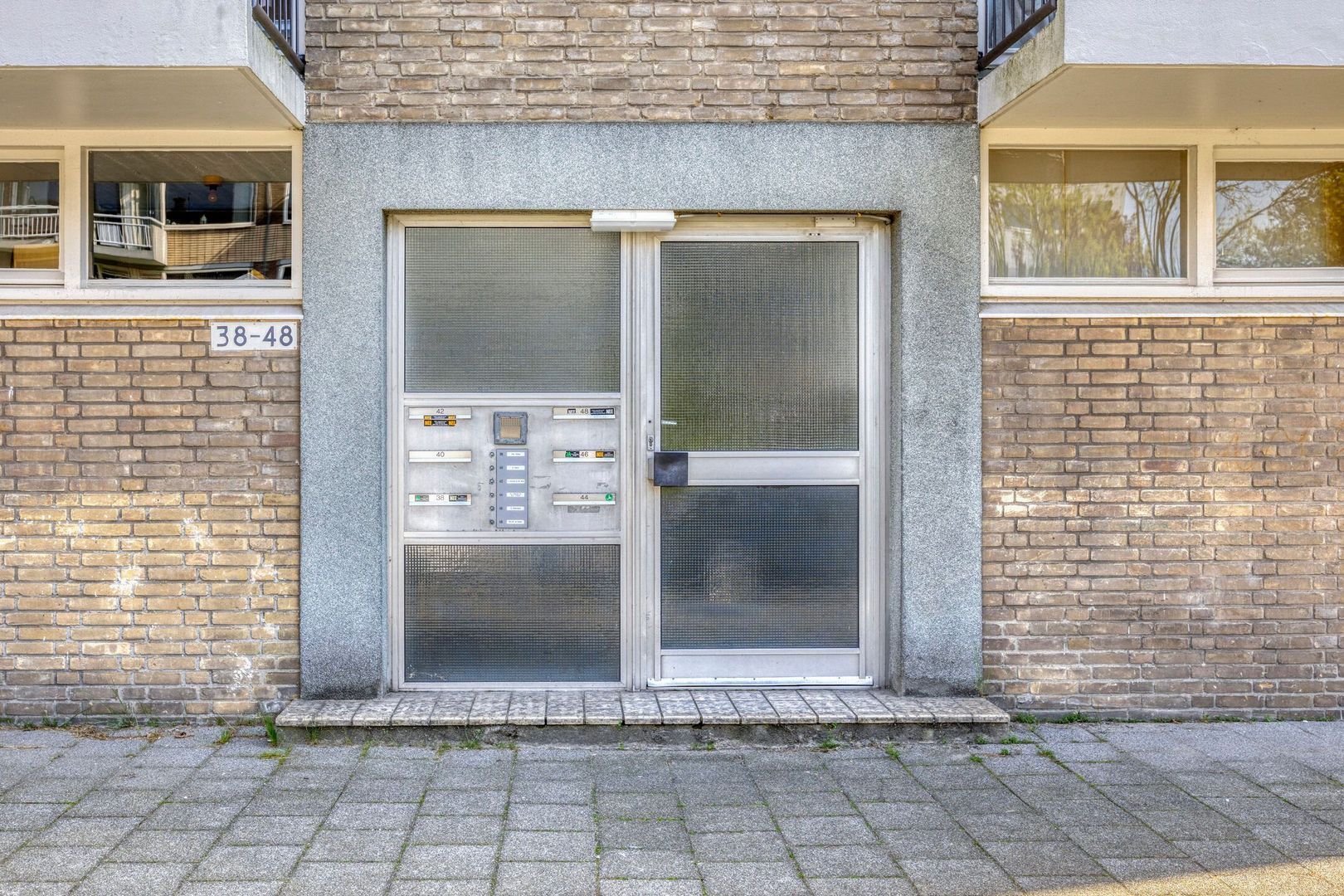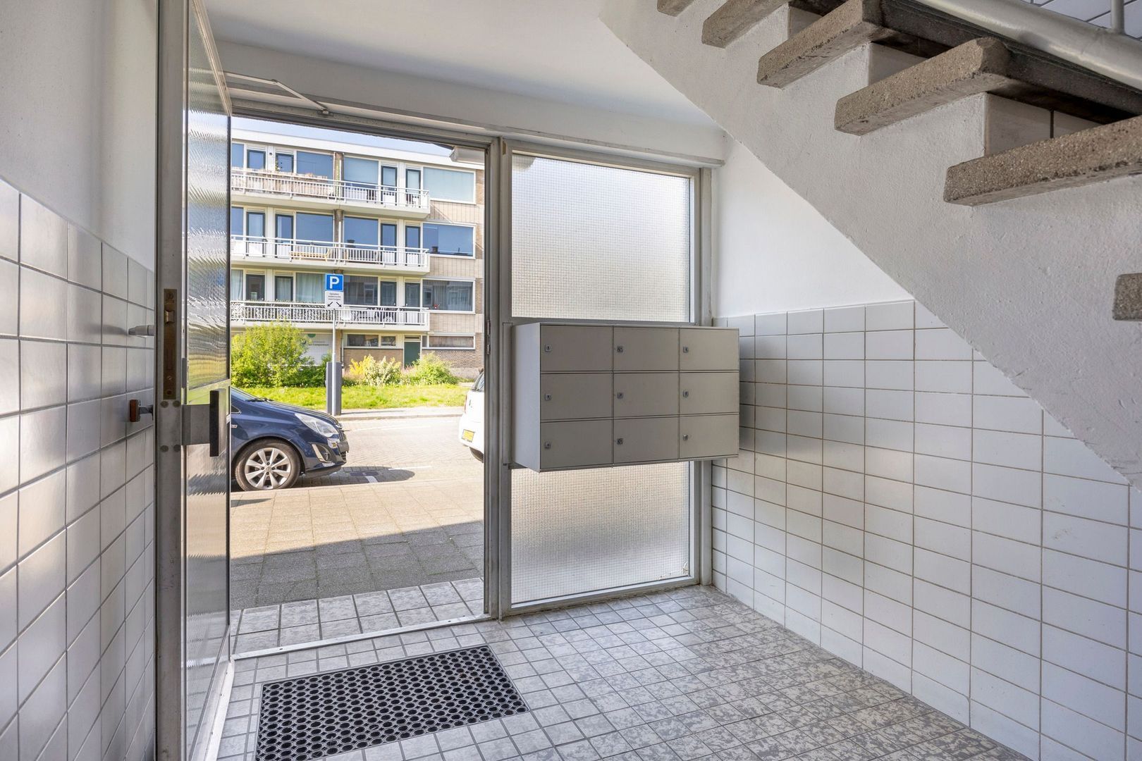 Afgesloten entree met brievenbussen en toegang tot het trappenhuis en de berging.
