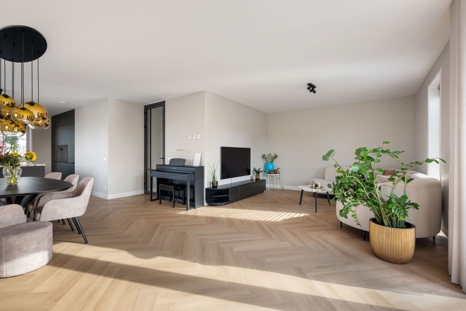 De sfeervolle woonkamer is opvallend licht en ruim, met het zitgedeelte aan de achterzijde van de woning, voorzien van een moderne elektrische haard. Aan de voorzijde bevindt zich de royale leefkeuken met een stijlvol kookeiland.