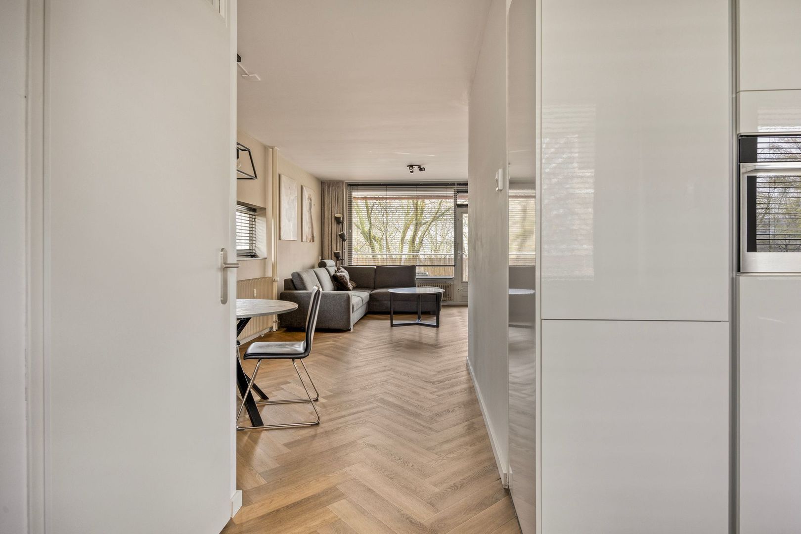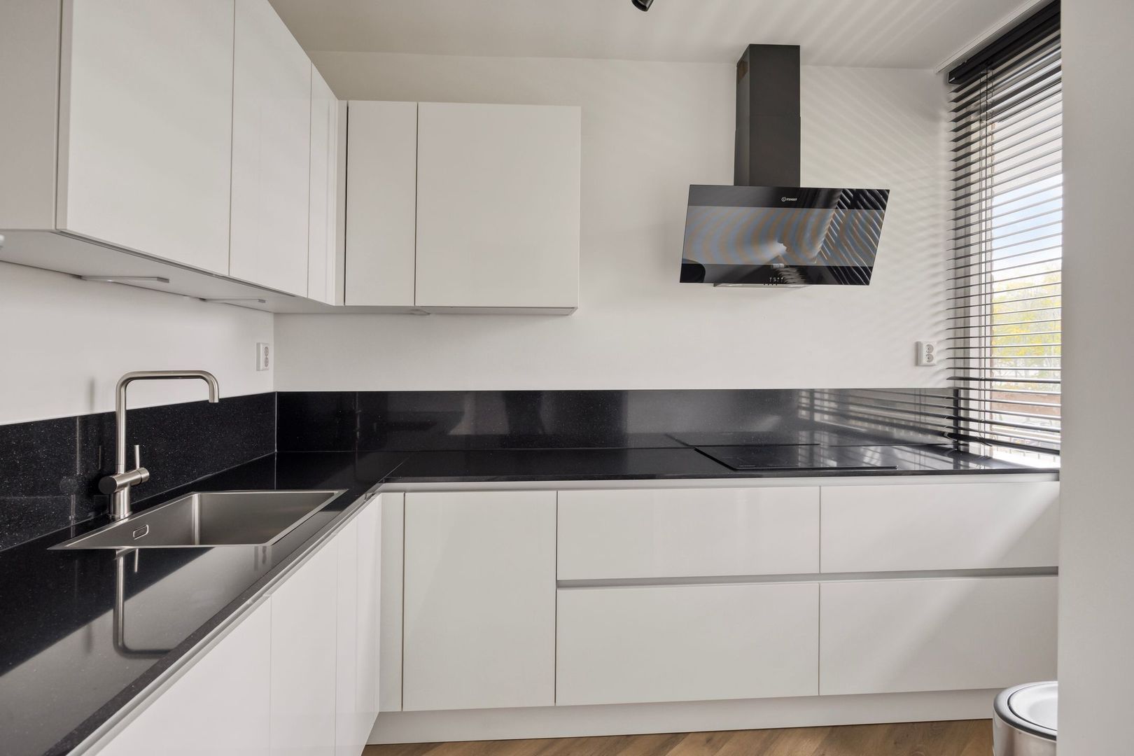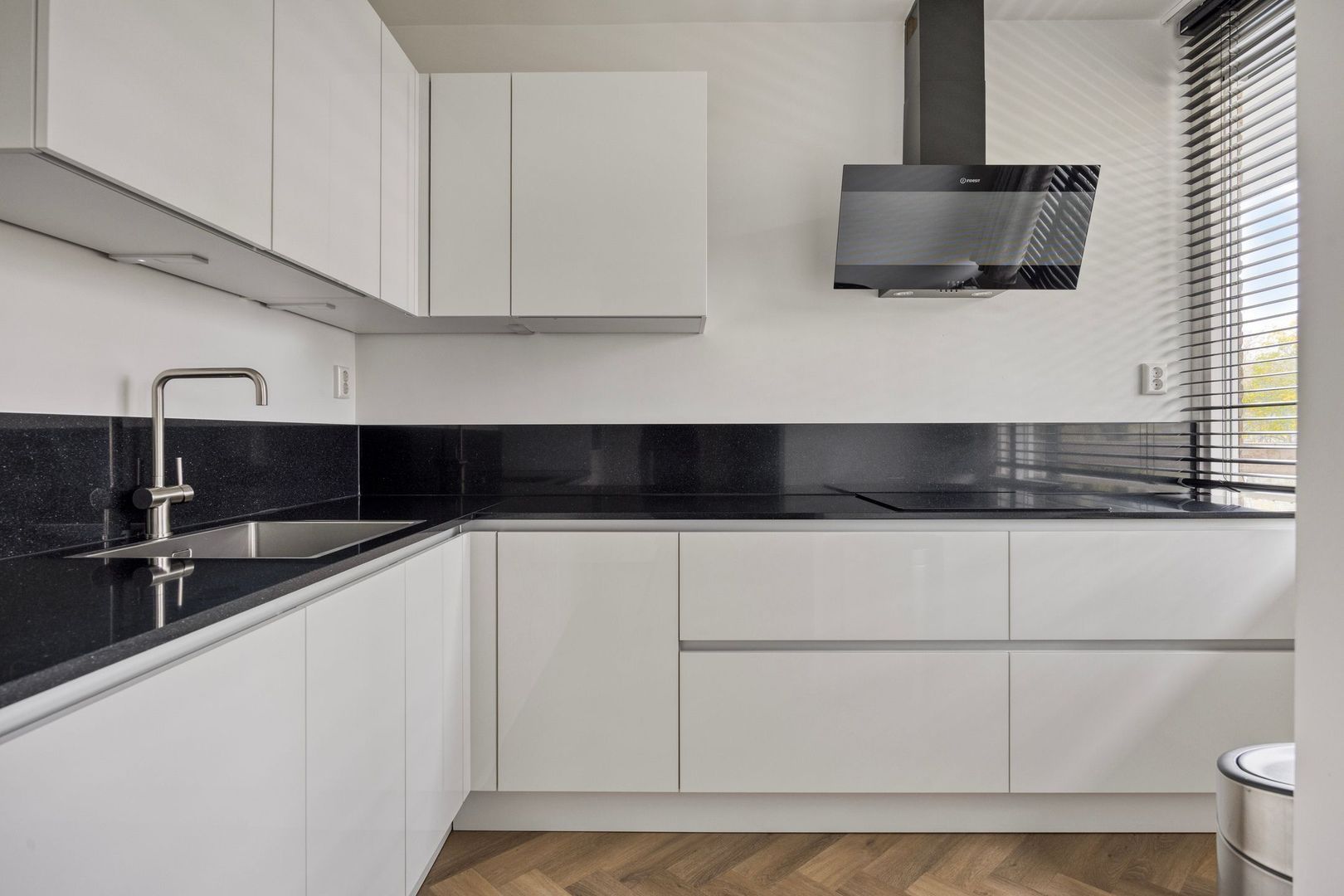 Entree/hal met meterkast. Vanuit de hal loop je door naar de woonkamer. De woonkamer is mooi afgewerkt met een PVC-visgraatvloer, die overigens door de hele woning is doorgelegd. De moderne open keuken is uitgerust met een inductiekookplaat, afzuigkap, combi-oven, vaatwasser, koel-vriescombinatie en spoelbak met mengkraan.