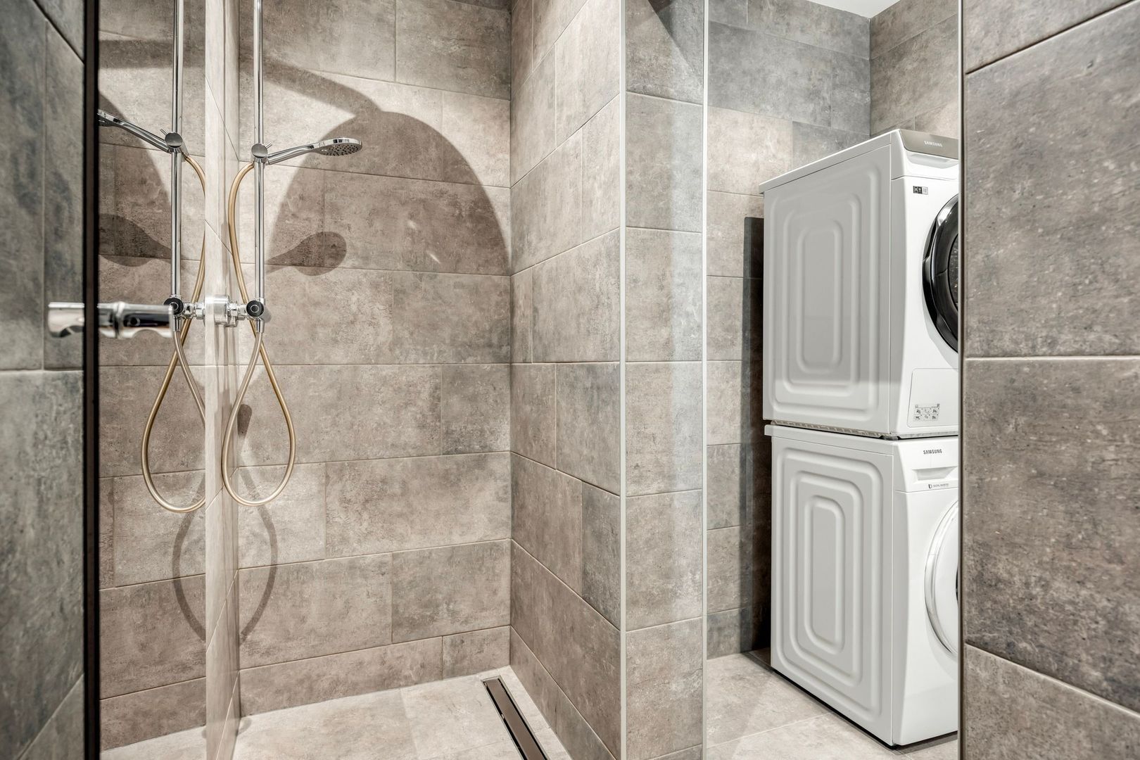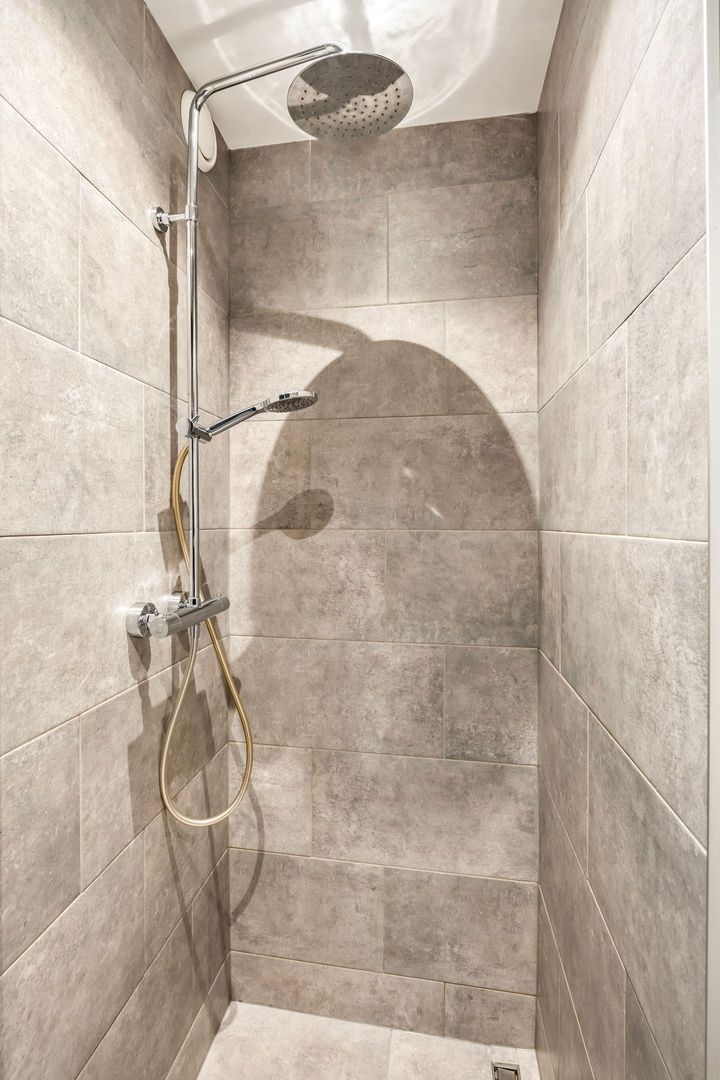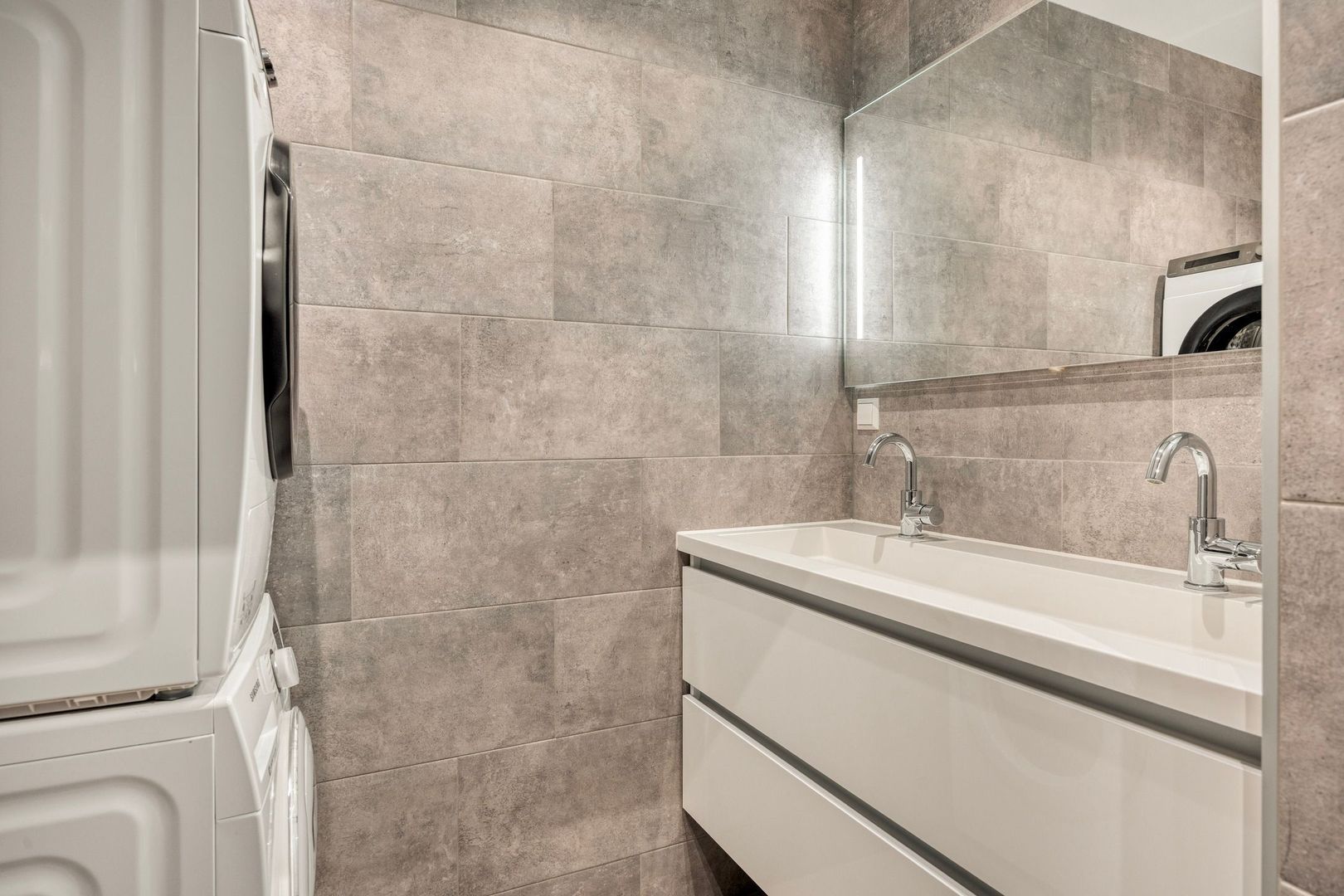 De moderne badkamer is voorzien van een douche, dubbele wastafel met meubel en een spiegel met verlichting. Hier bevinden zich tevens de aansluitingen voor de wasmachine en droger.