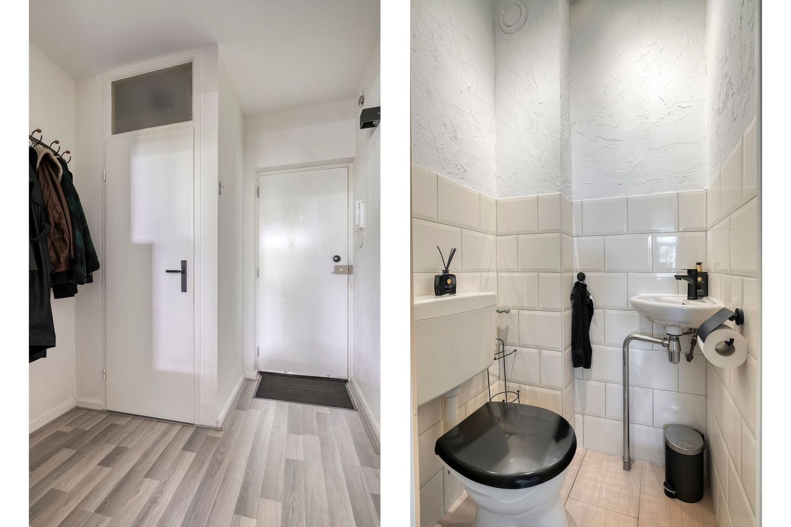 Ruime hal met meterkast (5 groepen en aardlekschakelaar) en de deels betegelde toiletruimte met closet en fonteintje.